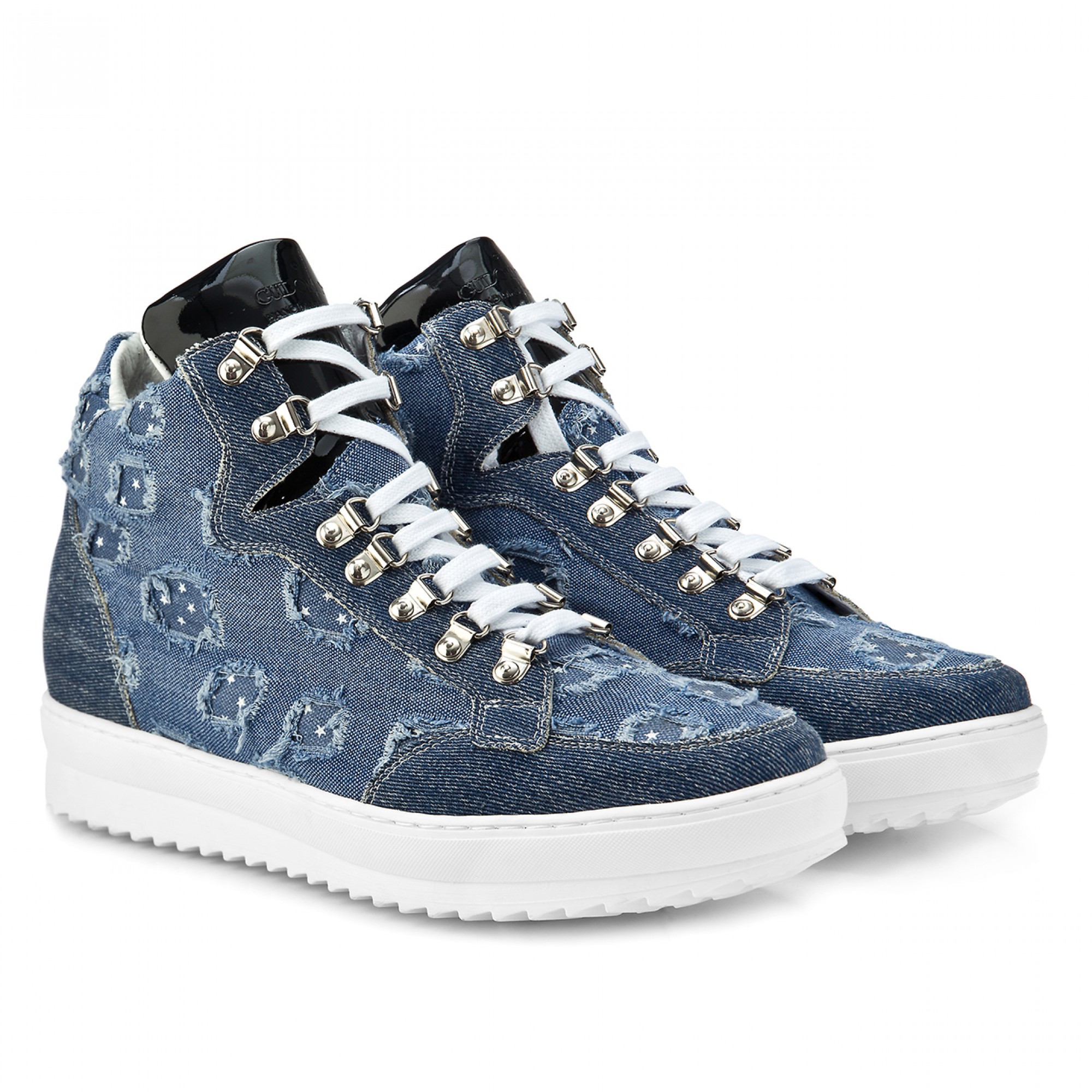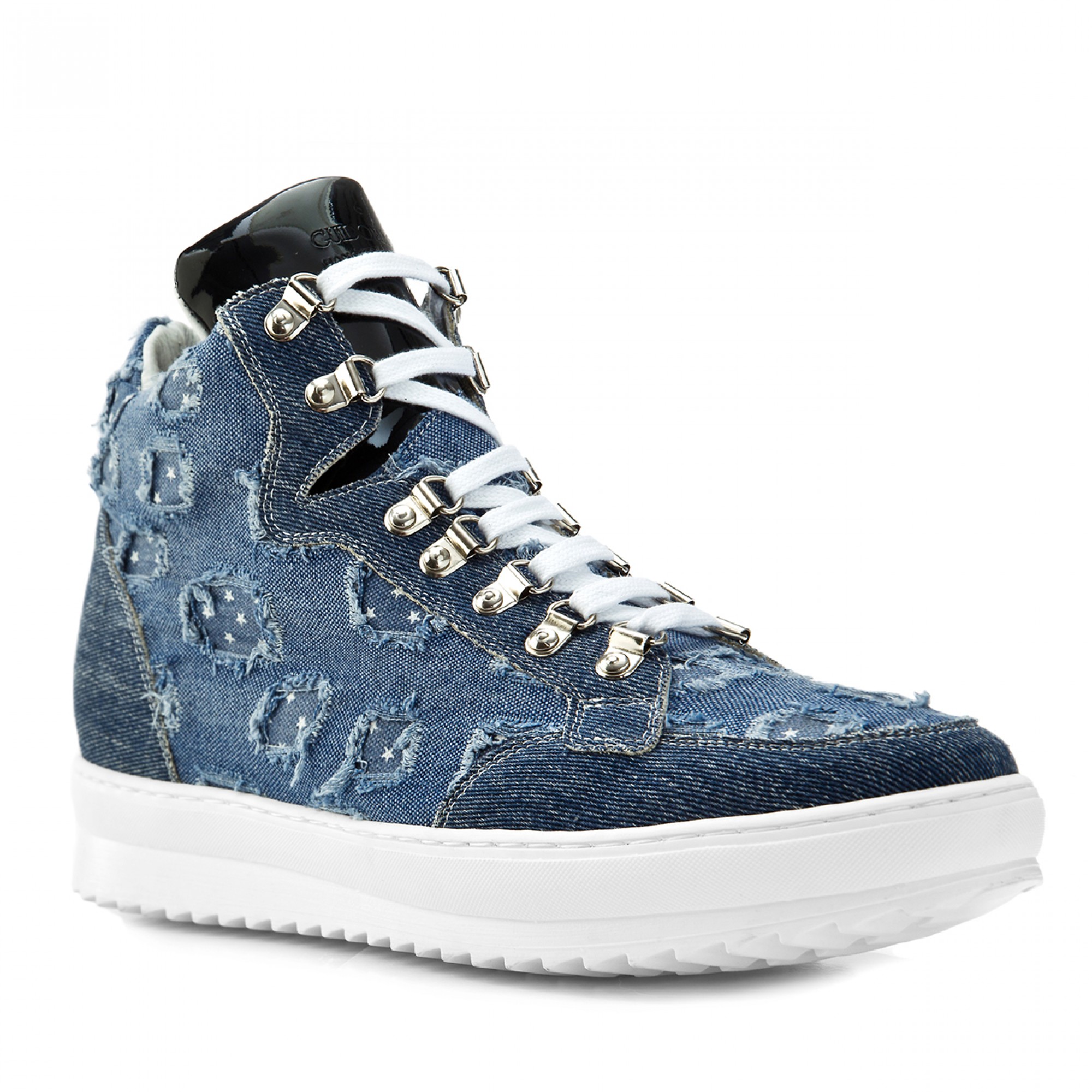 High-top elevator sneakers featuring unique upper made of two different types of jeans with stars decorating the rips and tongue in blue patent leather. The white sole is made of super light natural rubber.