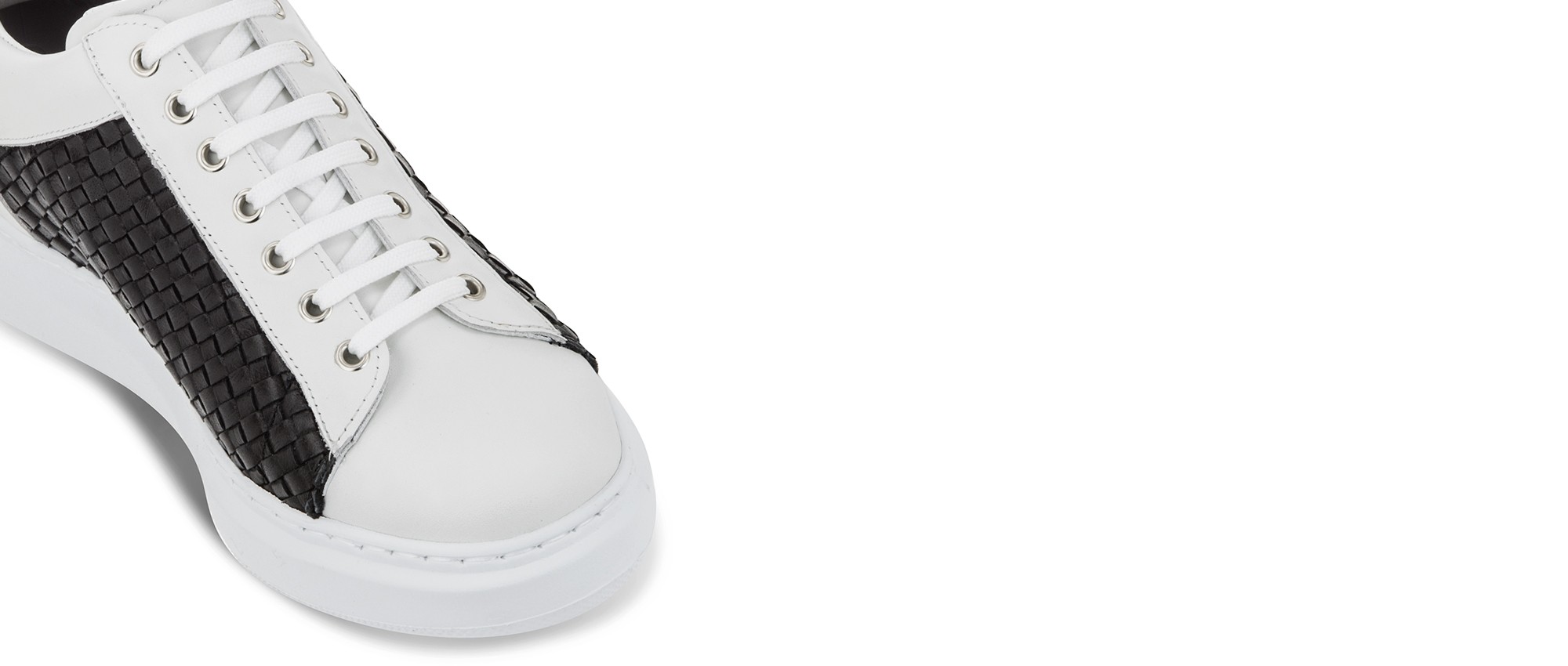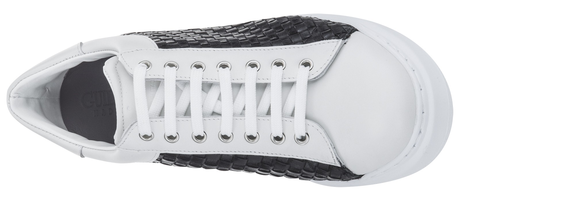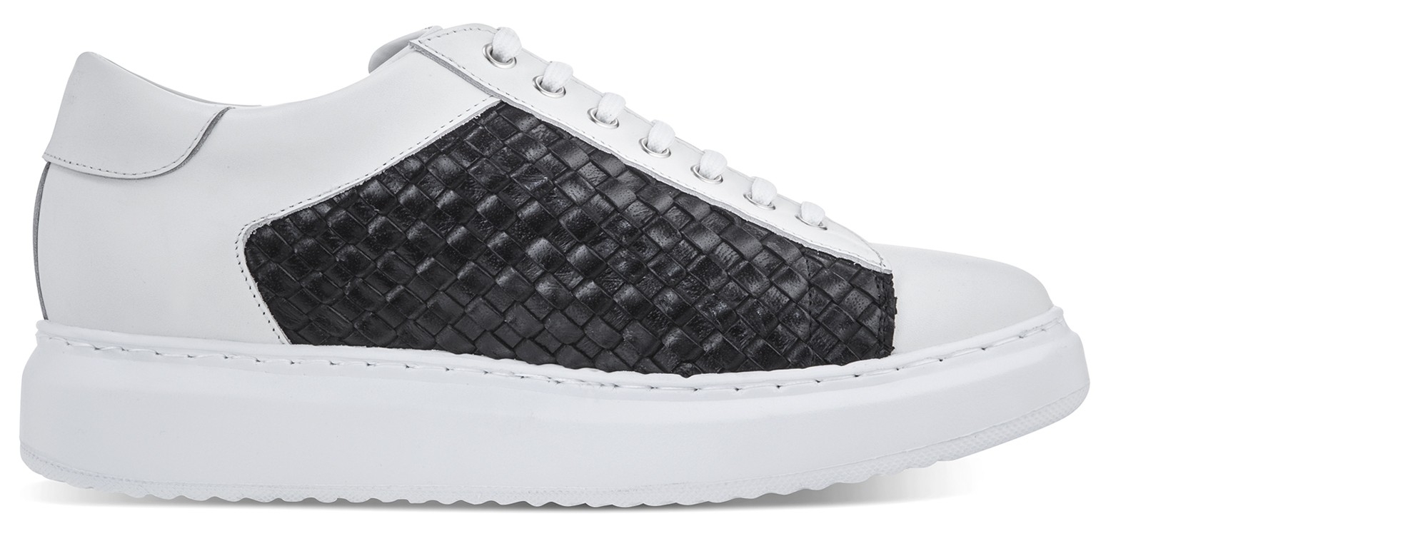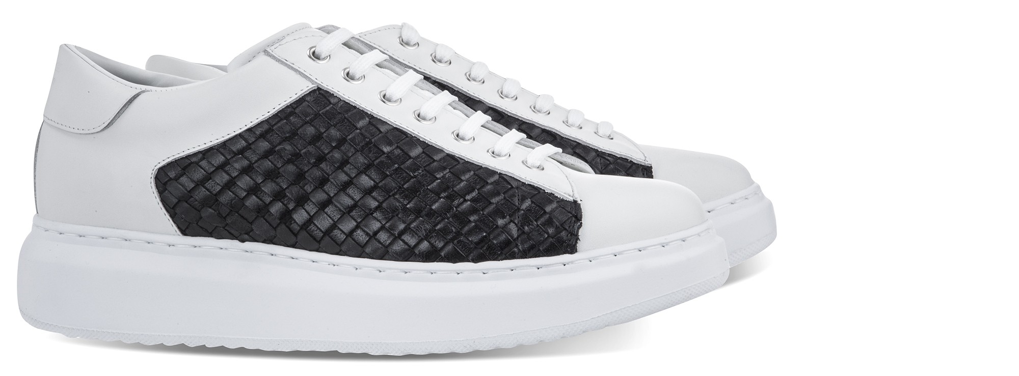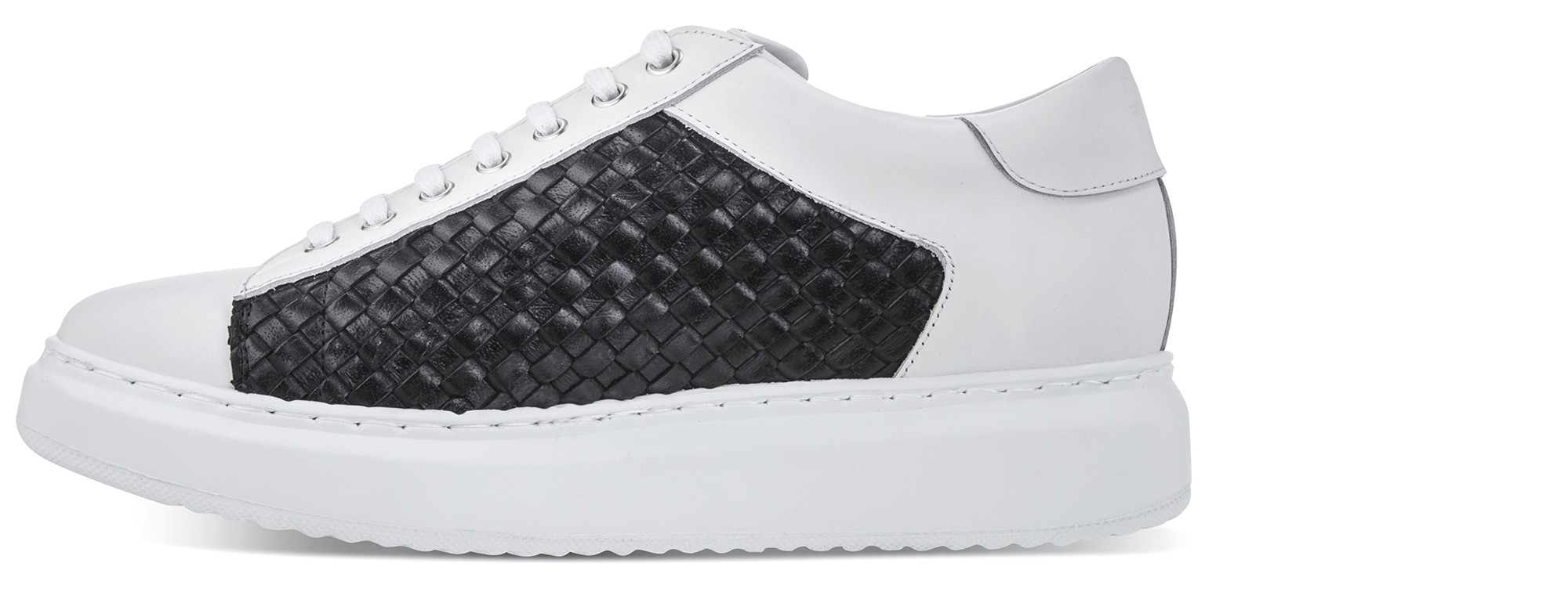 Refined and dynamic. GuidoMaggi presents a unique elevator sneaker featuring an upper in white full-grain leather and handwoven black calf leather. The white sole is in natural rubber. Versatile and suitable for any seasonal outfit, Dolciano adds up to 3.1 inches (8 cm) of extra height in maximum comfort. Handmade in Italy.