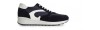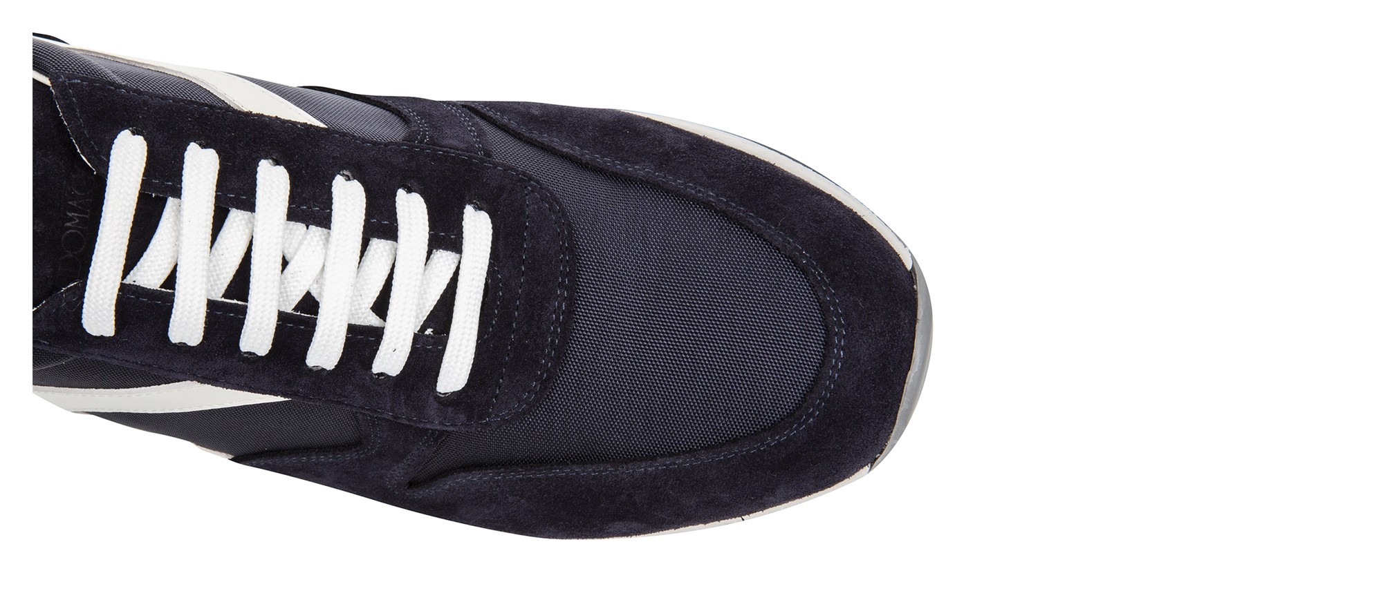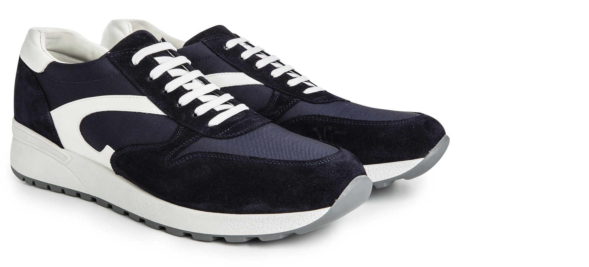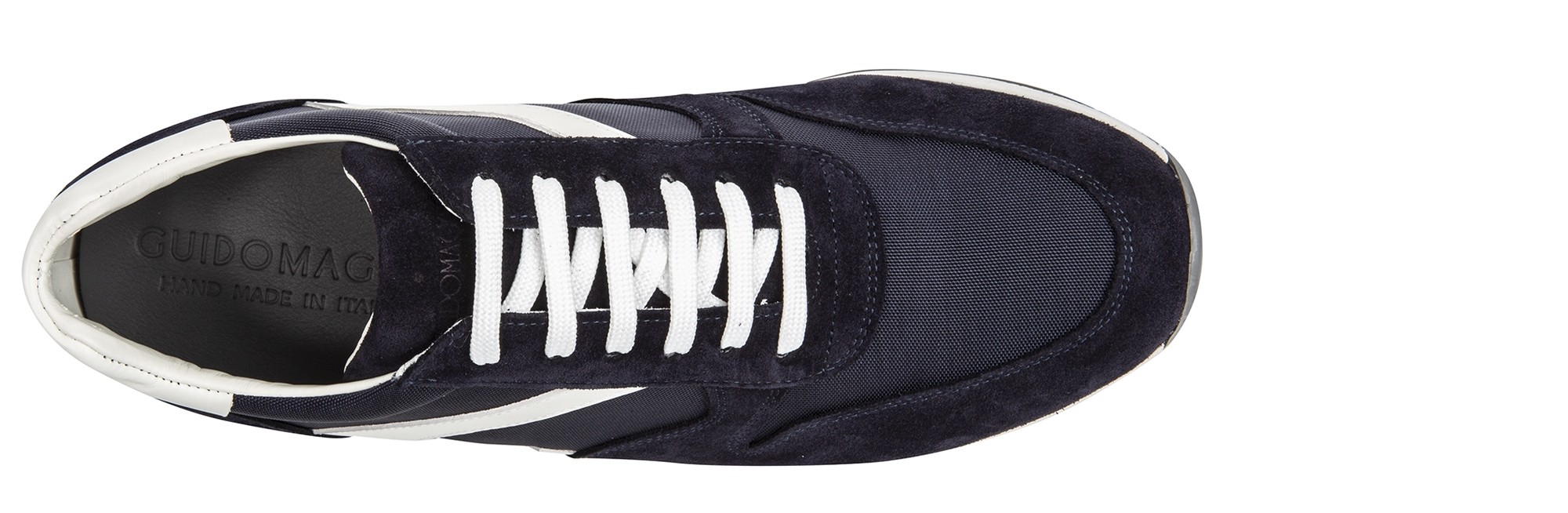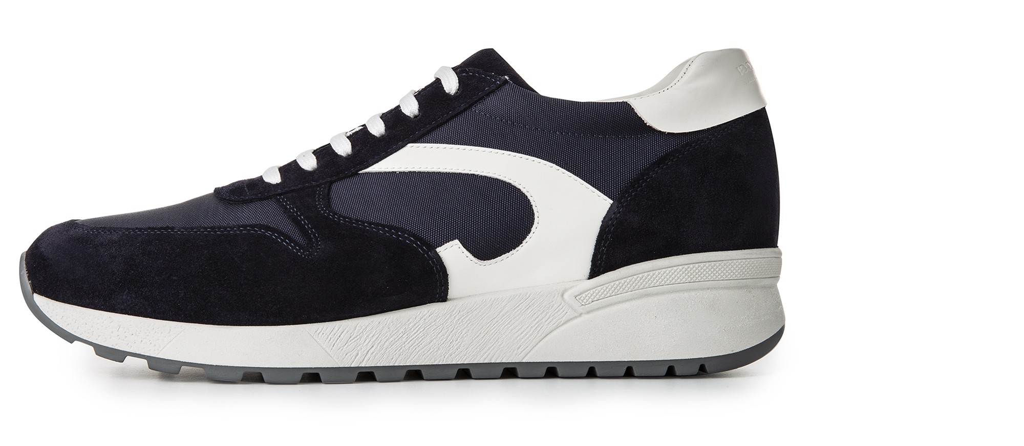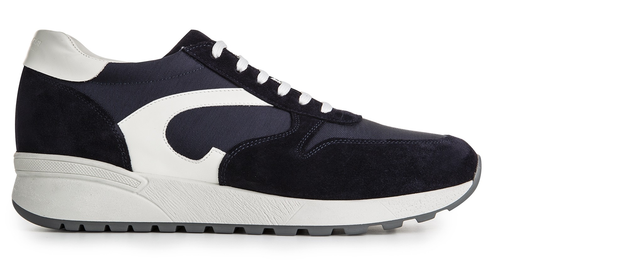 Handcrafted elevator sneakers, street style inspired with upper in blue suede calfskin, blue technical fabric and white full grain leather details on the sides and heel tab.