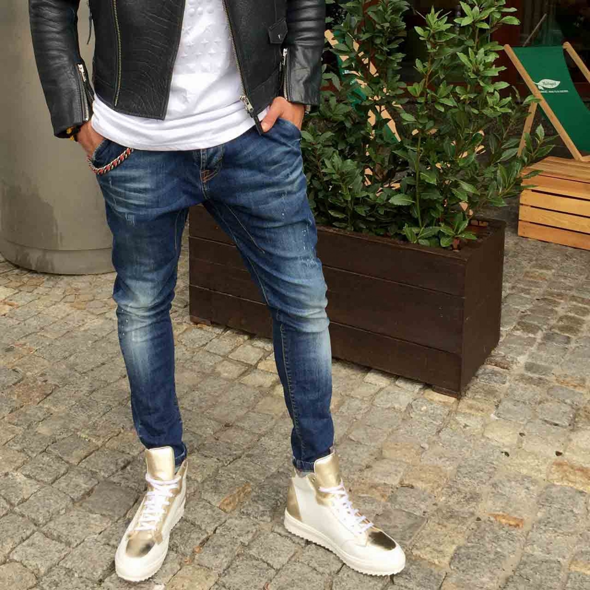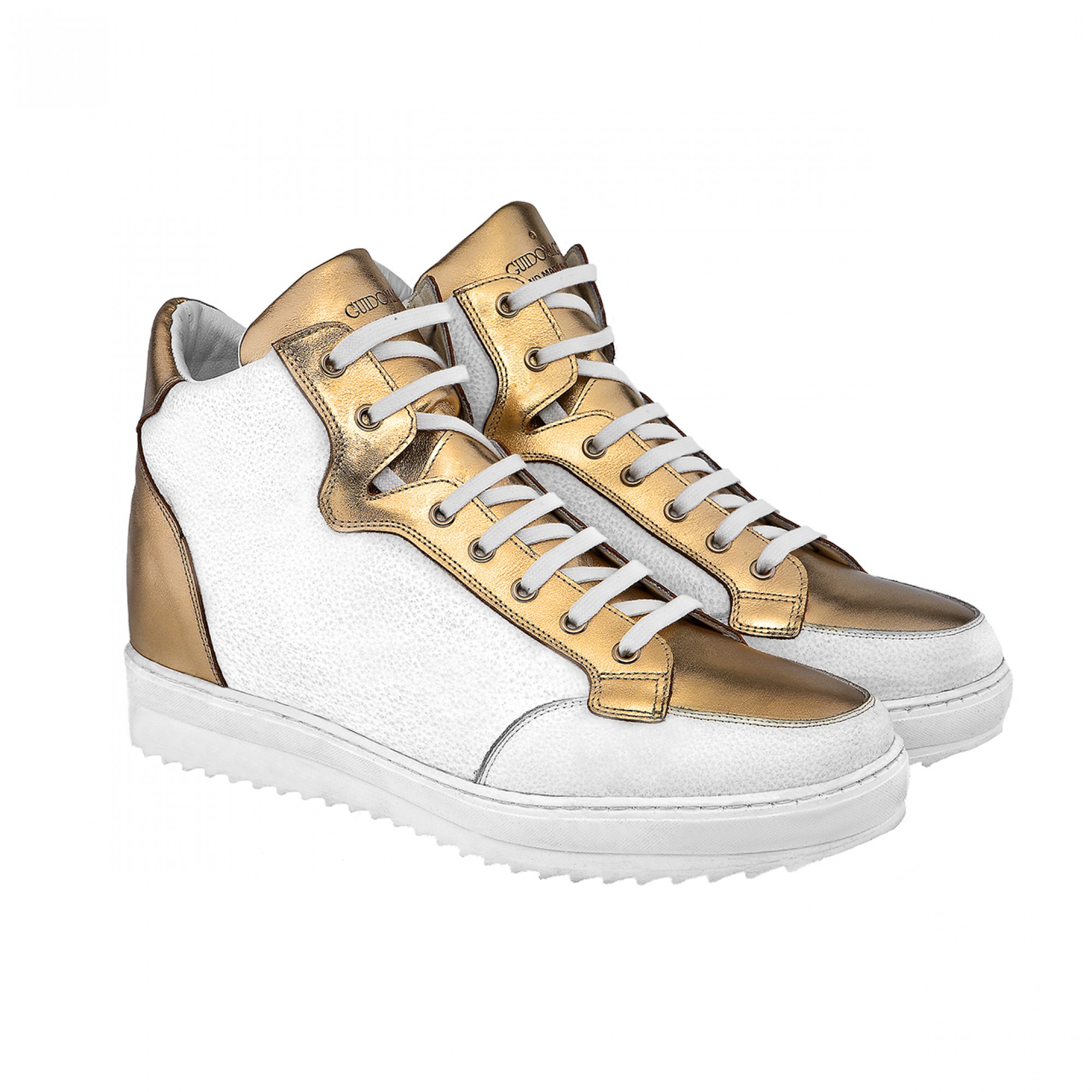 Upper in white full grain leather with details in golden calfskin. Lining in soft goatskin. Insole in genuine leather. Lightweight high quality rubber outsole anti-slip. Height increase: 2.4in(6cm), 2.75in(7cm), 3.1in(8cm) or 4 in(10cm). Hand Made in Italy