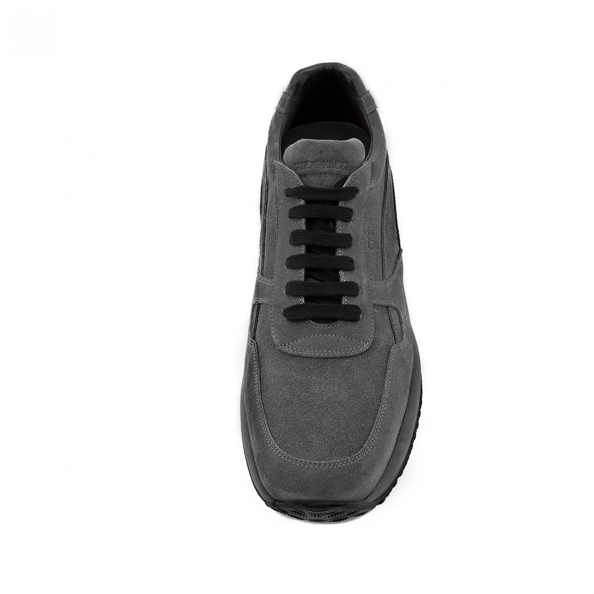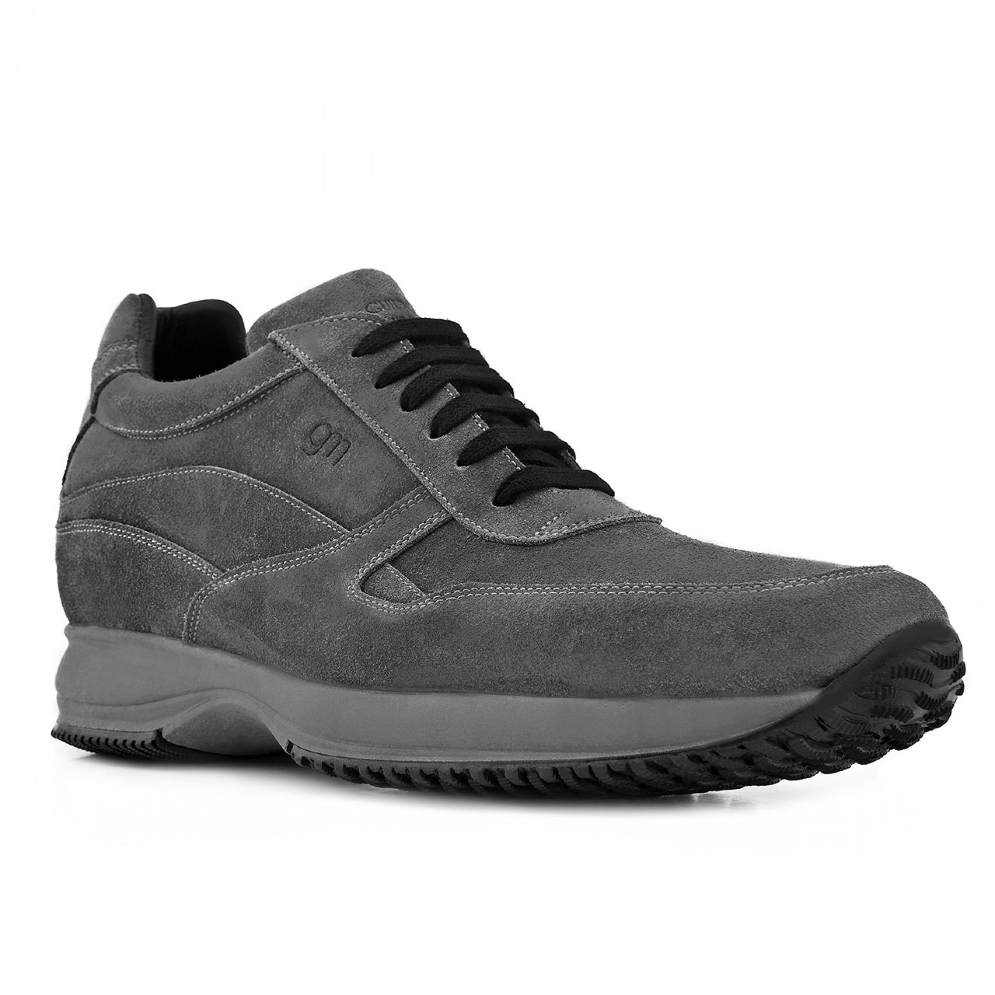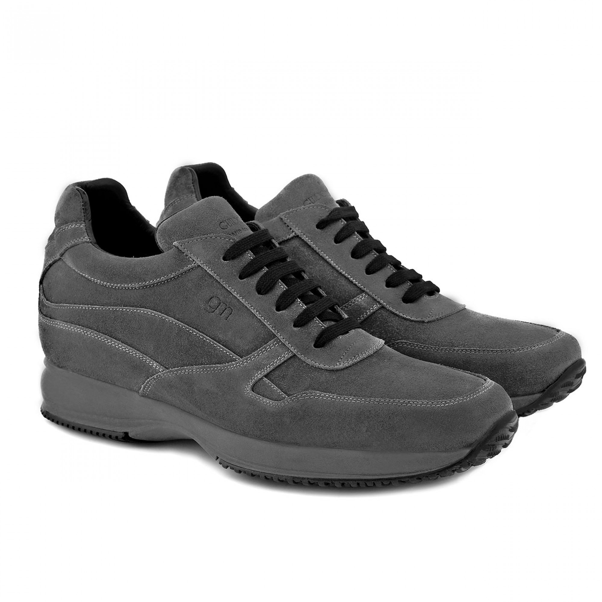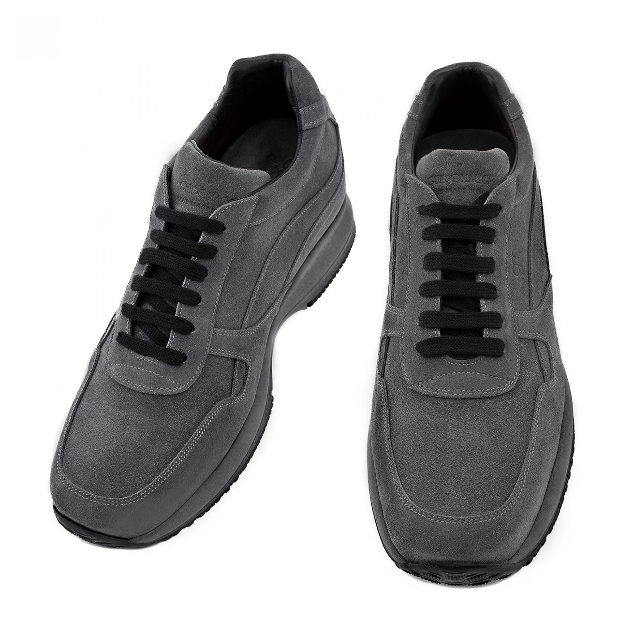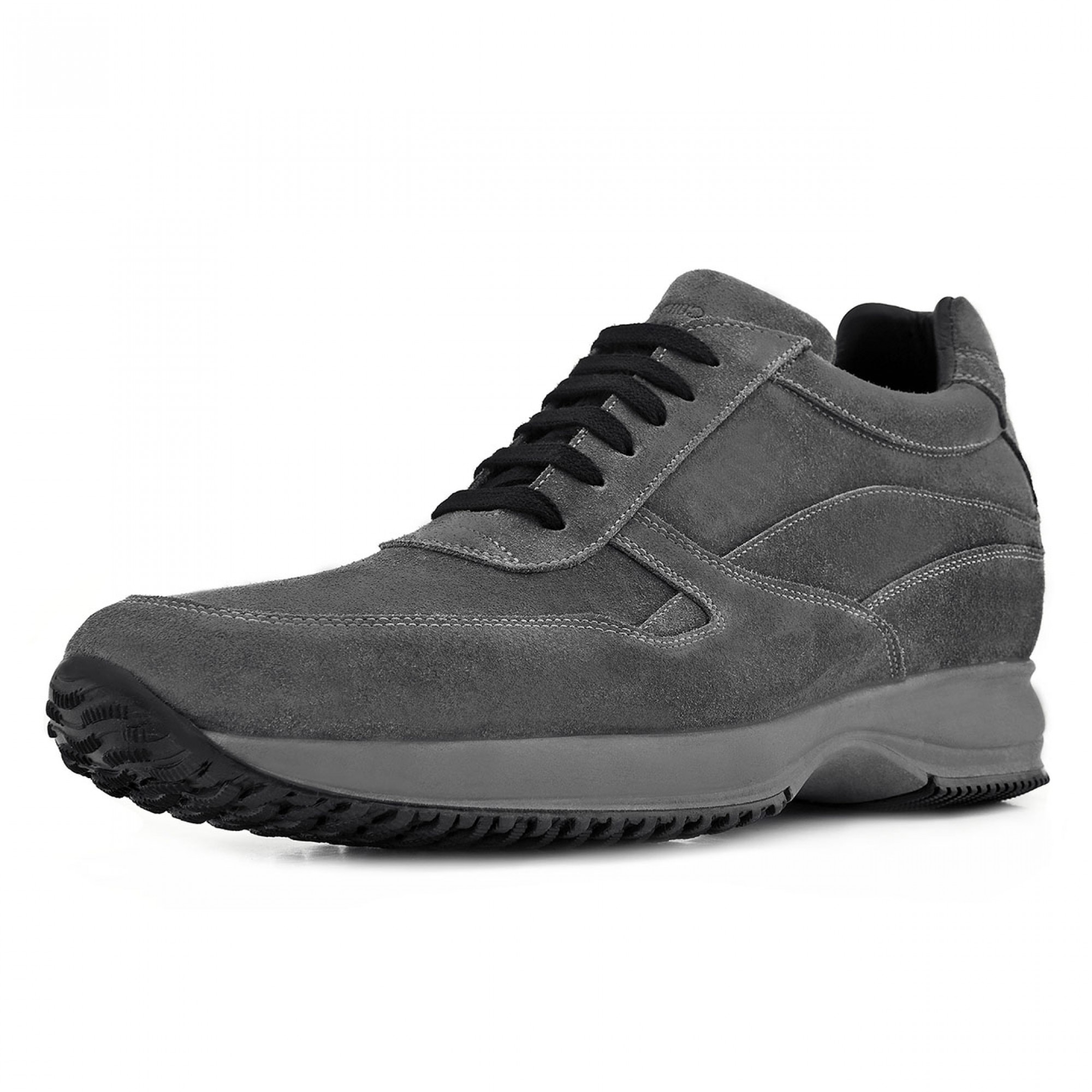Handcrafted elevator sneaker in velvety gray calfskin suede and tone on tone outsole in 100% natural rubber.