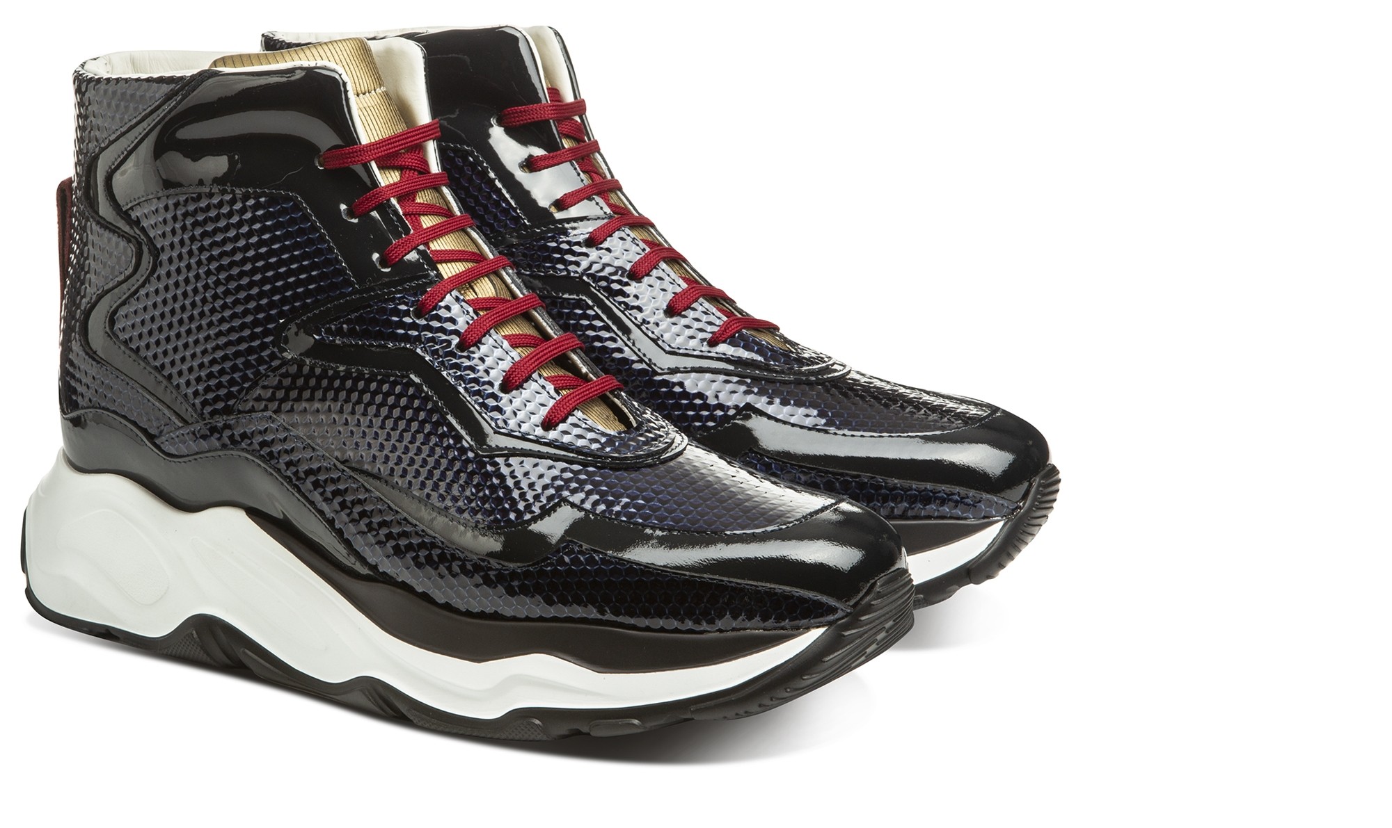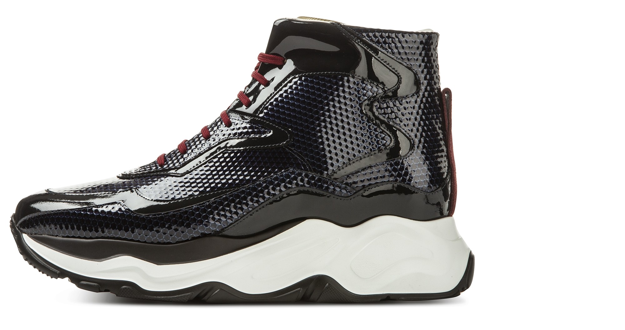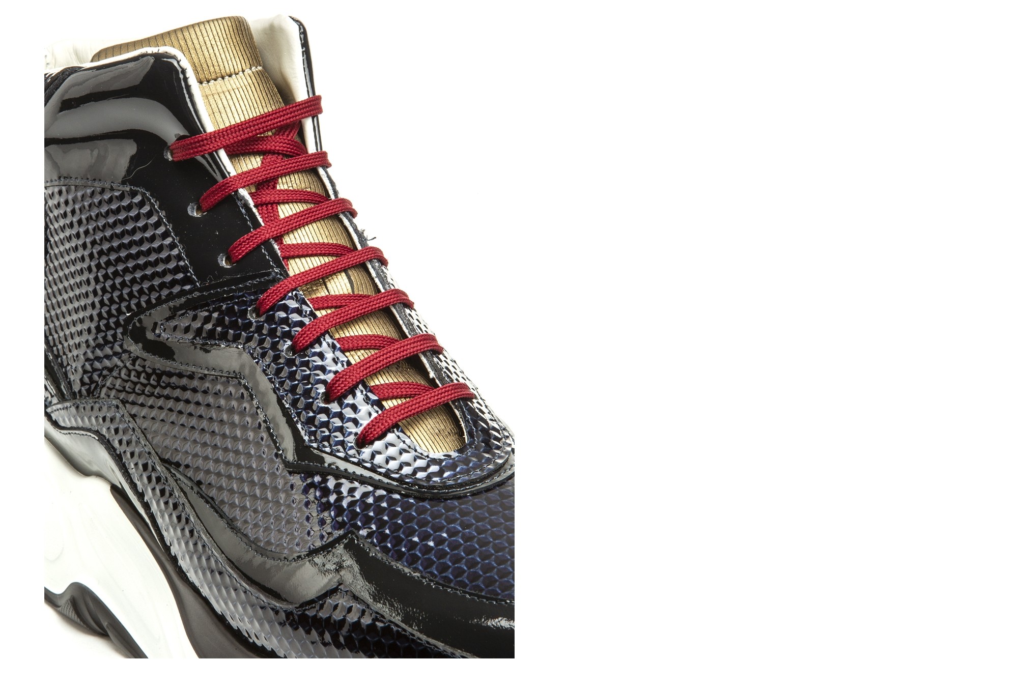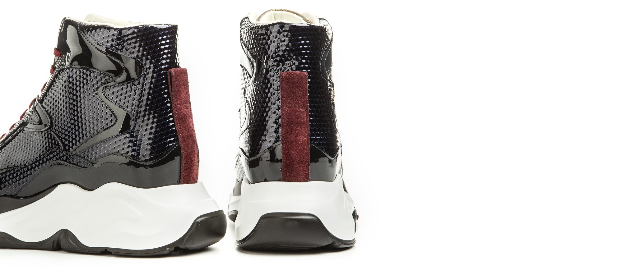 The GuidoMaggi spring-summer collection is enriched with these new hi-top sneakers. The upper is entirely in patent leather featuring different textures and shades, from smooth black to blue with a diamond effect. A super-light rubber sole and tongue in a golden carved effect Tuscan leather.