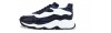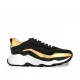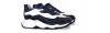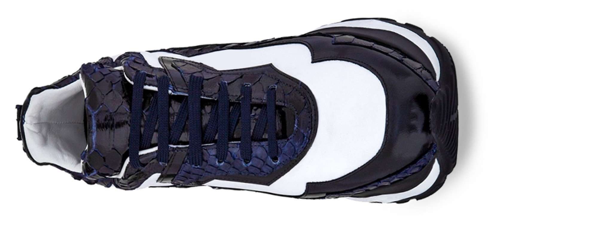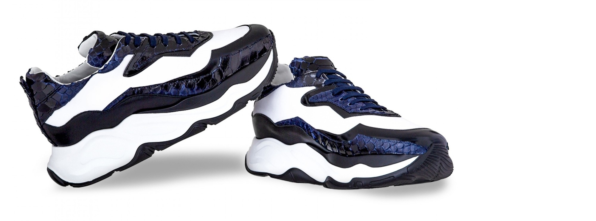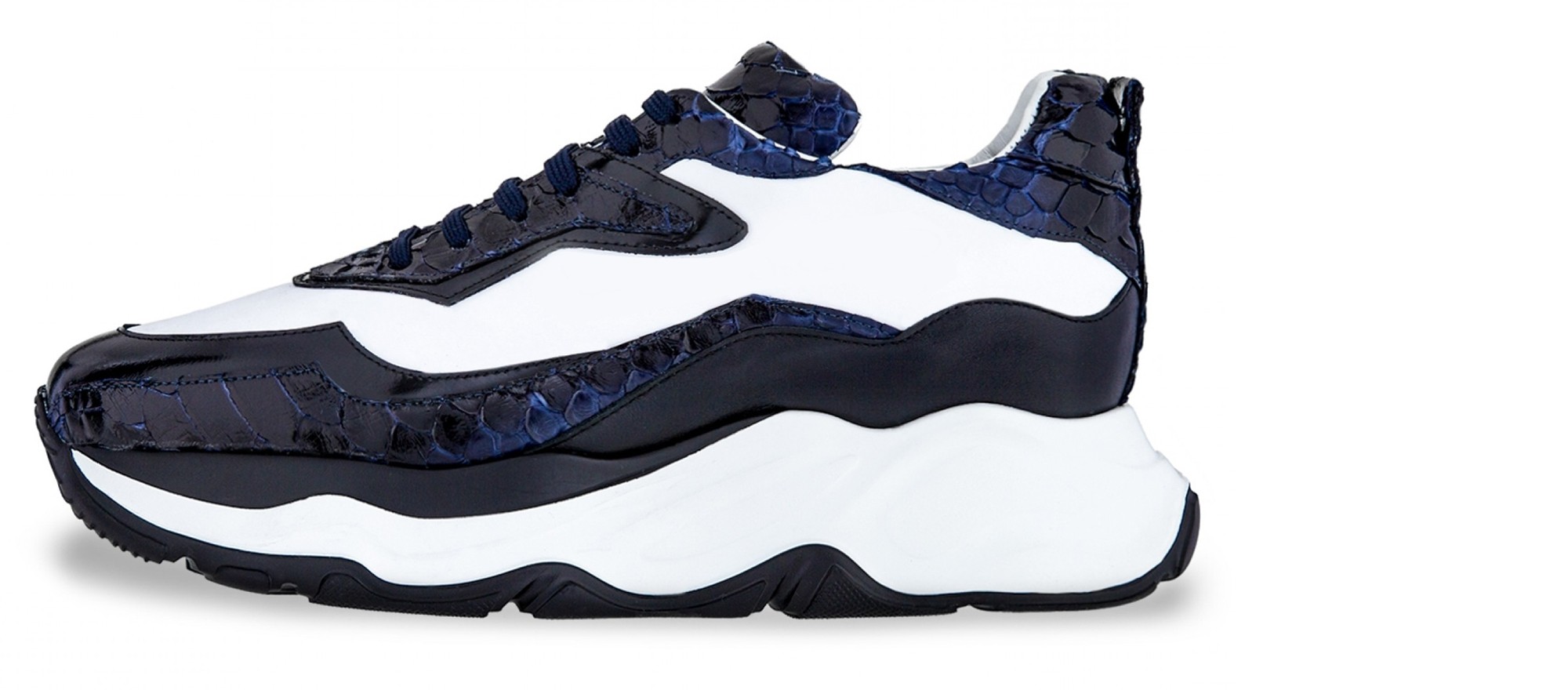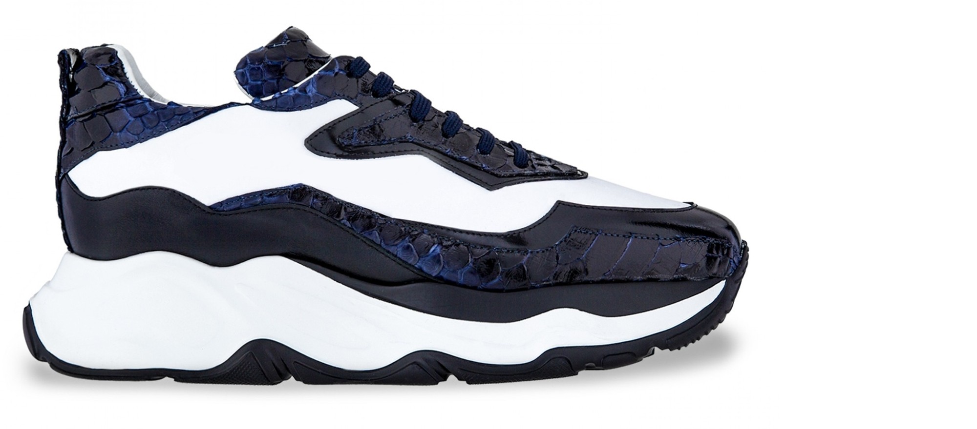 Sporty chunky elevator trainers made using four different fine leathers: python skin featuring unique black and blue hues, black shiny calfskin, black full grain leather and white rubberized calf leather. The two-tone sole is made of super-light rubber.