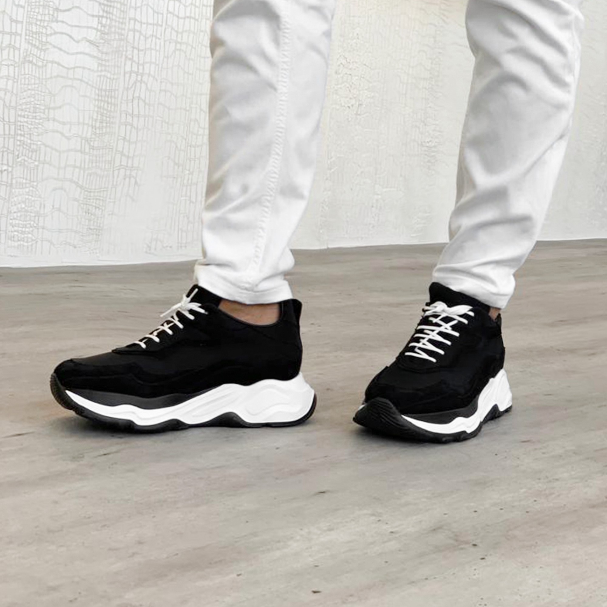 Back in black: elevator chunky sneakers with upper made of black breathable technical fabric and tone on tone suede. The two-tone sole is in extralight rubber.