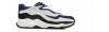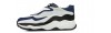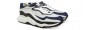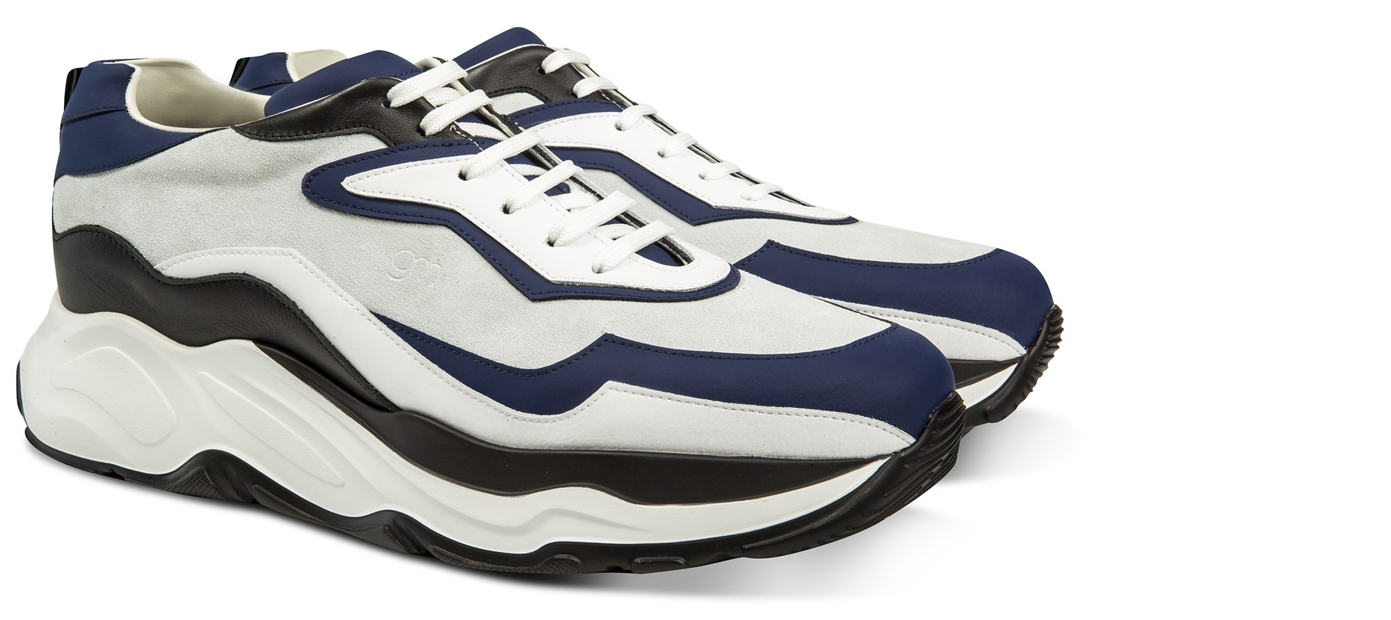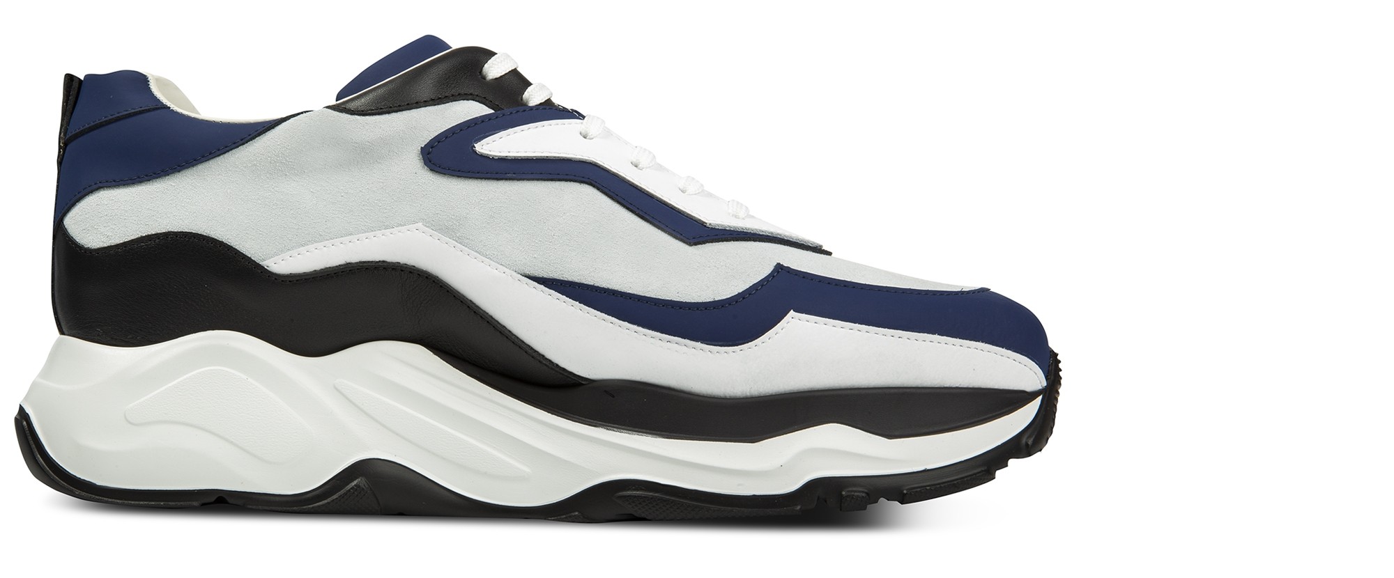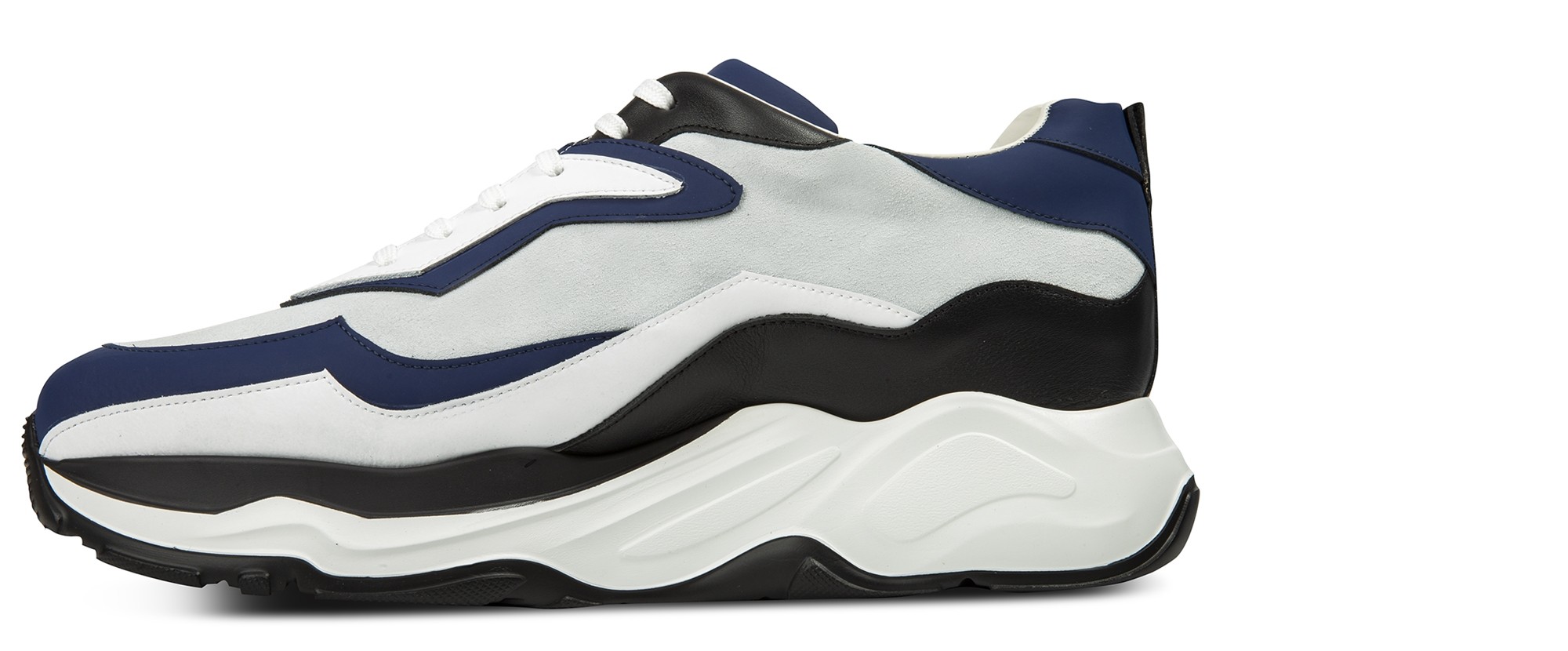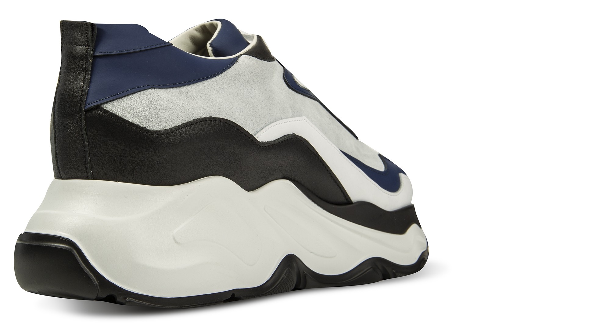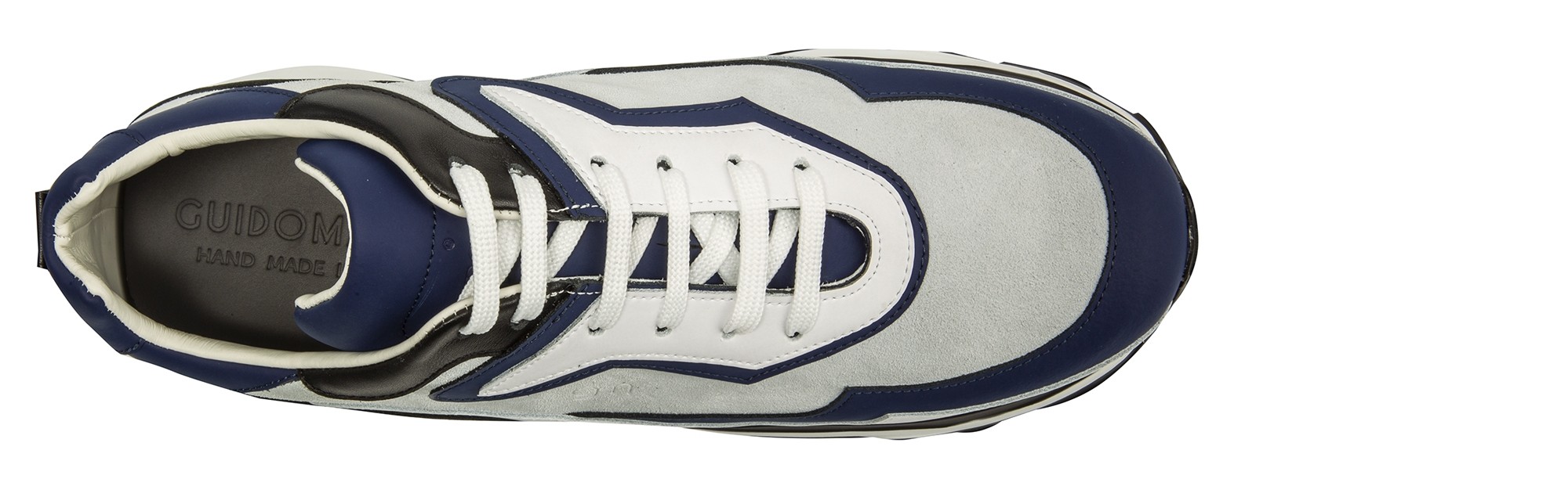 Elevator sporty shoes with an urban style featuring upper made of blue and white rubberized calfskin, black full grain leather and ice gray suede.