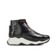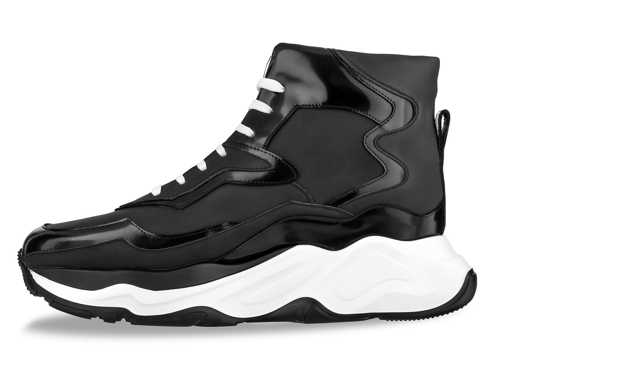 High top chunky elevator sneakers with a street style inspiration made of black rubberized and shiny calf leather. The white and black sole is in extralight rubber.