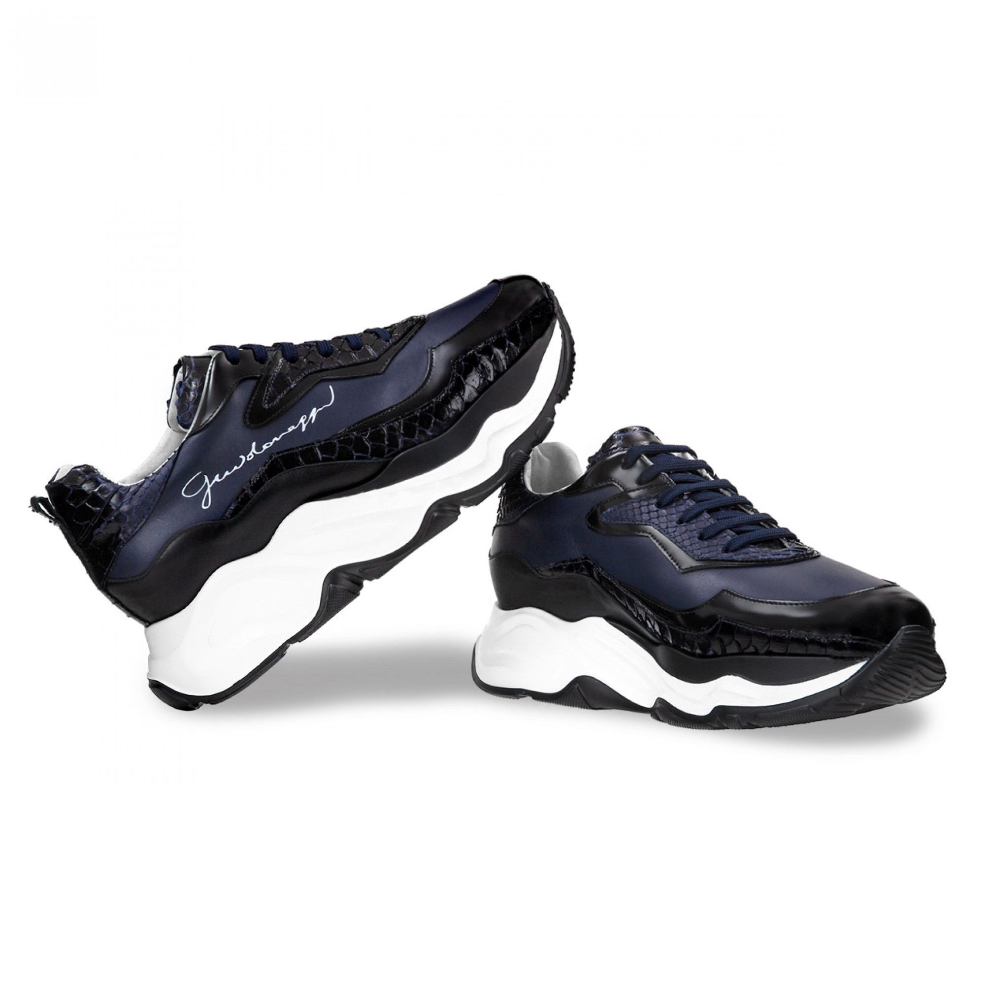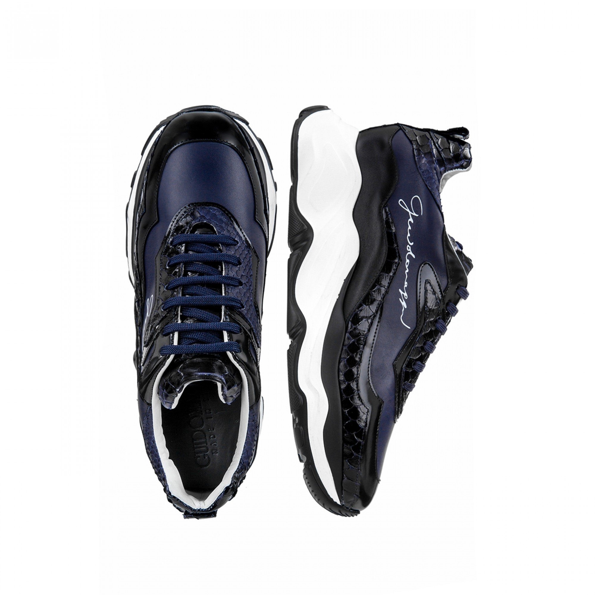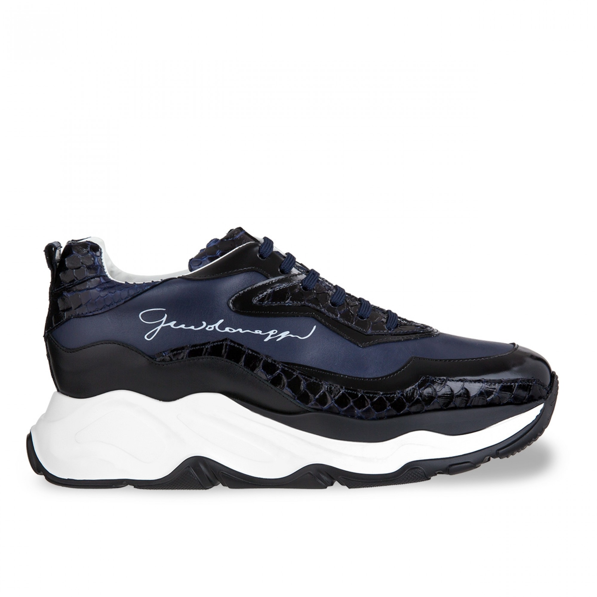 Luxury casual chunky sneakers handcrafted using four different fine leathers: blue python leather featuring iridescent black reflections, black shiny calfskin, blue and black full-grain leather. The two-tone sole is in extralight rubber.