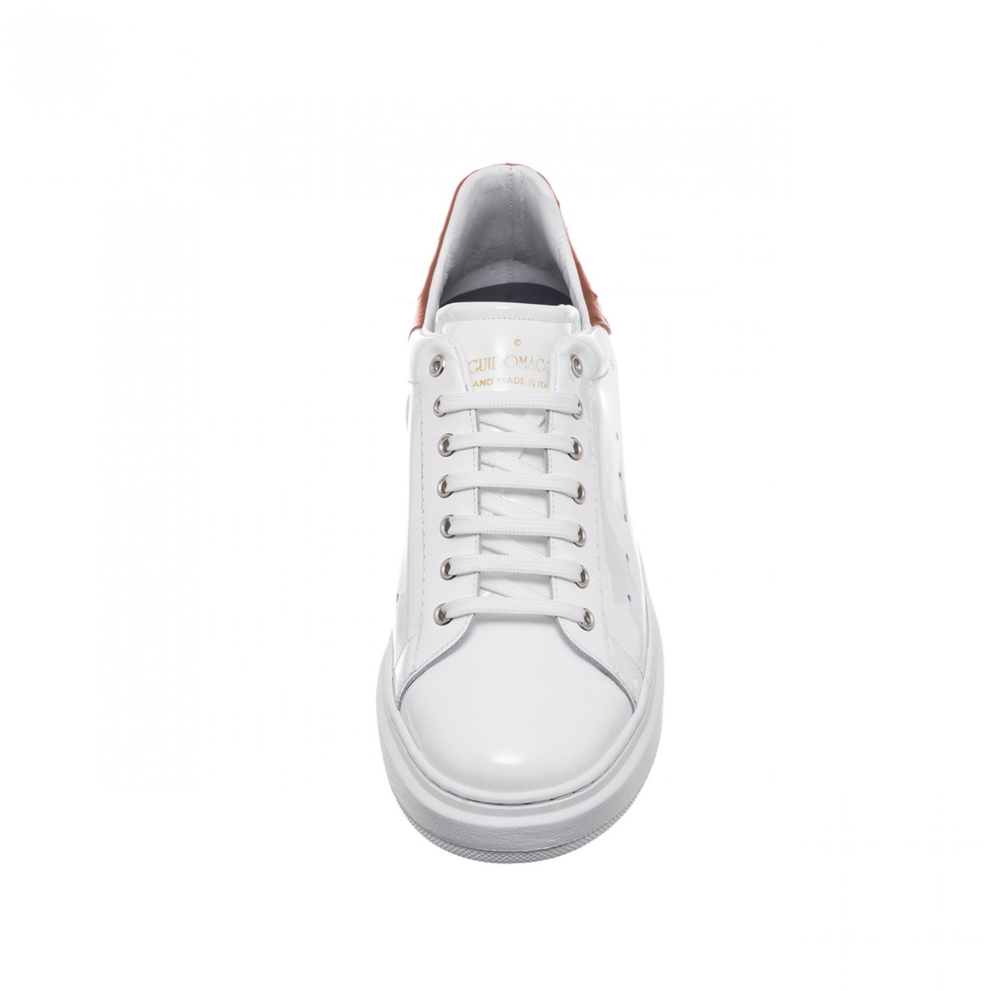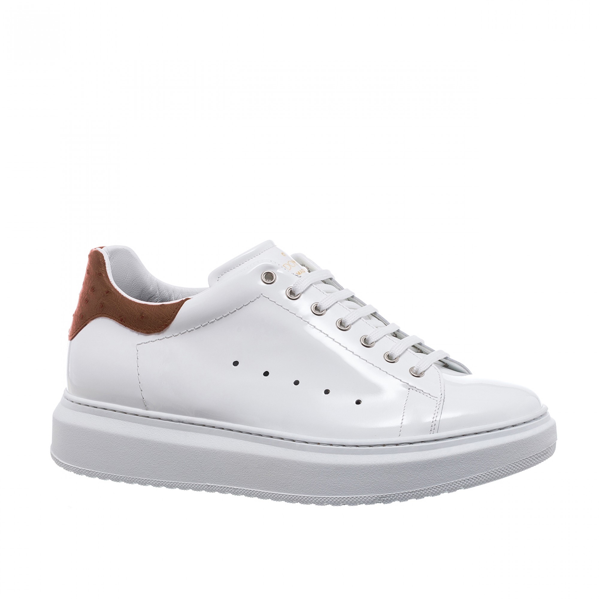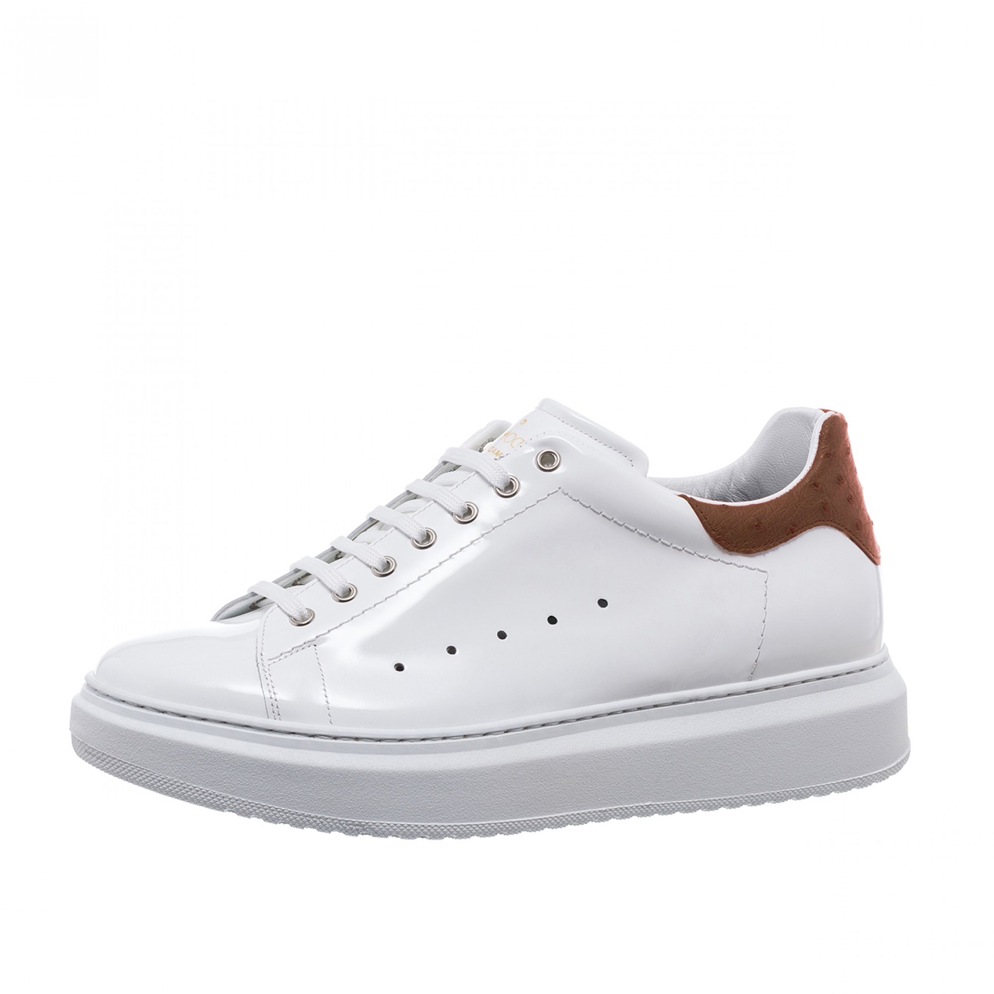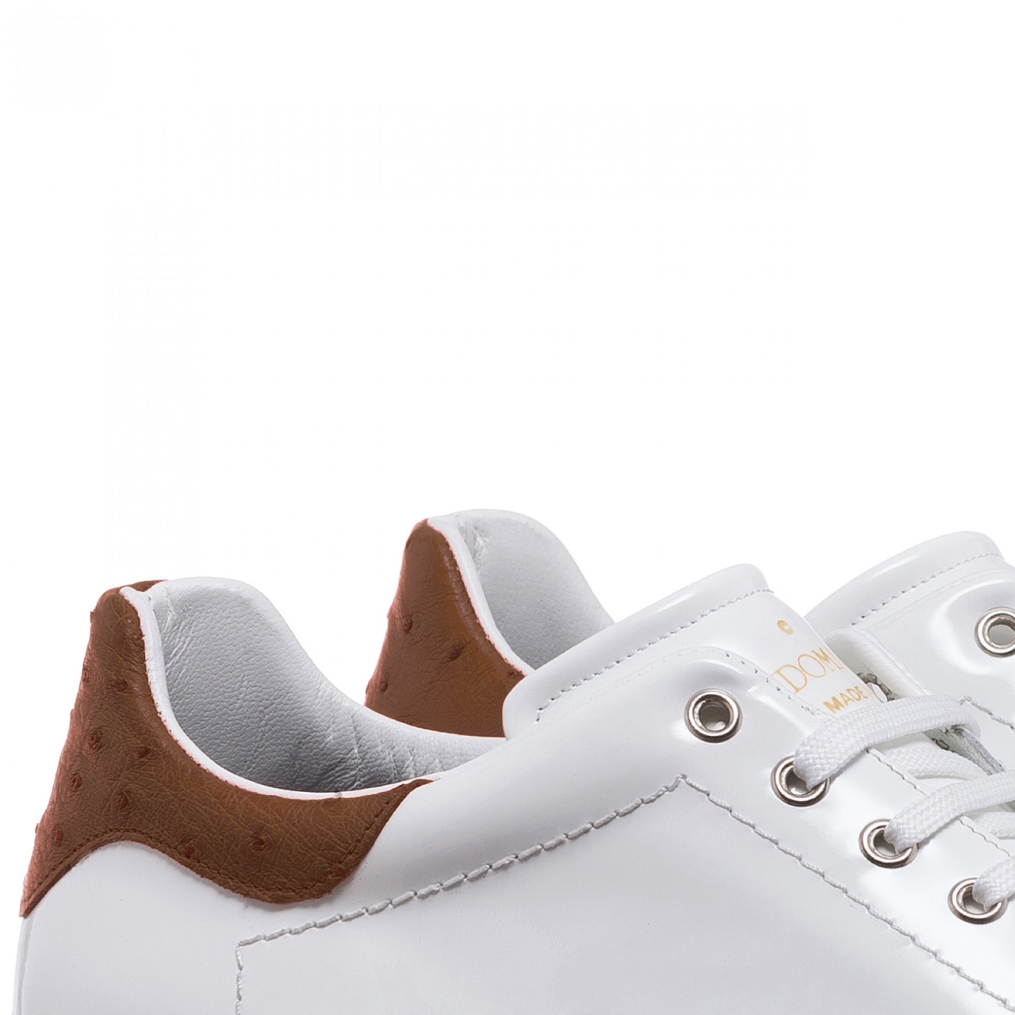 Sneakers able to add from 2.4 inches (6 cm) up to 3.1 inches (8 cm) to your height, featuring upper in white patent leather embellished with details in brown ostrich leather on the heel tab. The sole is made of natural rubber.