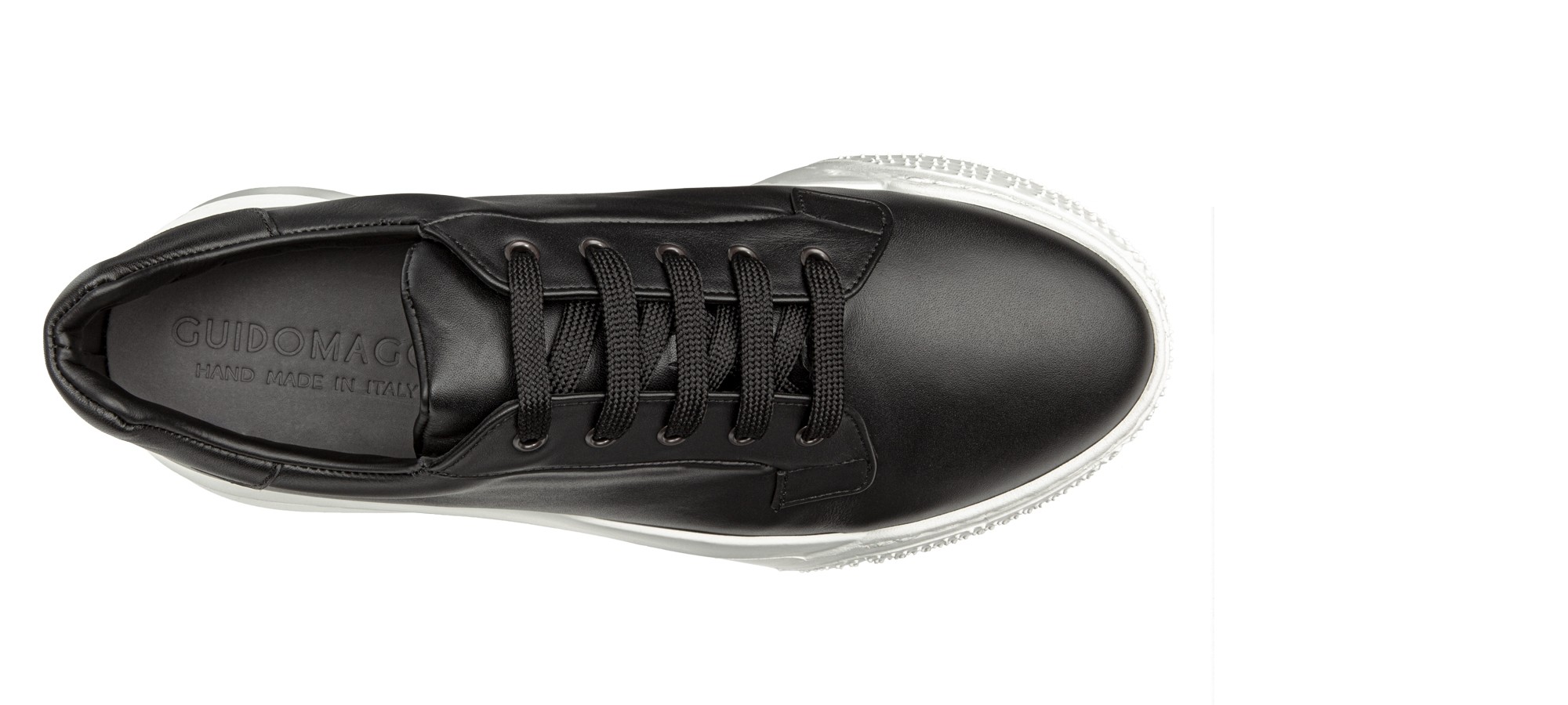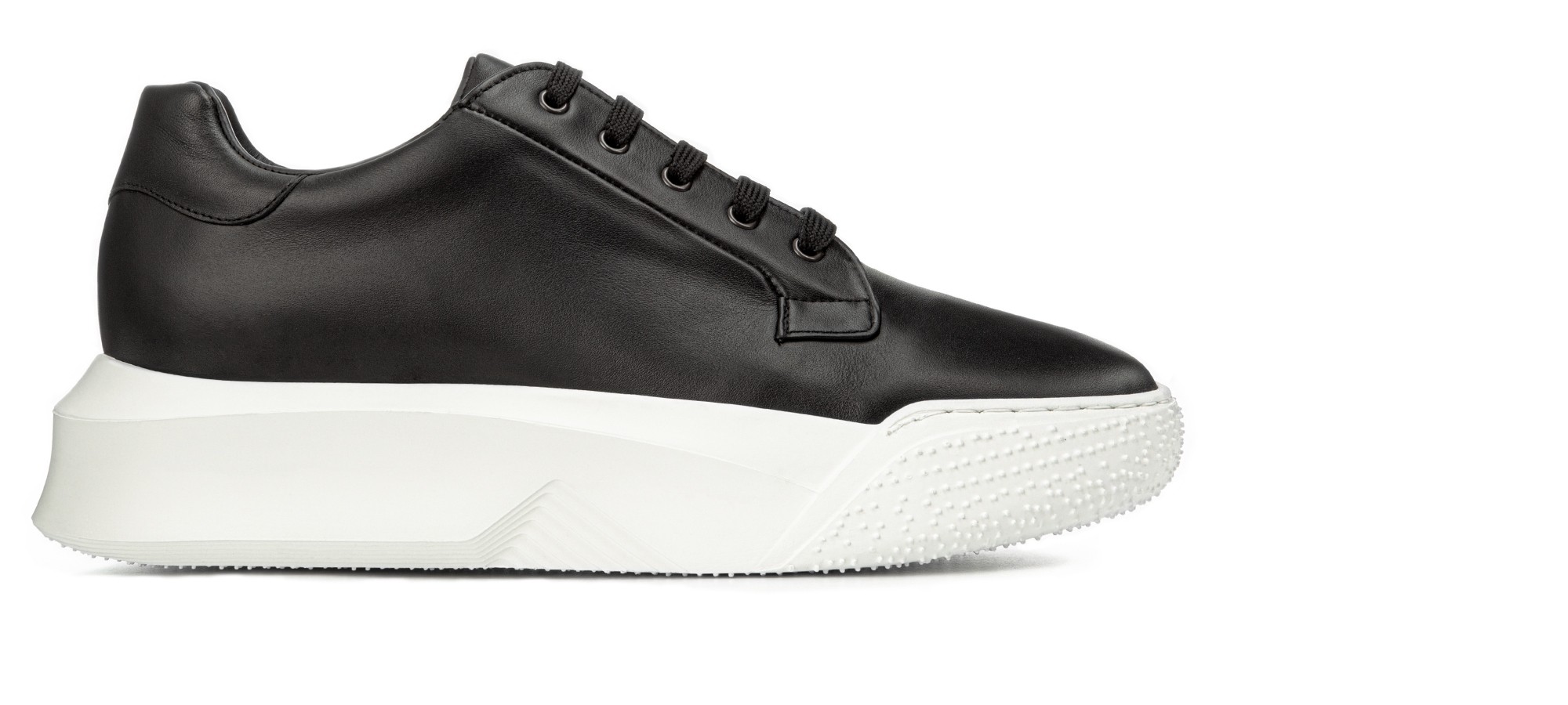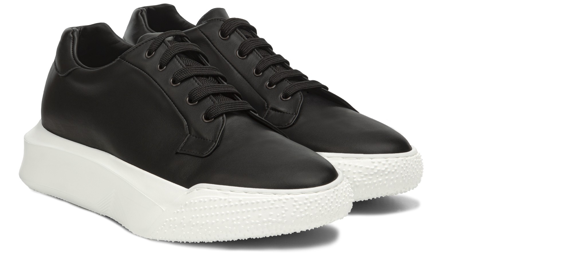 Elevator chunky sneaker able to increase height up to 4 inches (10 cm) in absolute comfort. The upper is in black full-grain leather with tone-on-tone laces. A dynamic model with a sophisticated design that makes it suitable for both casual and chic outfits. The white oversized sole in natural rubber is extremely comfortable. Designed and handmade in Italy.