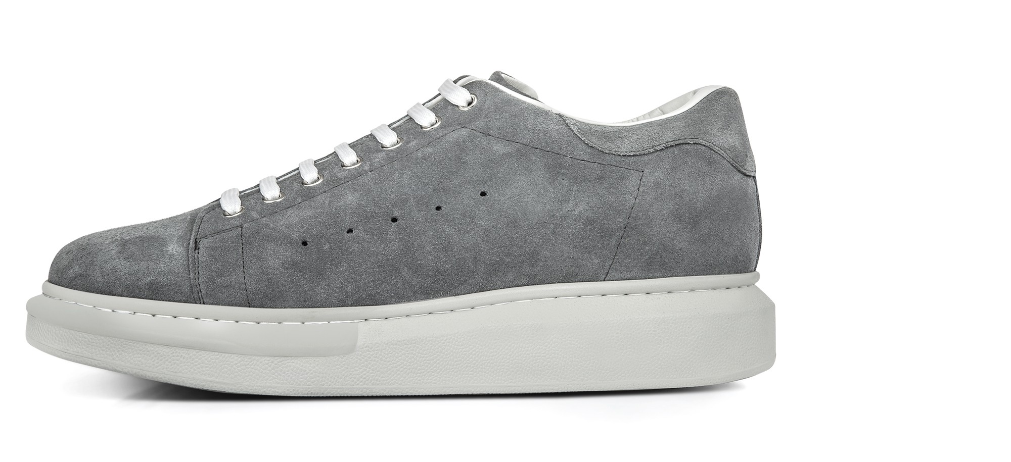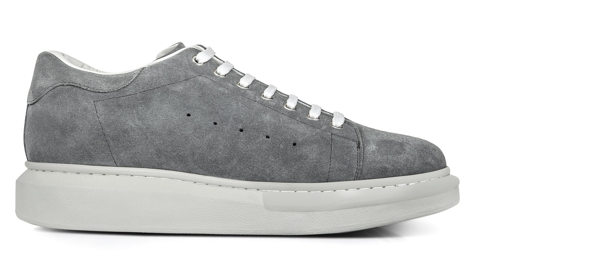 Stylish elevator sneakers featuring upper made of soft gray suede with tone-on-tone sole in super light natural rubber that improves the flexibility and stability of the walk.