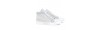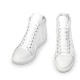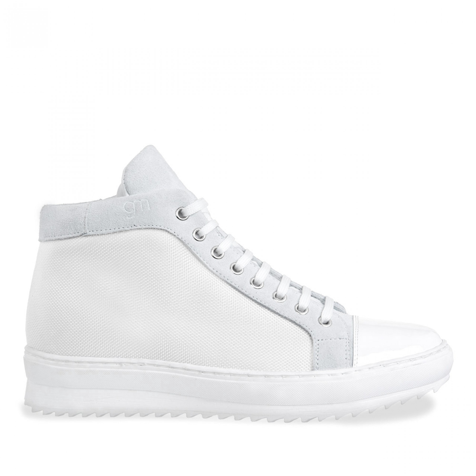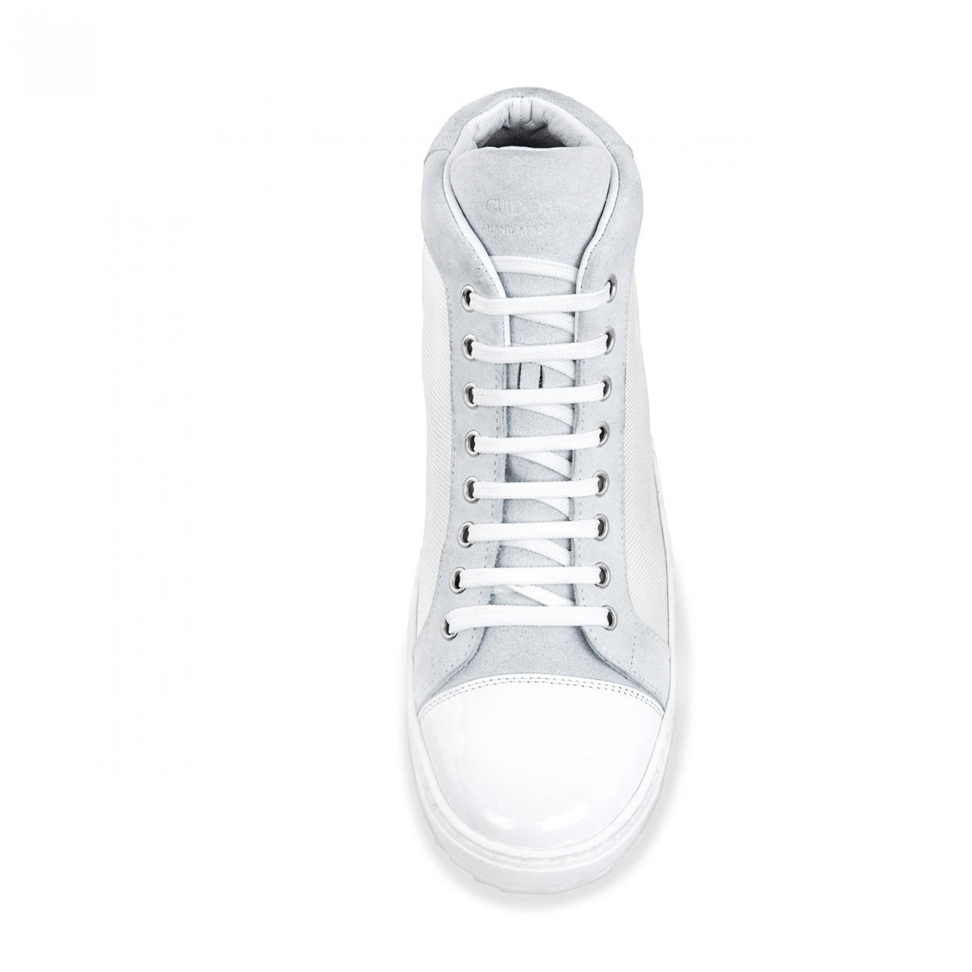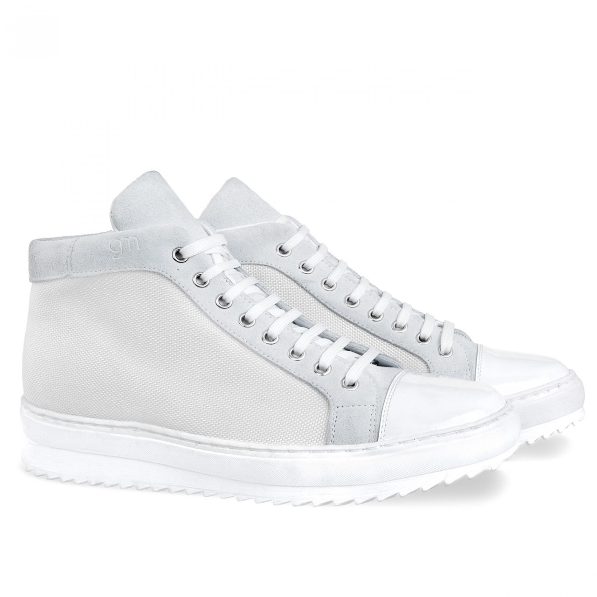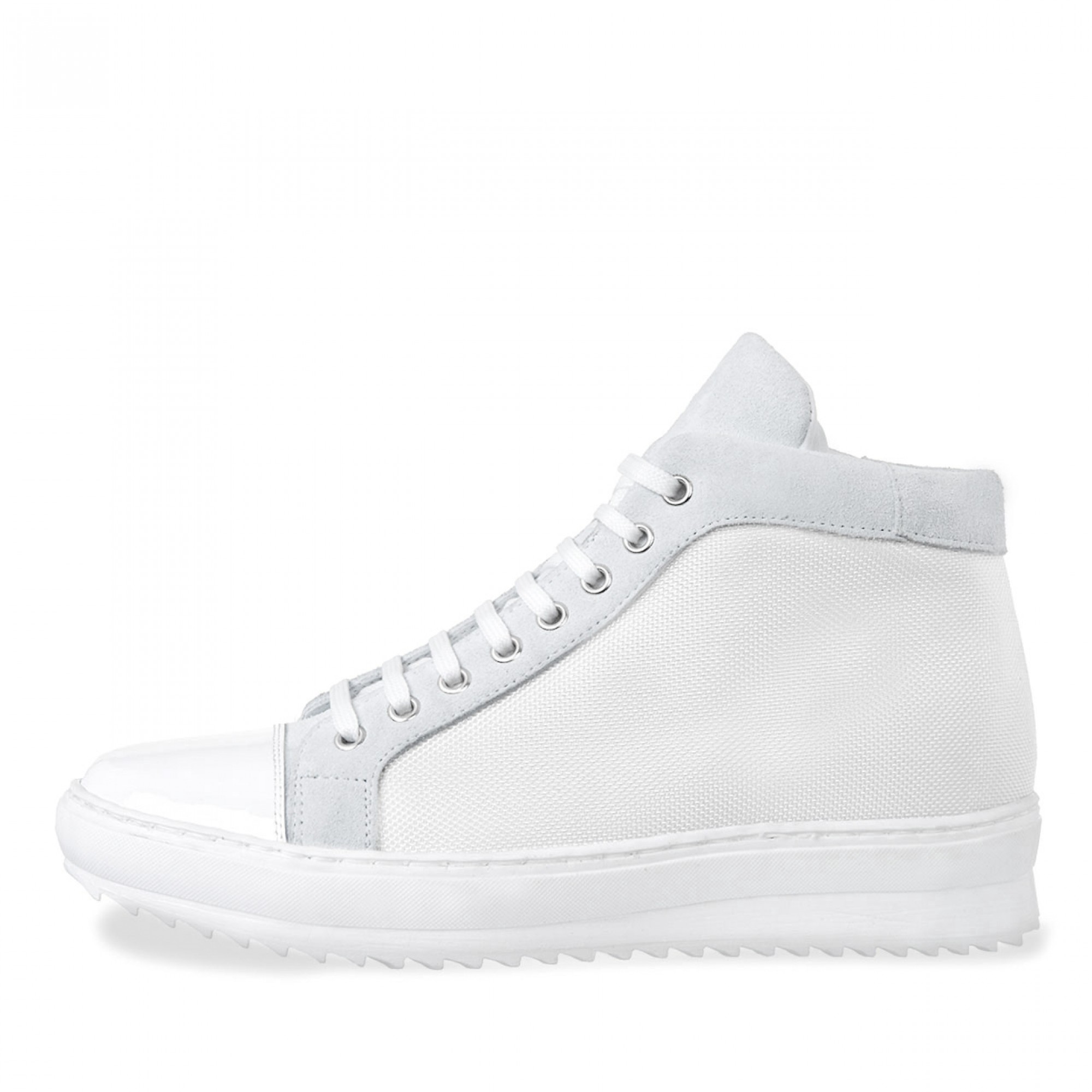 Mid-top luxury elevator sneakers with upper made of three different materials: white patent leather, cool white suede, and breathable white technical fabric. The tone-on-tone sole is in natural rubber.