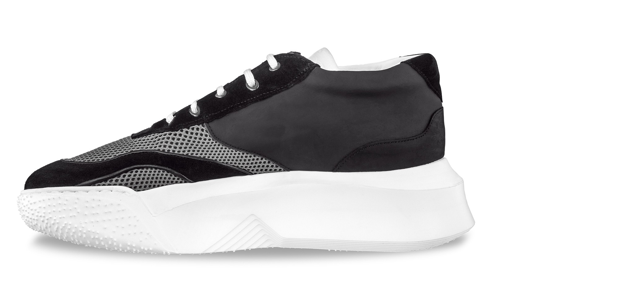Inspired by the world of basketball, Jordan is a chunky elevator sneakers with upper made using 6 different materials: suede and brushed black calfskin, white and black rubberized leather, perforated steel gray fabric and black full-grain Tuscan vegetable-tanned leather. The white sole is made of super-light natural rubber.