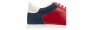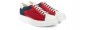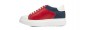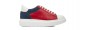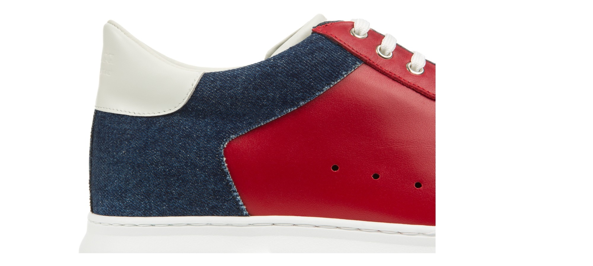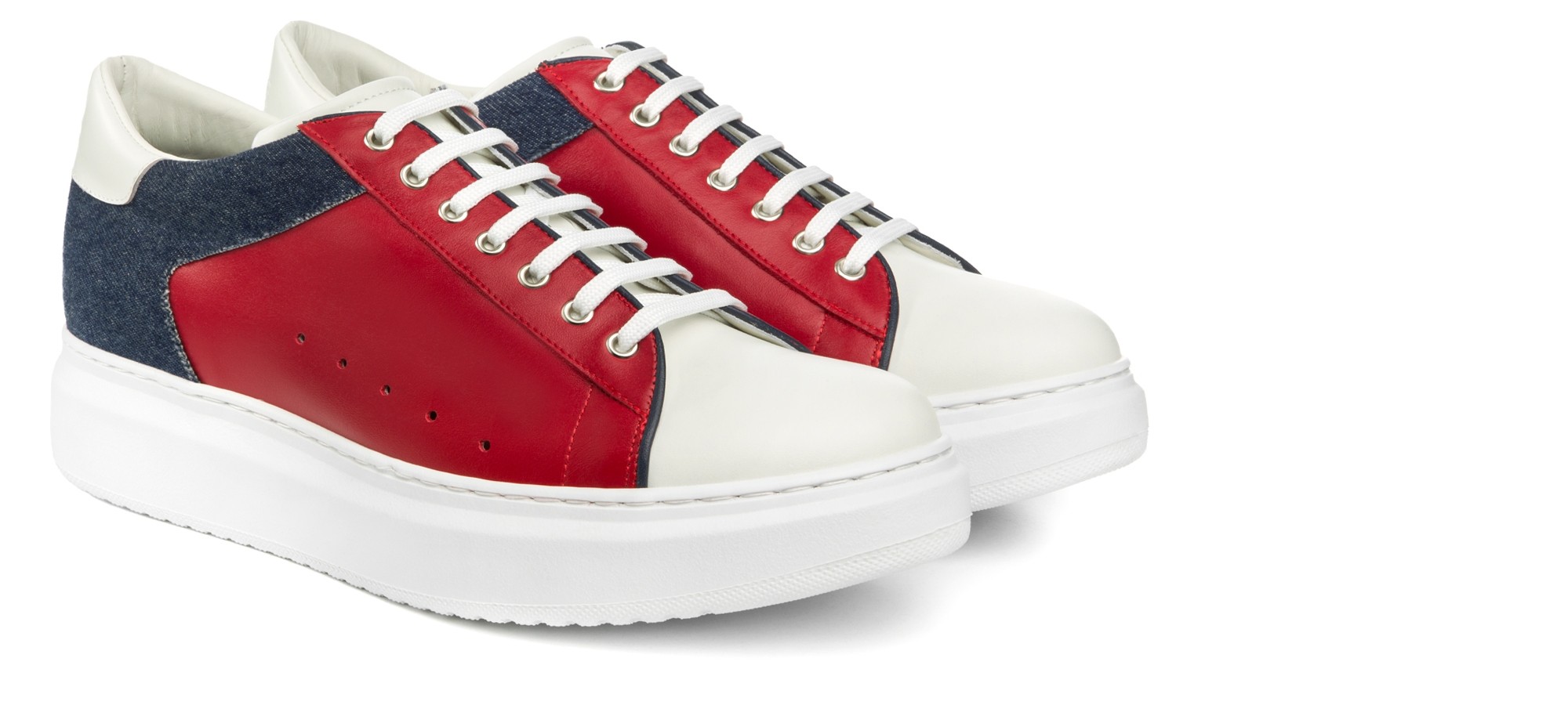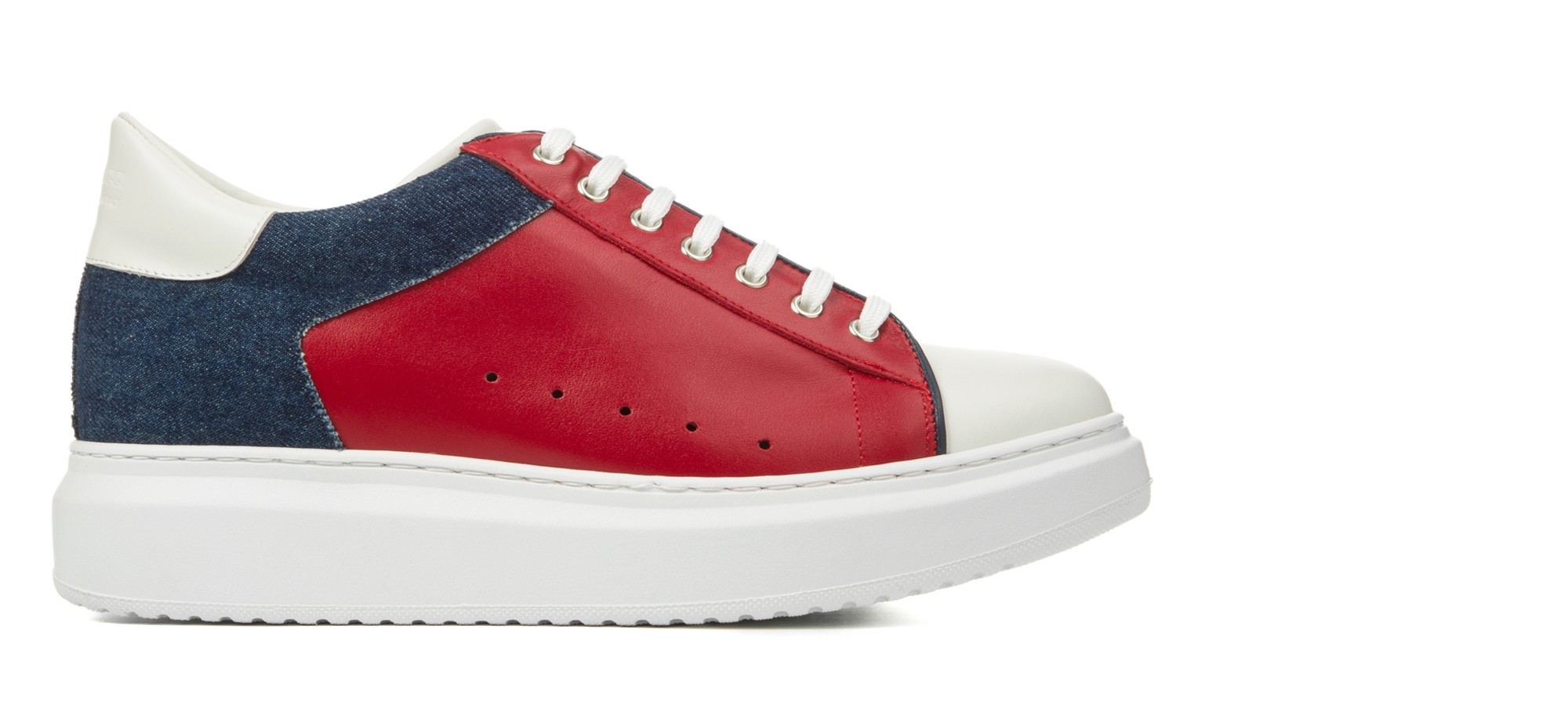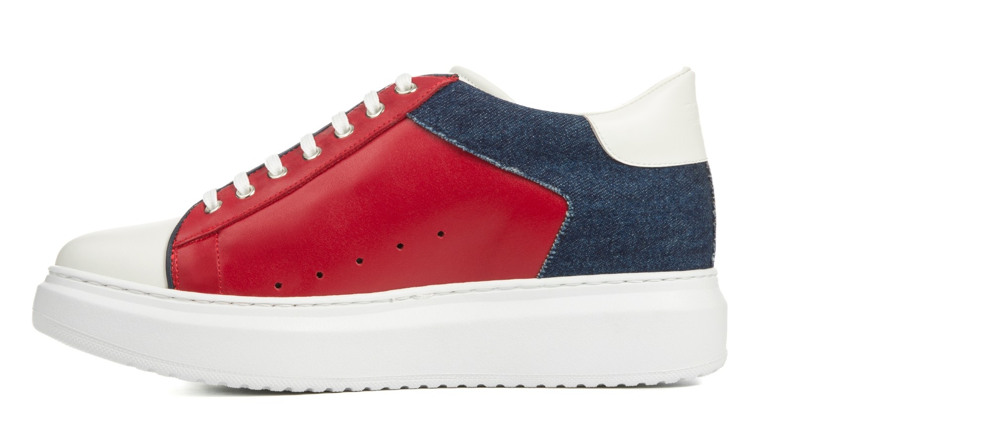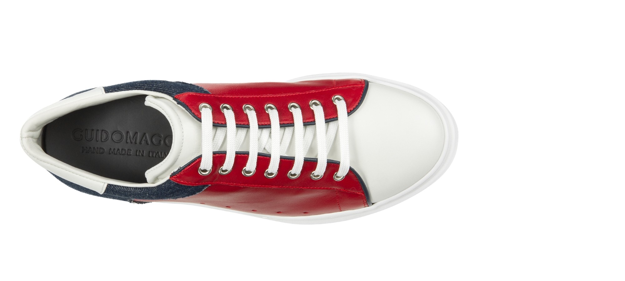 Luxury elevated sneakers handmade in Italy with upper in white and red full-grain leather and denim fabric on the back. The sole is in natural rubber.