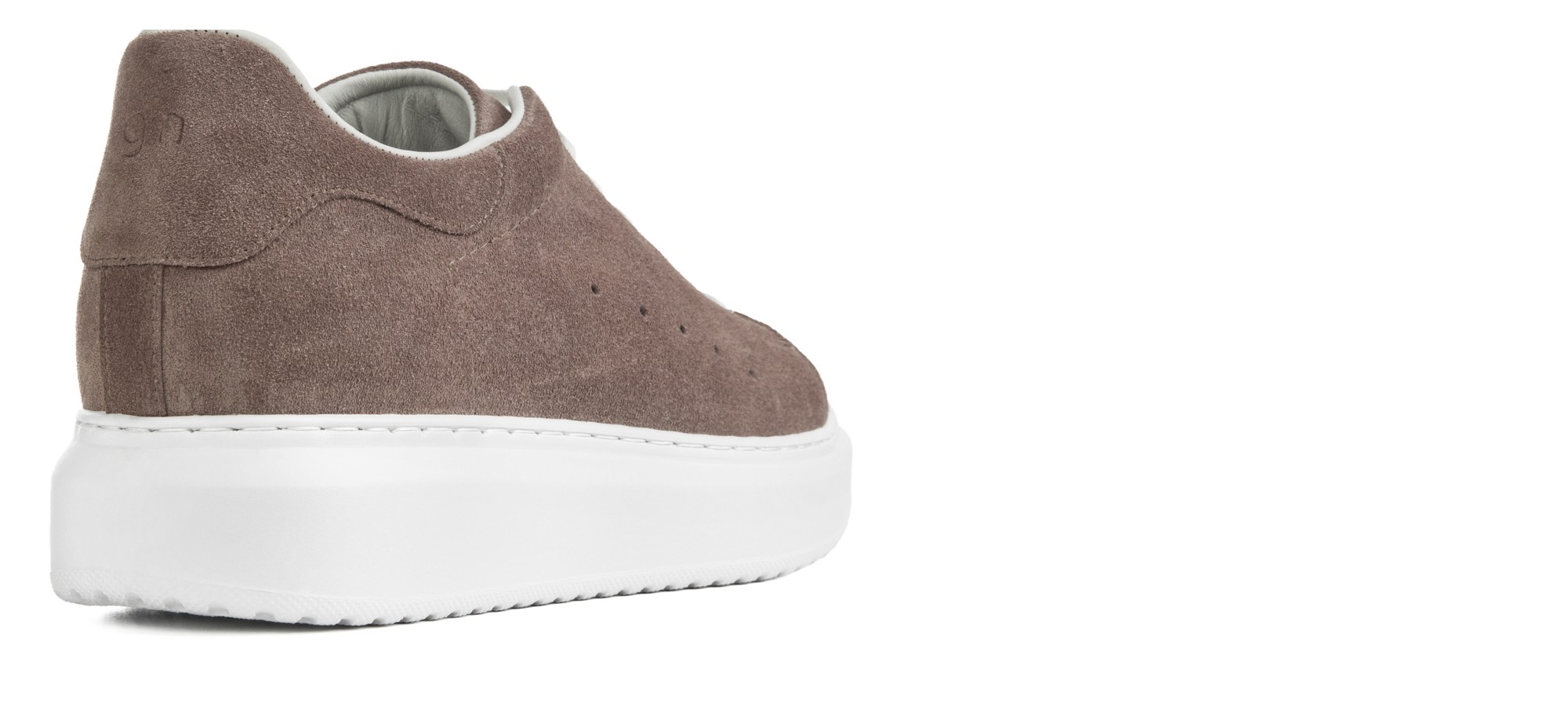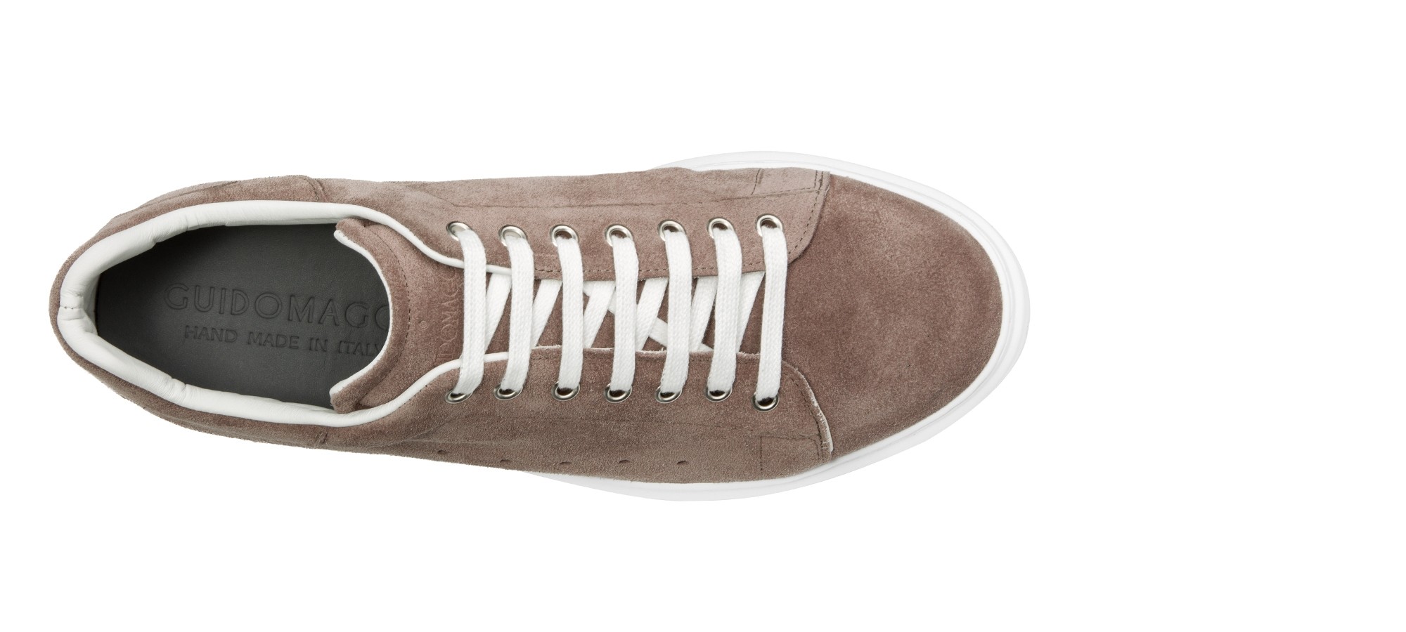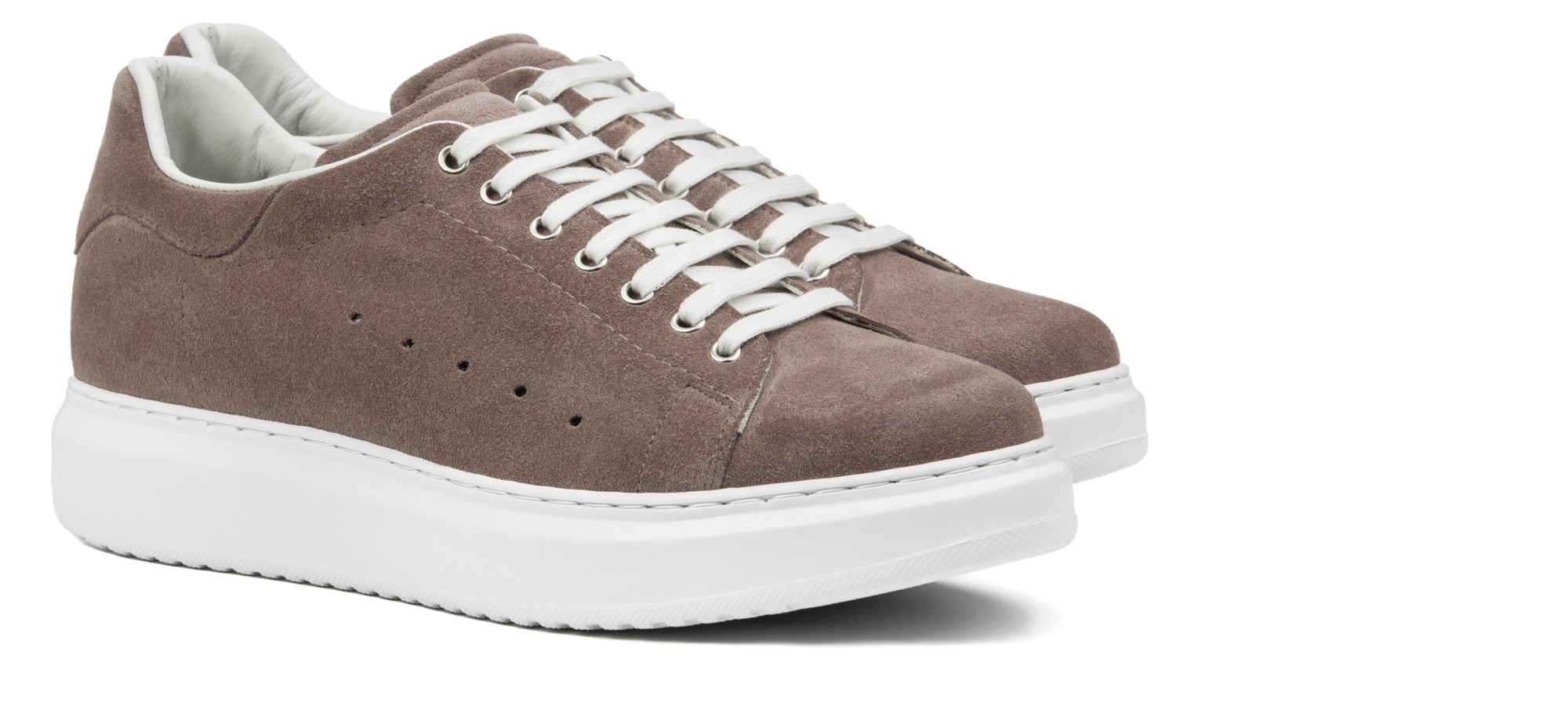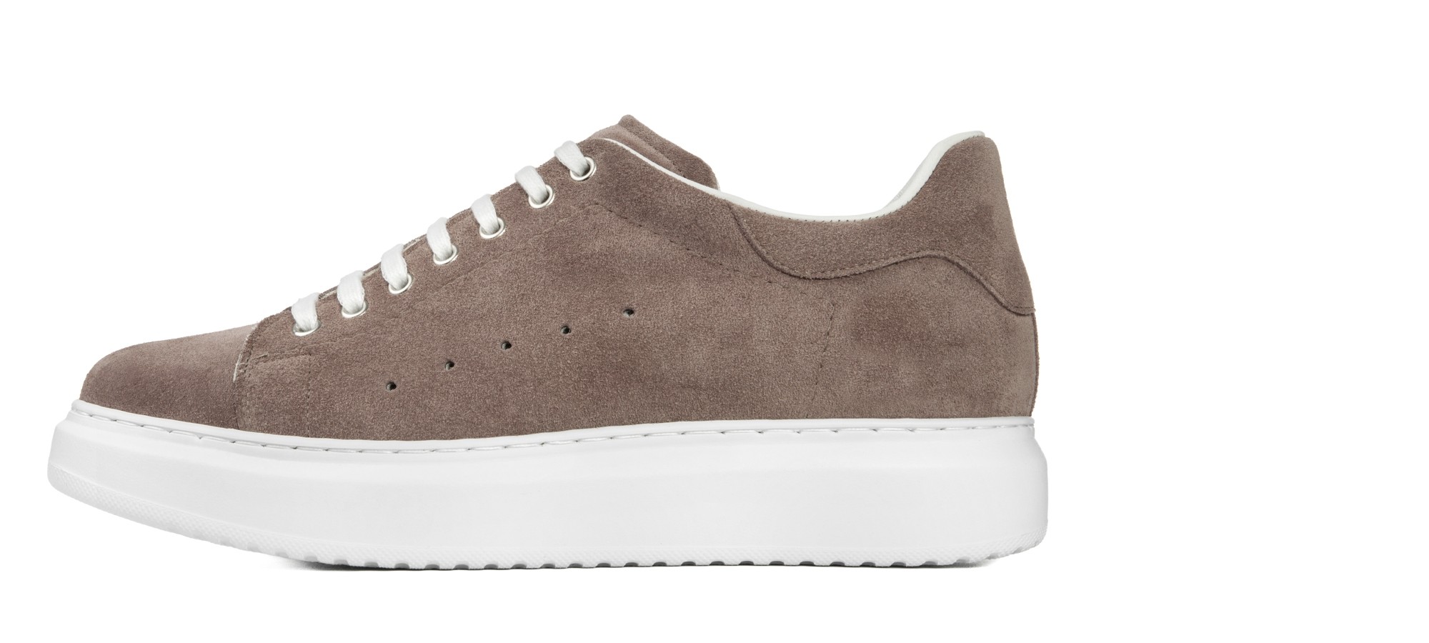 Sneakers with a smooth, lightweight white sole, featuring an upper made of suede calf leather. These shoes are very comfortable, designed with a casual-chic aesthetic and entirely made in Italy, offering an elegant and sophisticated look and adding up to 3.1 inches (8 cm) of extra height.