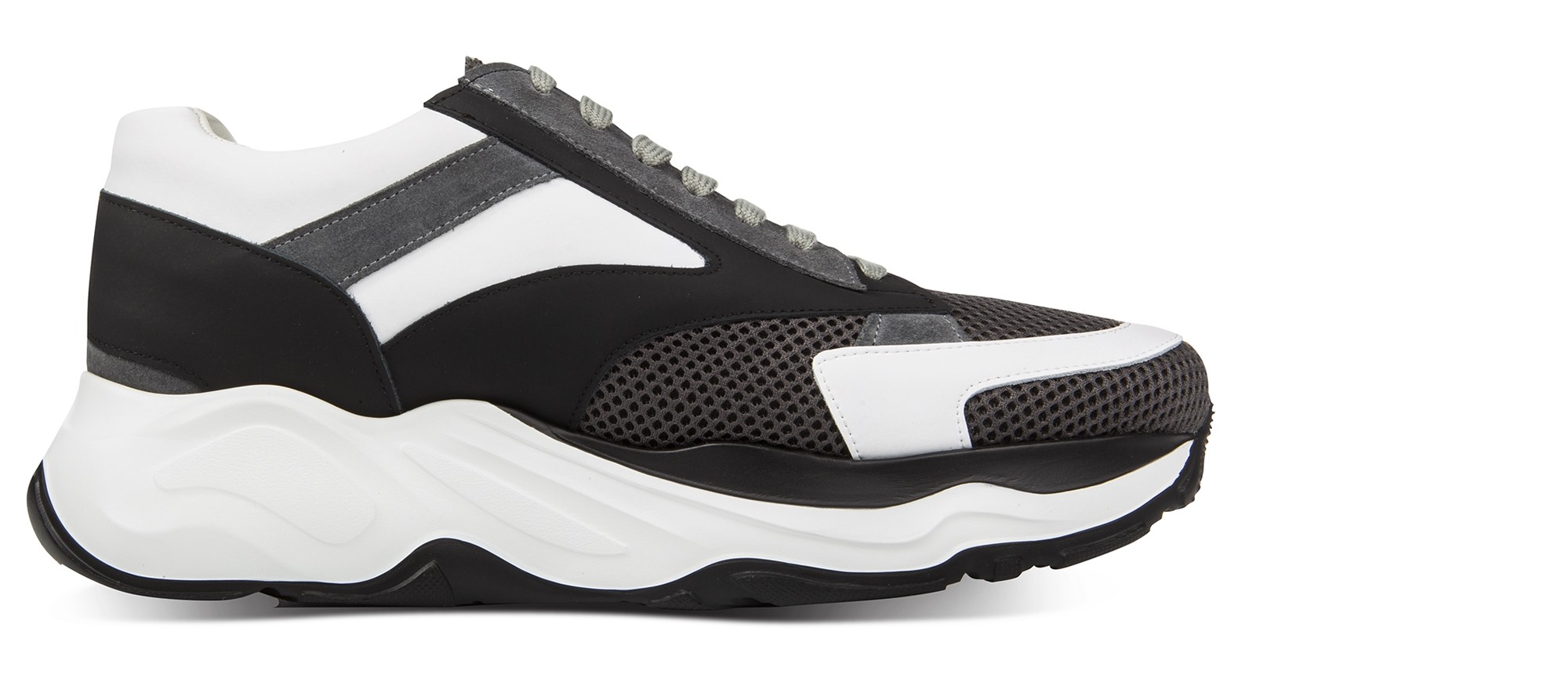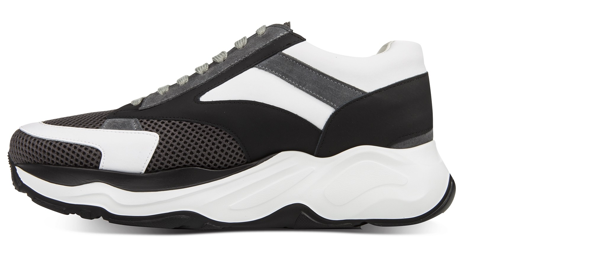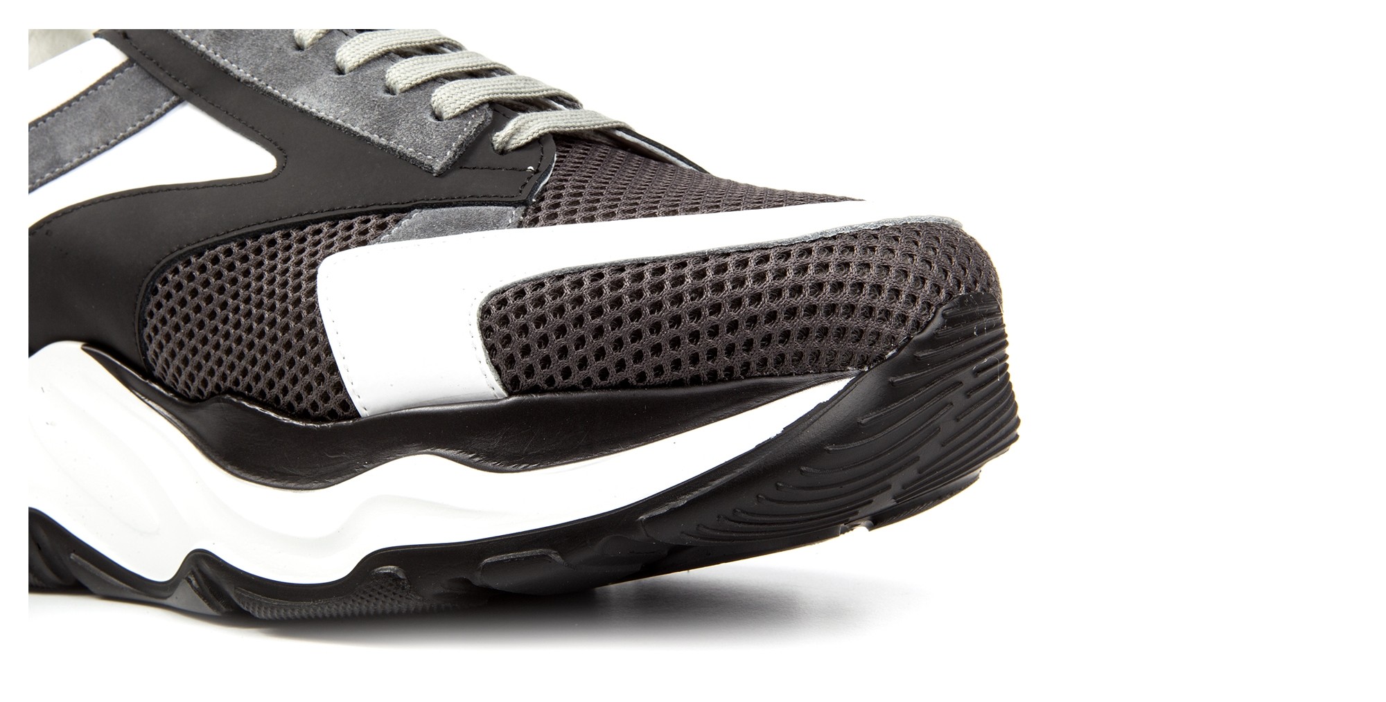 Luxury chunky elevator sneakers with a sophisticated yet casual design made of white and black rubberized calf leather, gray suede and dark gray breathable perforated fabric. The two-tone white/black sole is in extralight rubber.