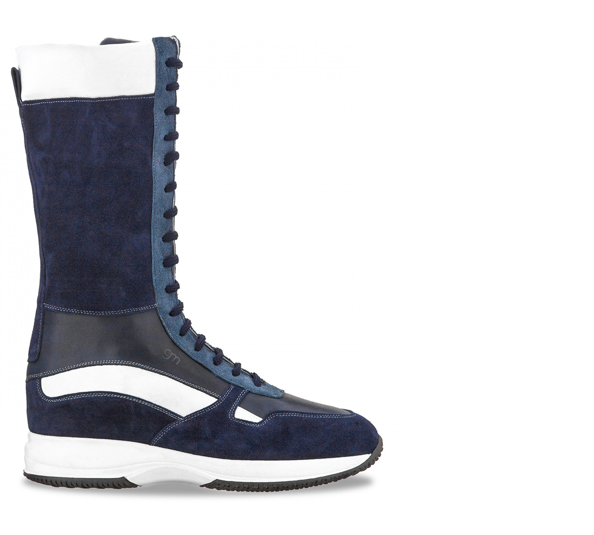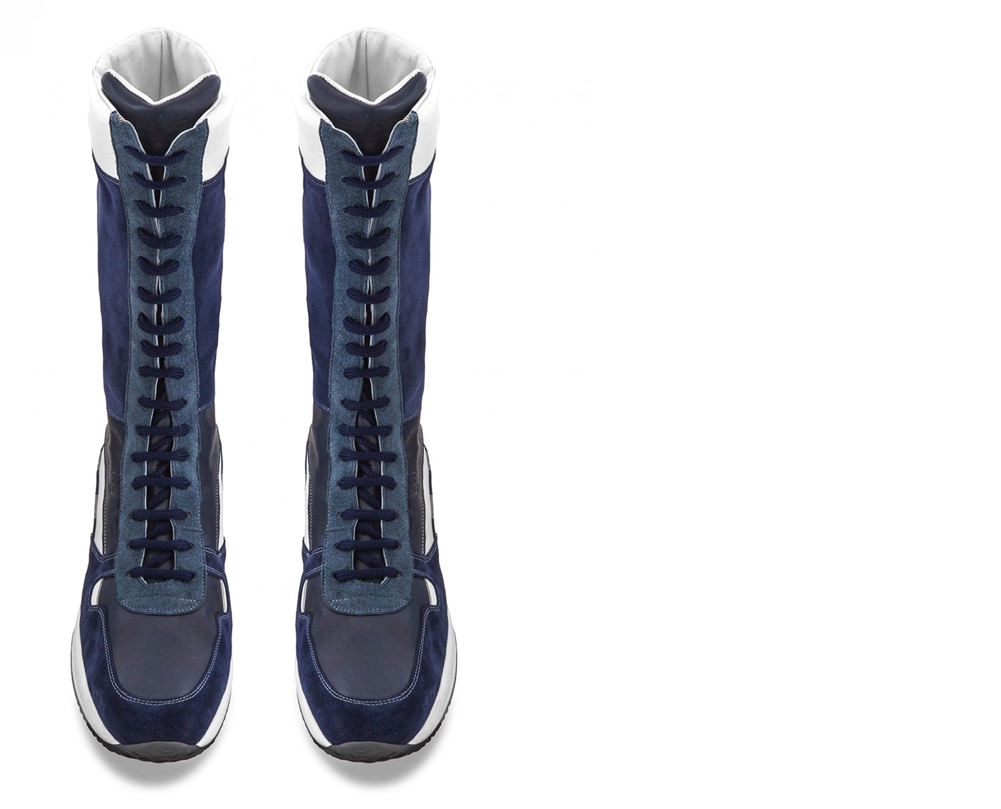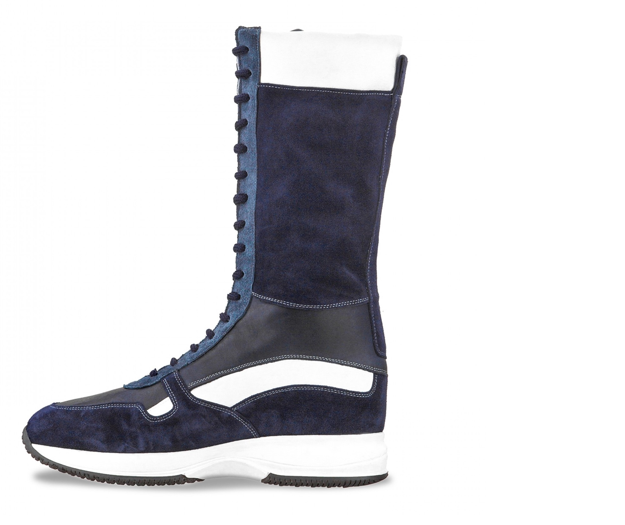 Trendy high-leg elevator sneakers handcrafted in soft calfskin featuring 4 different colors: white full grain leather, blue suede, buffered blue calfskin and light blue suede. The super-light natural rubber sole offers maximum stability and durability. Shaft height: approximately 14 inches (depending on the size).