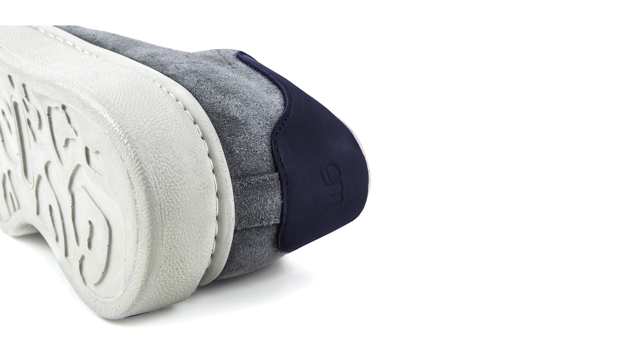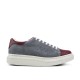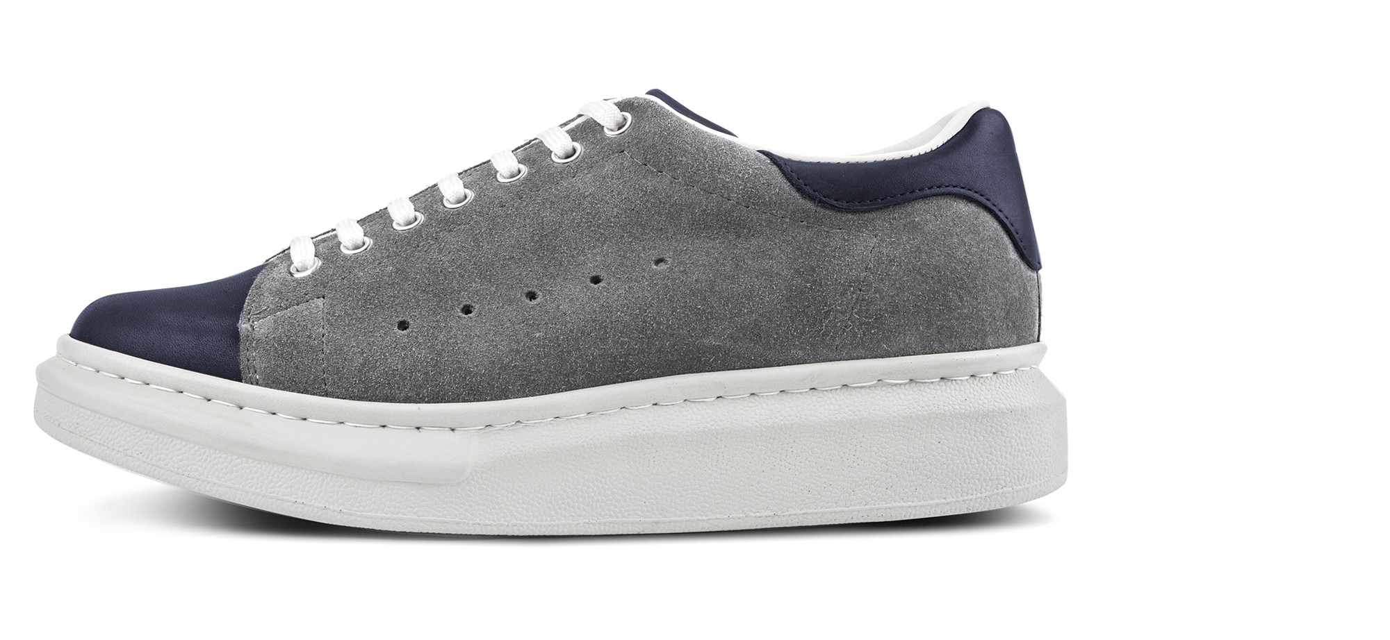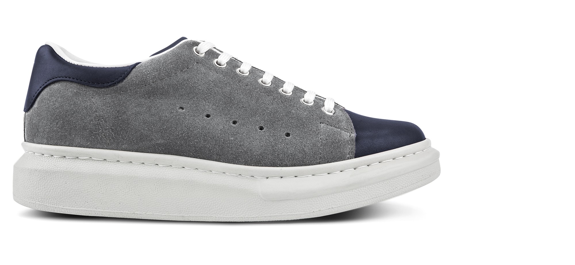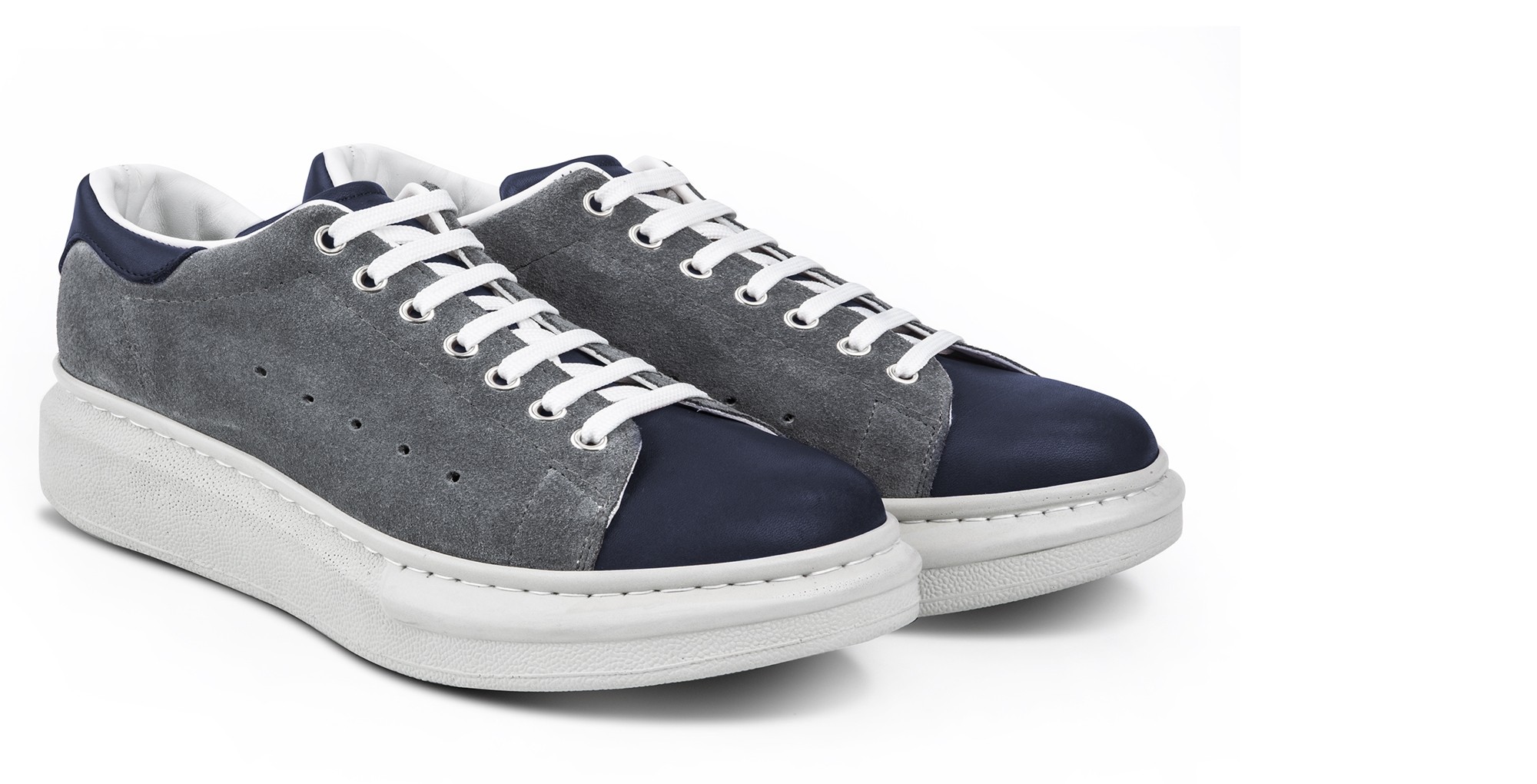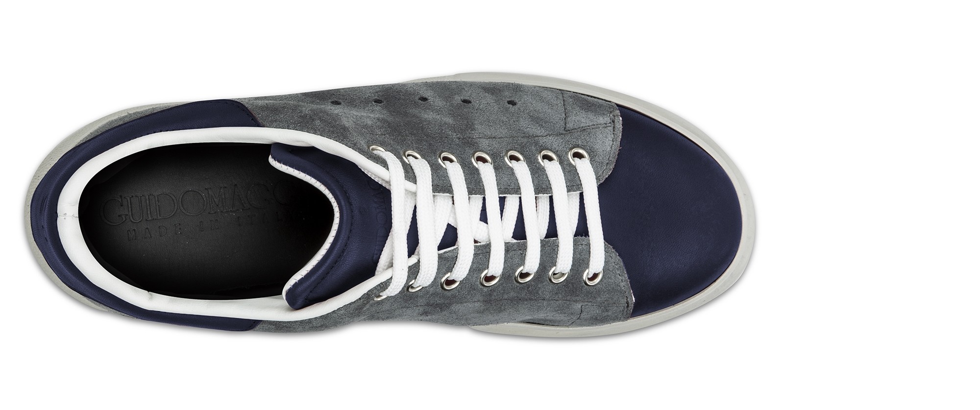 Elevator sneakers with an iconic design featuring upper made of gray suede and blue full-grain leather on toe and heel tab. The gray sole is in ultralight natural rubber. GuidoMaggi craftsmen also allow you to customize your shoe by choosing the leathers and the color of the sole.