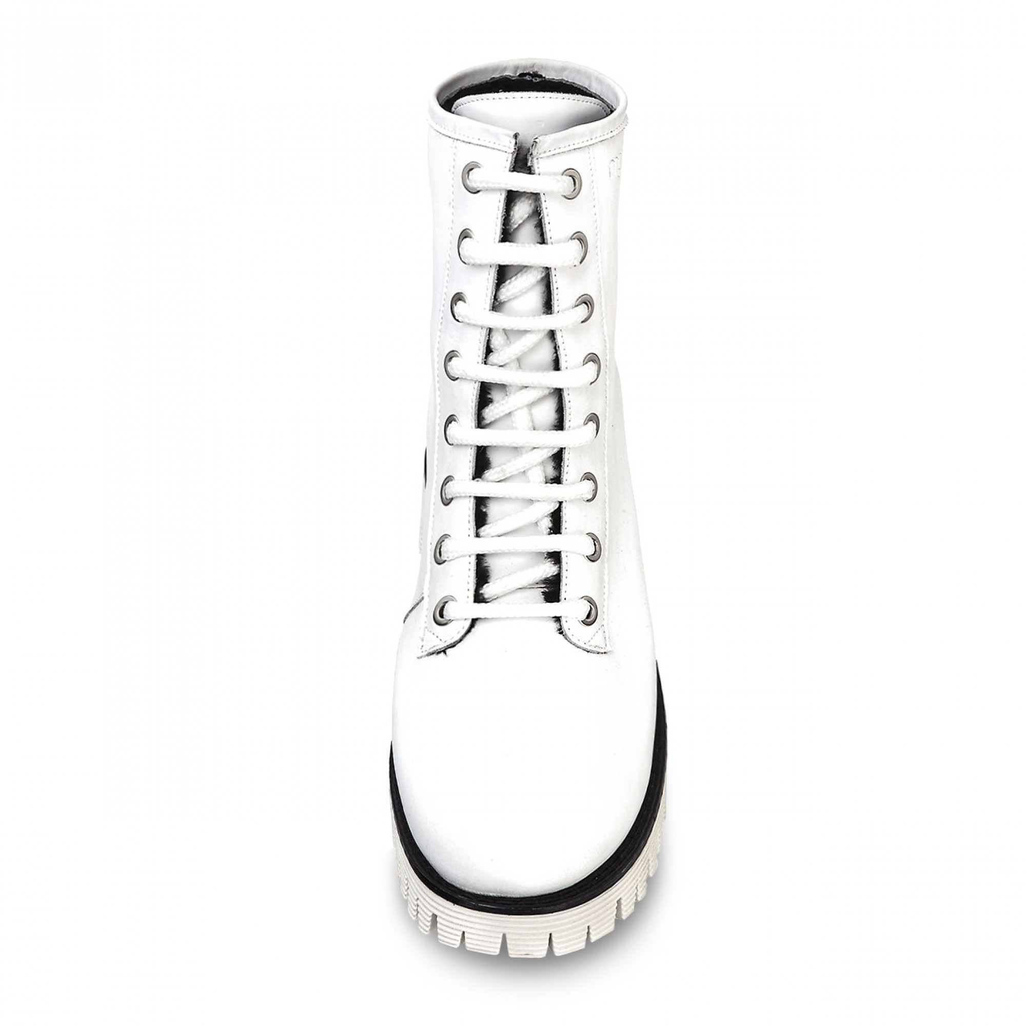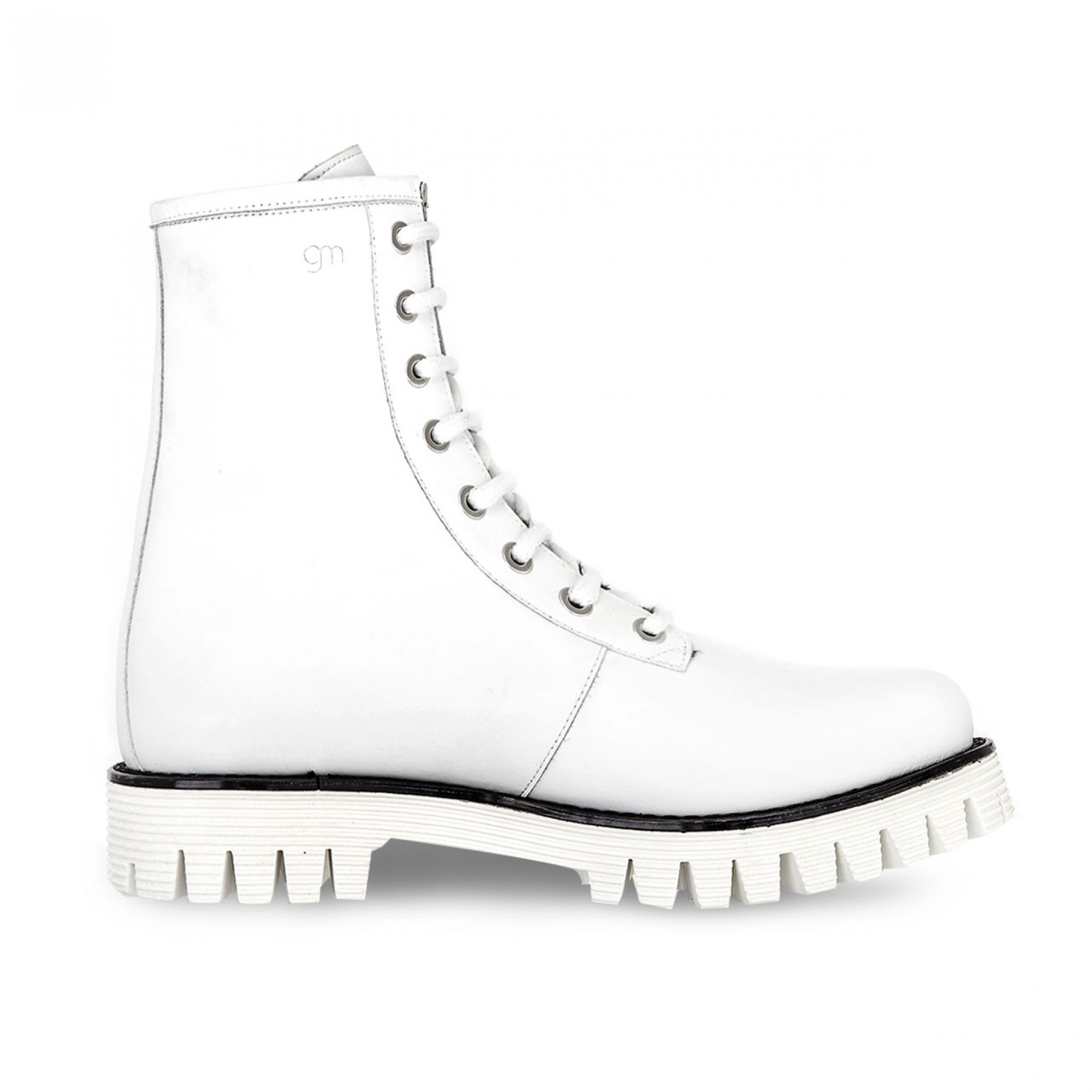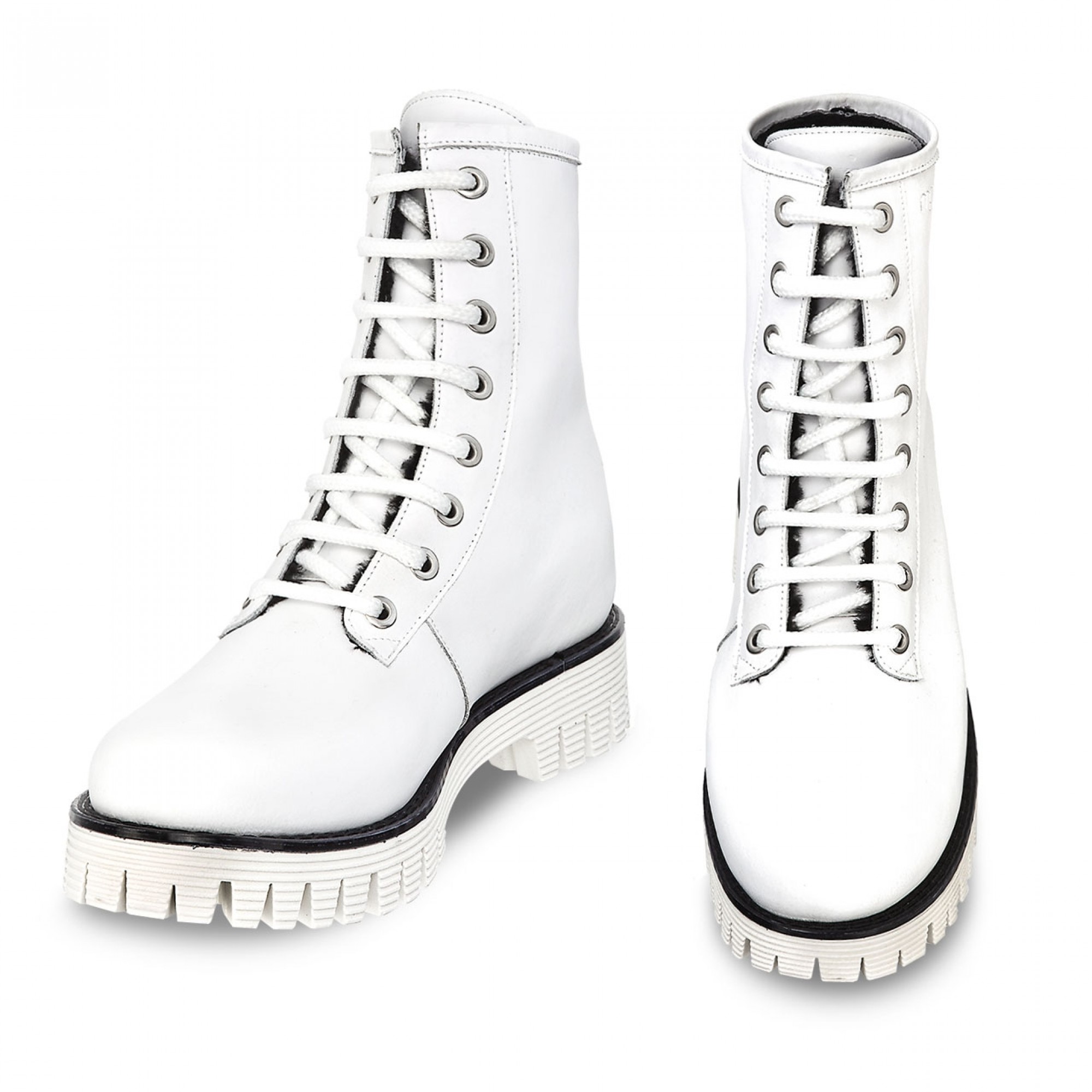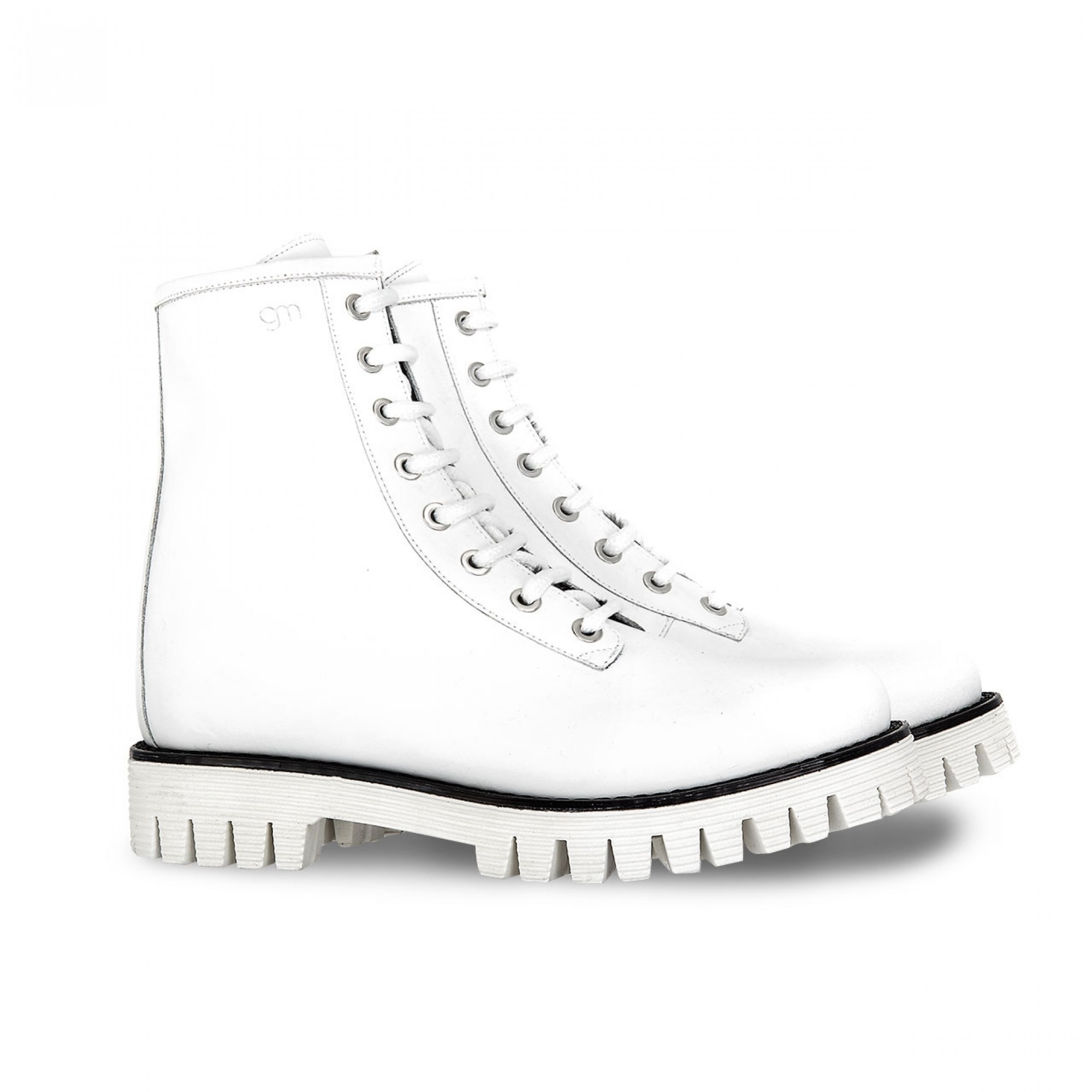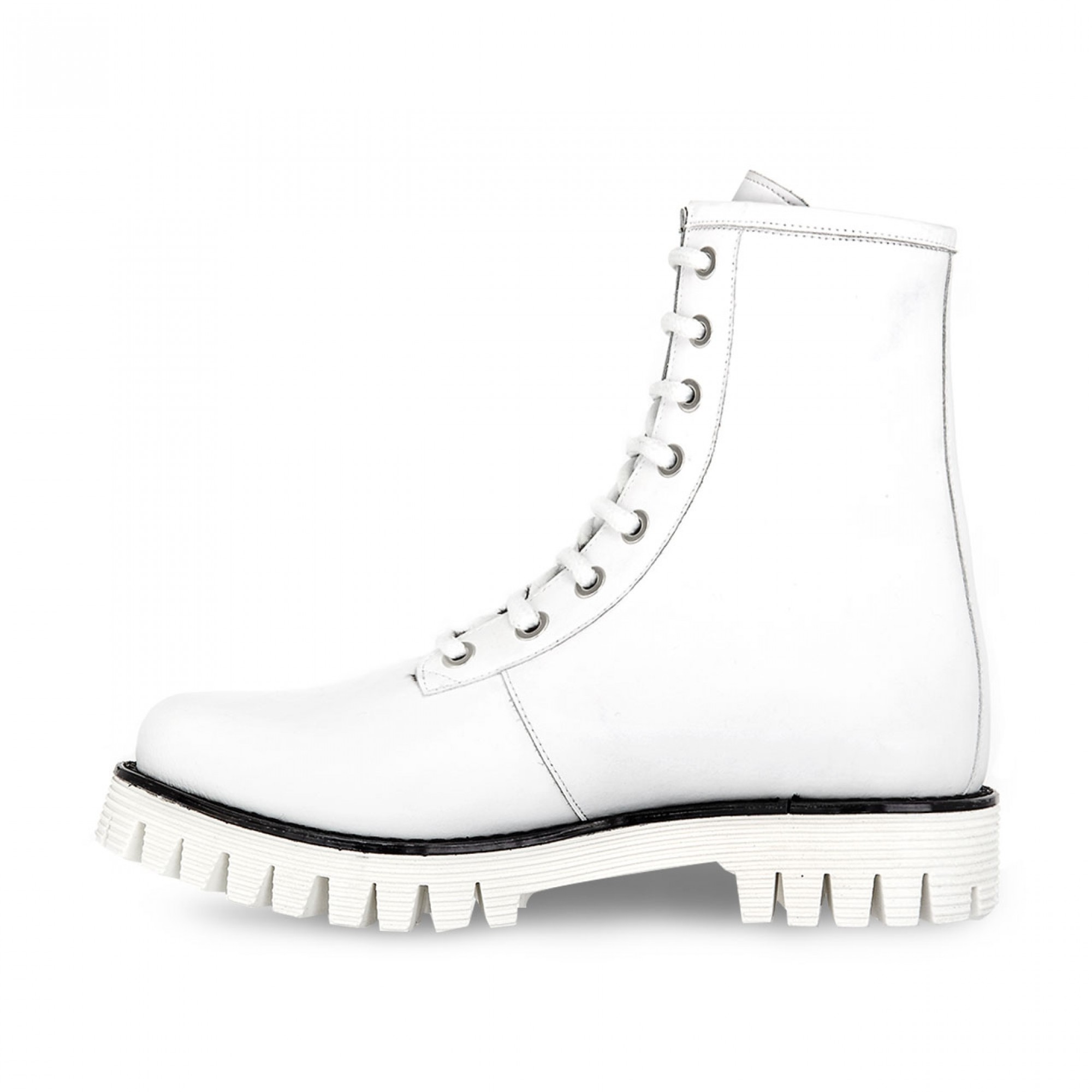 Exclusive elevator boots with upper made of white calf leather with a rubberized effect and shealing inner lining. Versatile, waterproof and stylish. The tone-on-tone striped sole with black welt is in ultralight rubber.