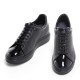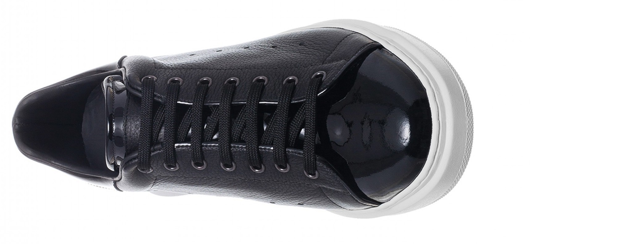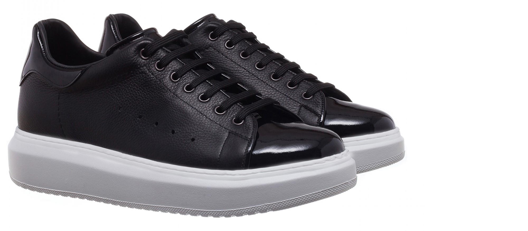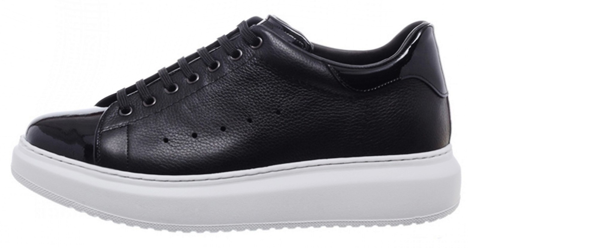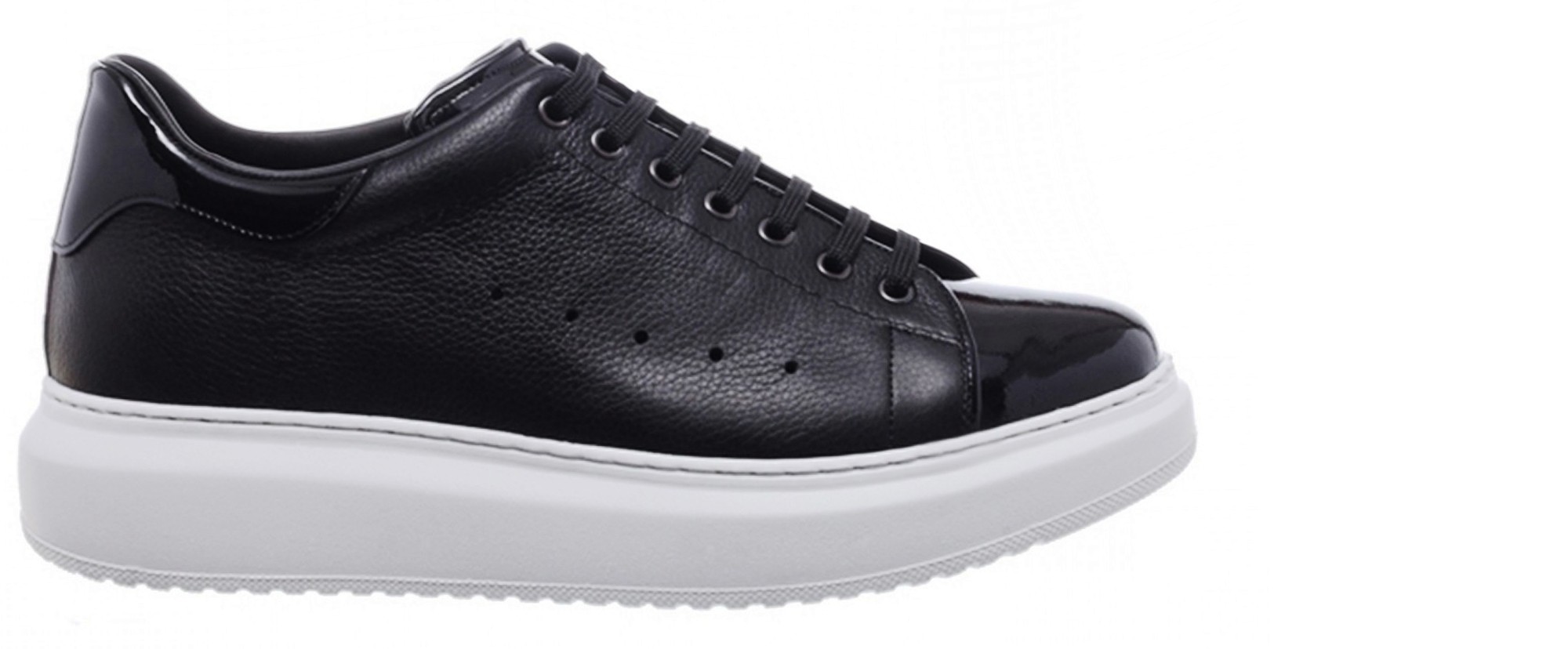 Casual and stylish elevator sneakers with unique upper made of smooth, hammered calfskin, handcrafted and enriched with fine details in patent leather on the tip and the heel tab.