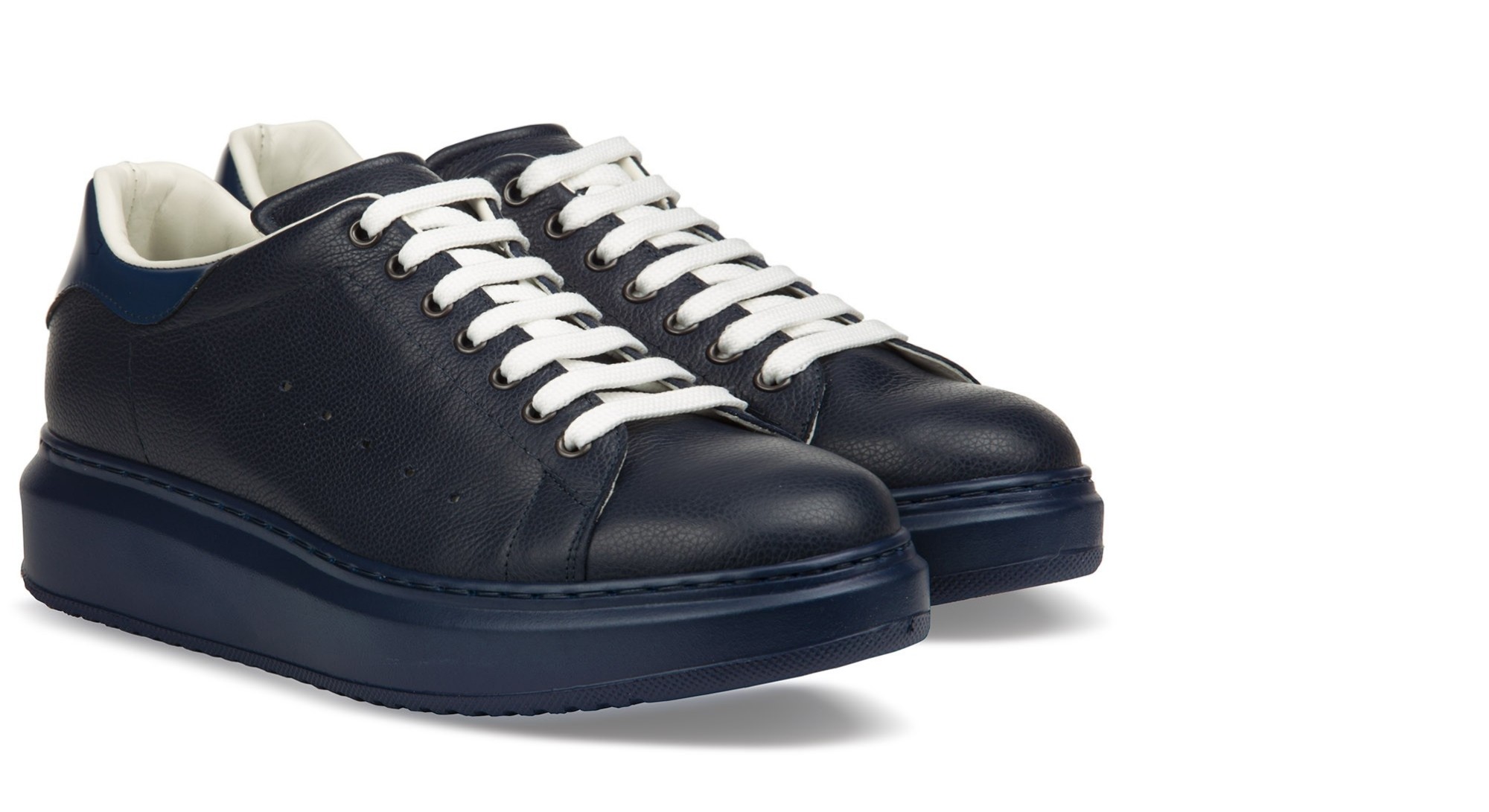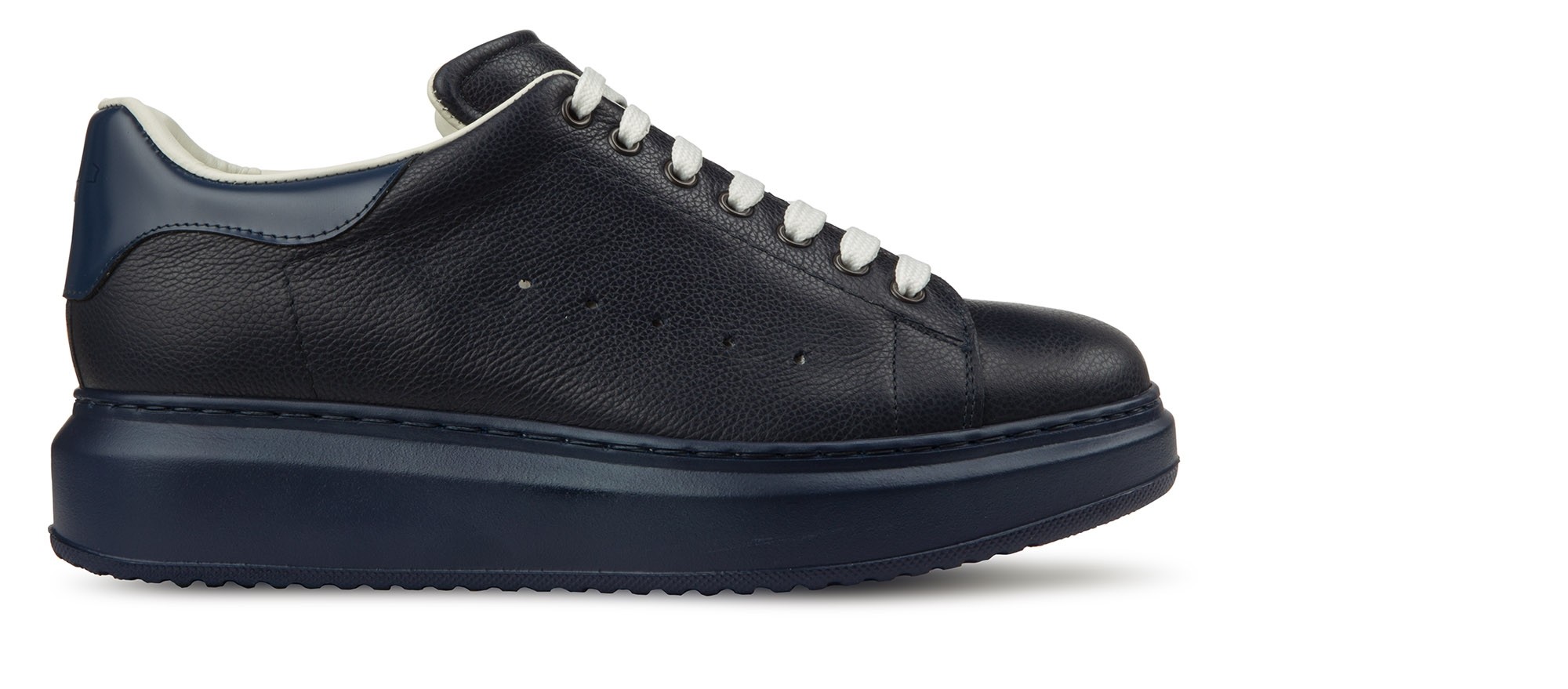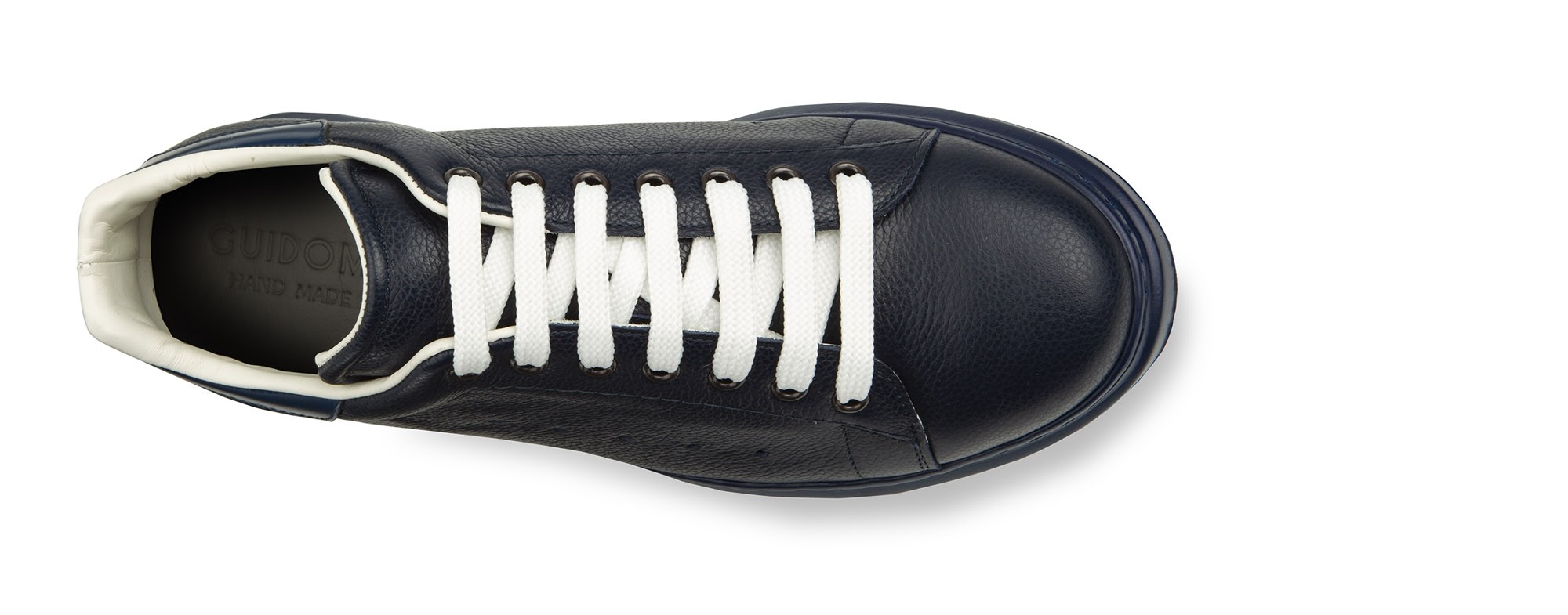 The new sneakers from the spring/summer collection by GuidoMaggi are elegant and dynamic, with rounded lines, in the warm colours of blue. The upper is extremely soft hammered calfskin, with a semigloss calfskin spur. The laces are in white contrast, but they are also available in blue on request. Super light, tone-on-tone sole. Perfect for those who love easy chic outfits. It has a lifting system that gives up to 3.1" of extra height. 100% made in Italy.