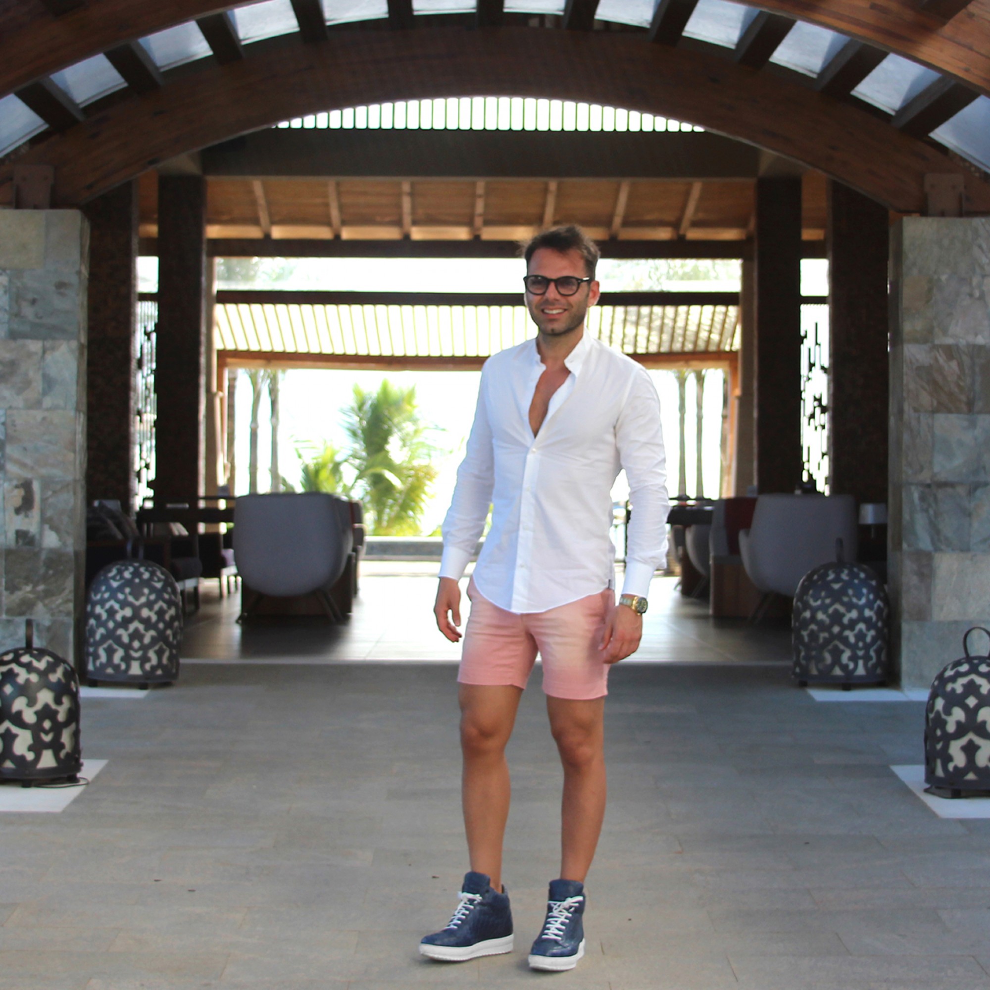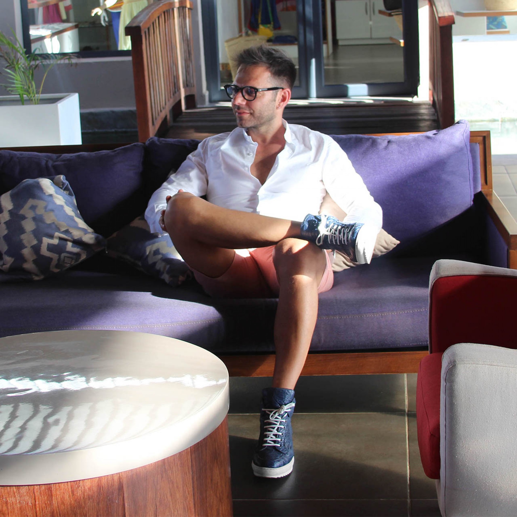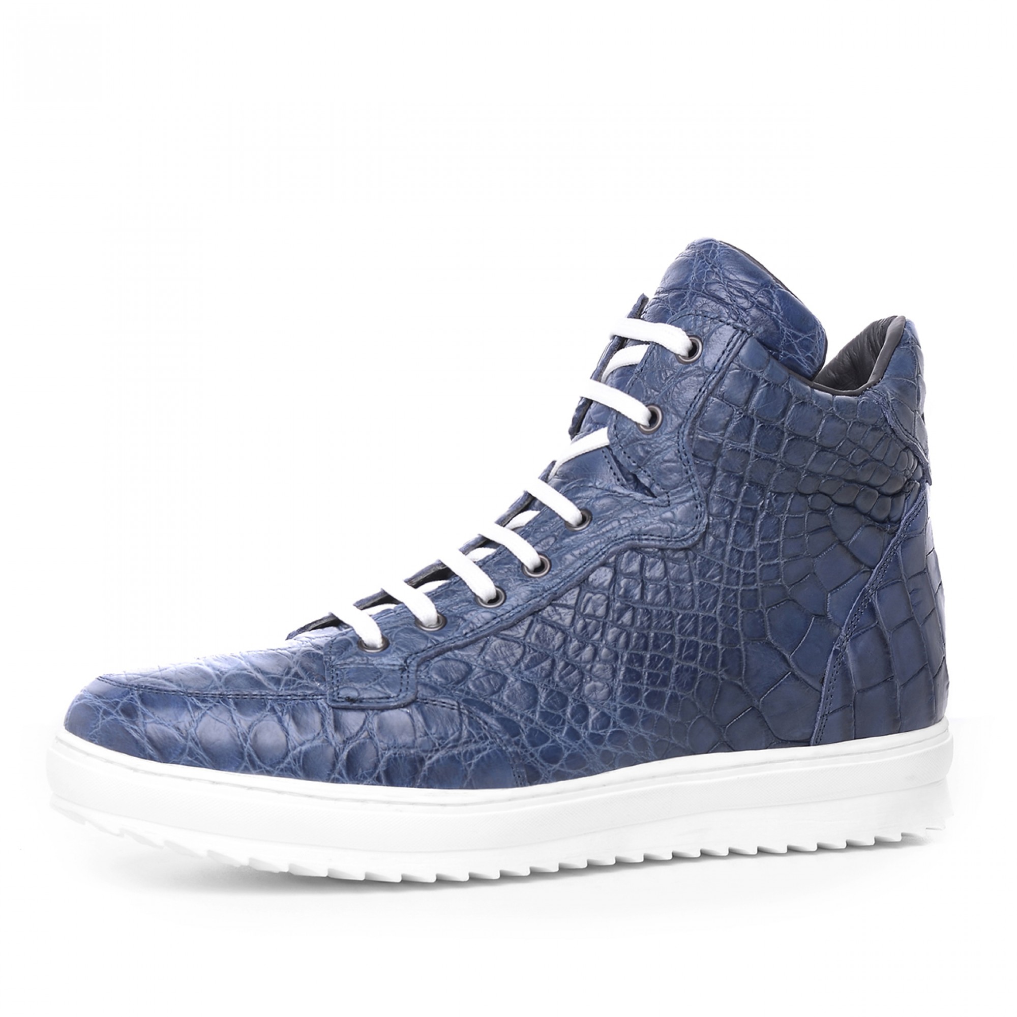 Exclusive high-top sneakers, finely hand-made in Italy, with upper made of luxurious blue crocodile leather. The white outsole of the latest generation is super lightweight rubber.