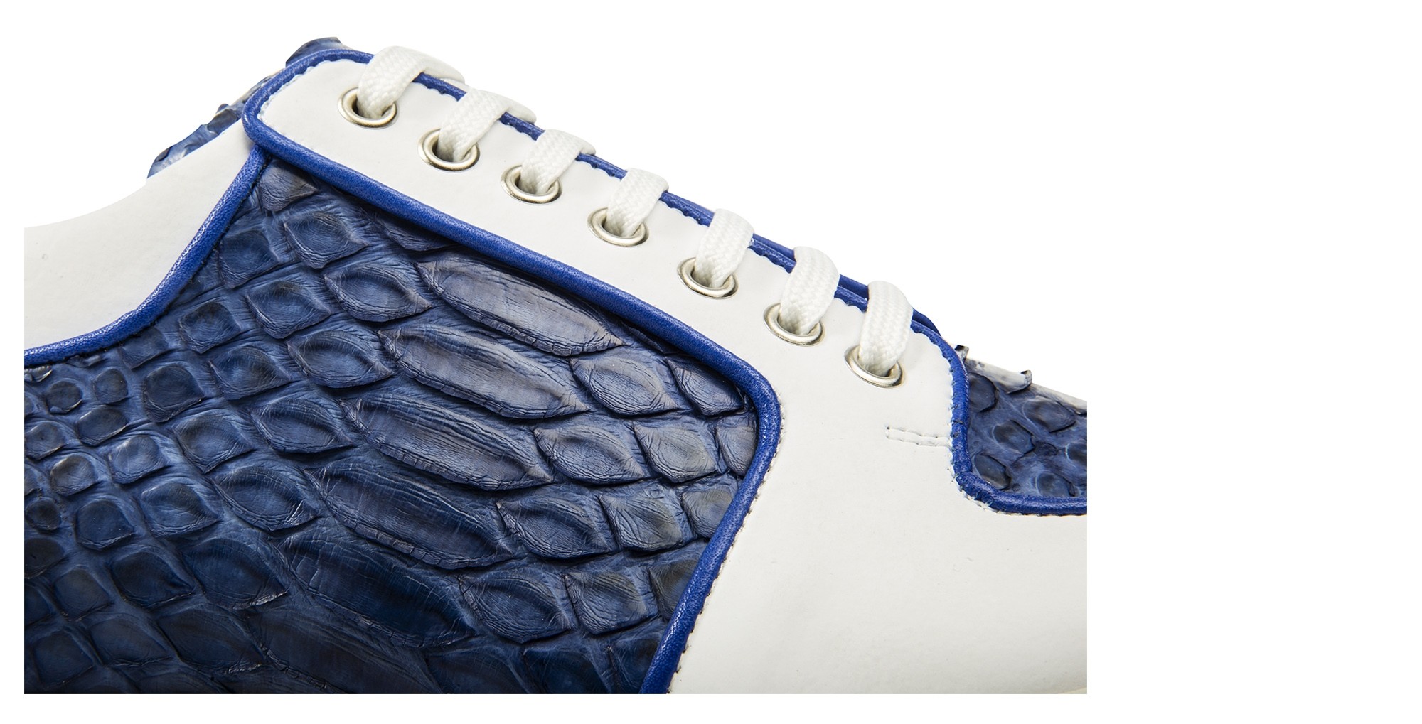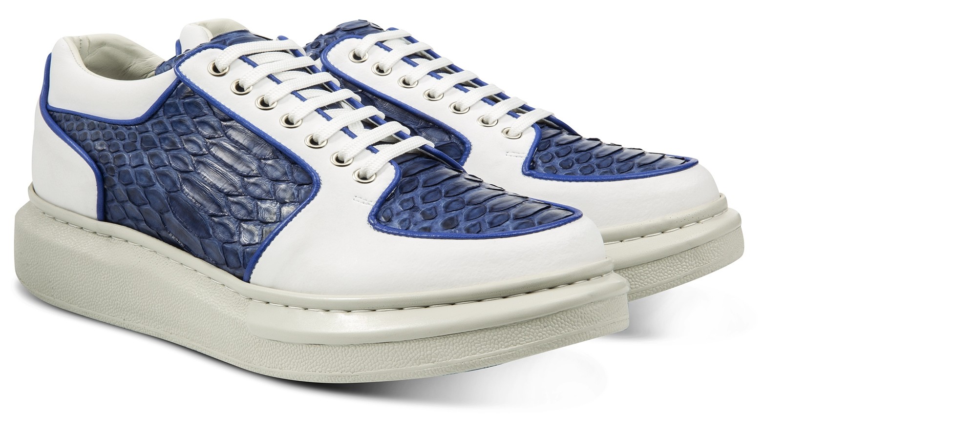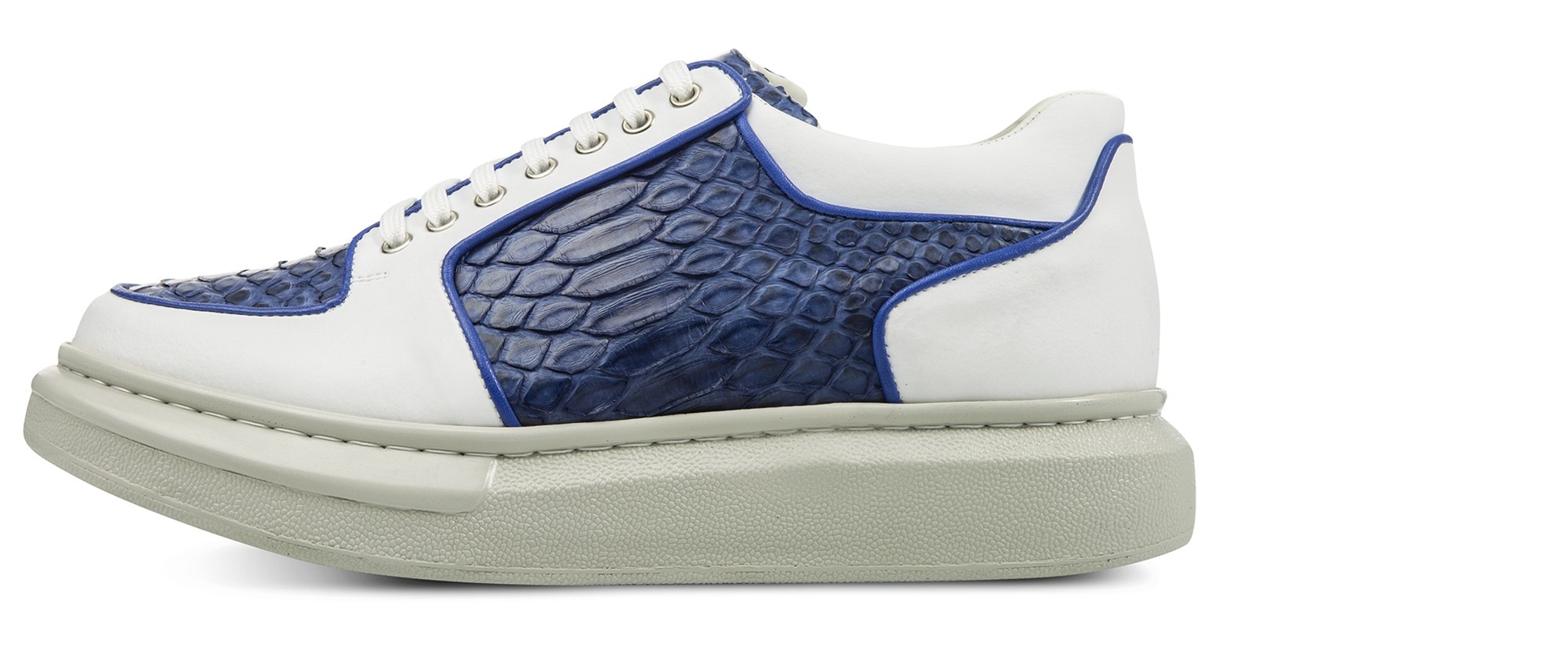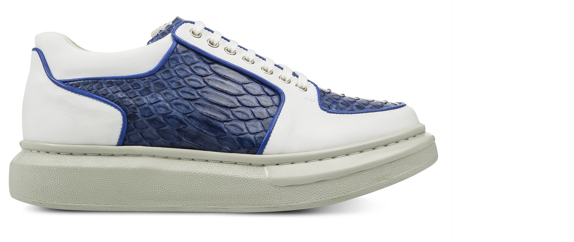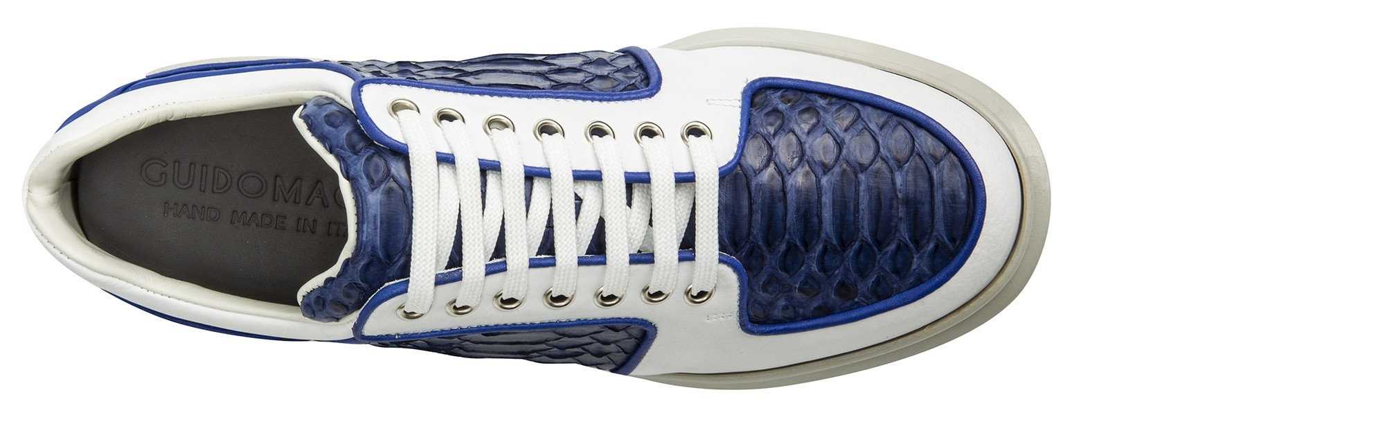Soft lines, dynamic design and sophisticated soul characterise these new elevator sneakers by GuidoMaggi. With a sporty chic attitude, they feature an upper in genuine python leather in a warm blue nuance and rubberized calfskin. The super-light grey sole is in natural rubber. An elevator model ideal for casual seasonal outfits and able to add up to 3.1 inches (8 cm) to your height in maximum comfort. 100% Handmade in Italy.