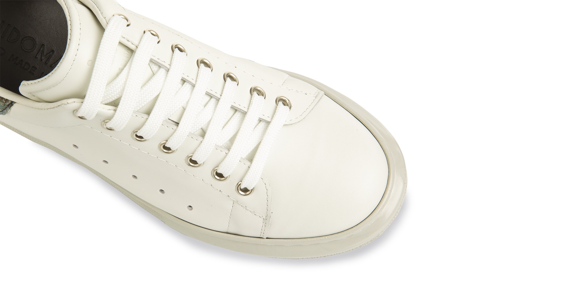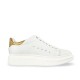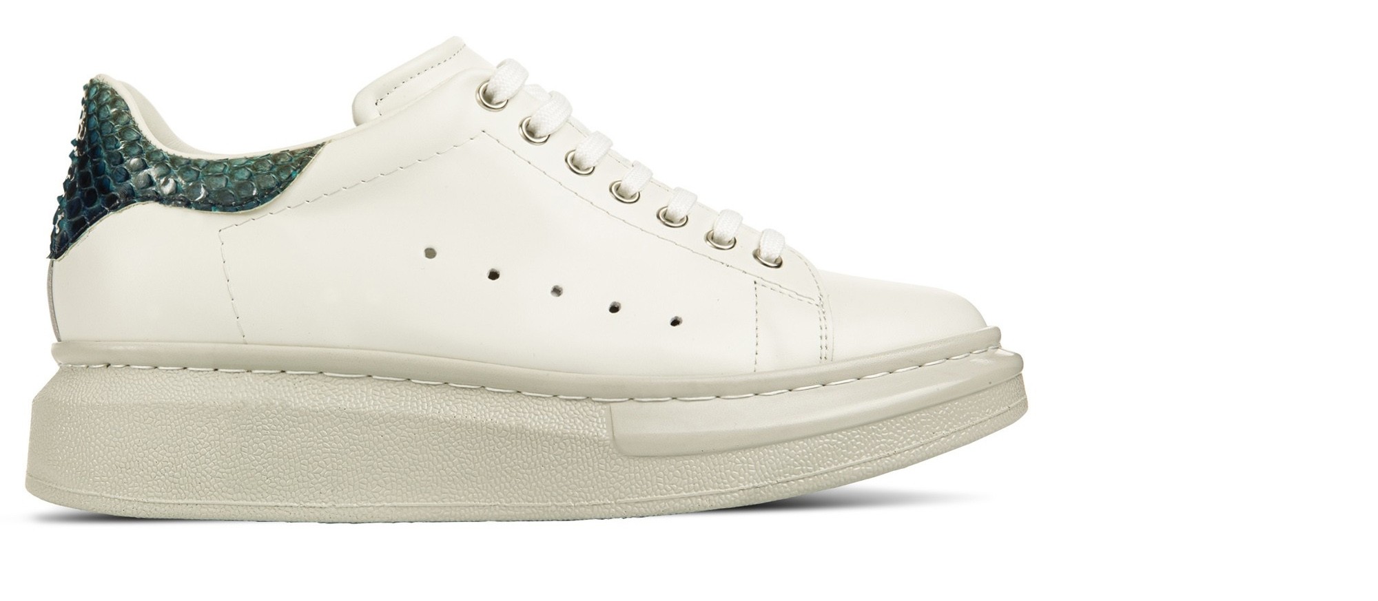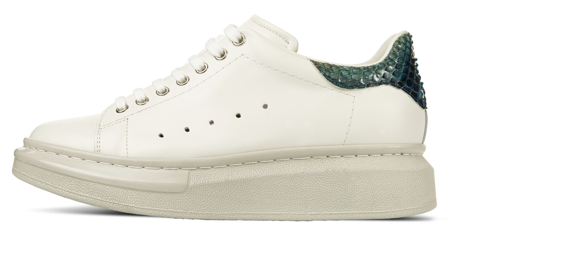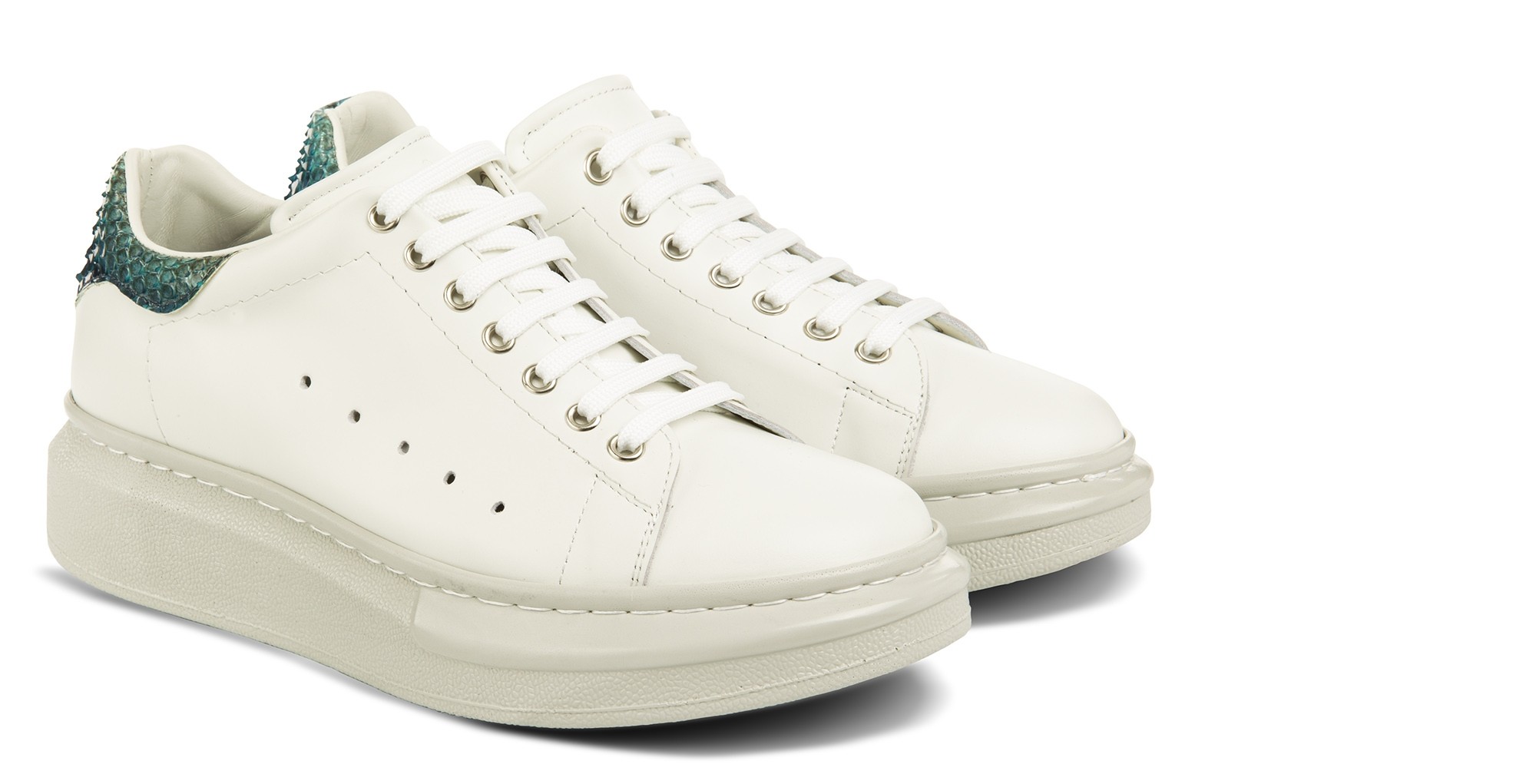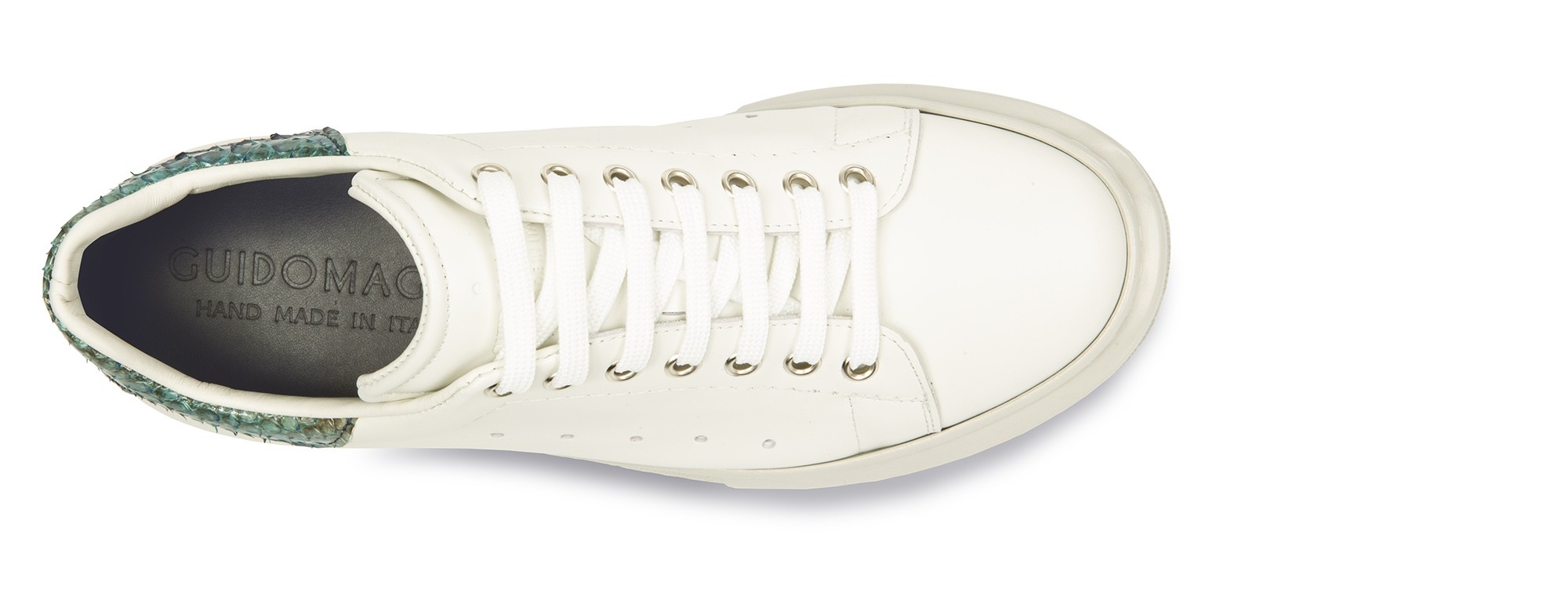 Luxury elevator sneaker with upper made of white full-grain leather, heel tab in fine green python leather and ultra-light natural rubber sole. Safi is a sneaker with a dynamic and refined design, perfect to wear every day and able to increase the total height up to 3.1 inches (8 centimeters). Designed and handmade in Italy.