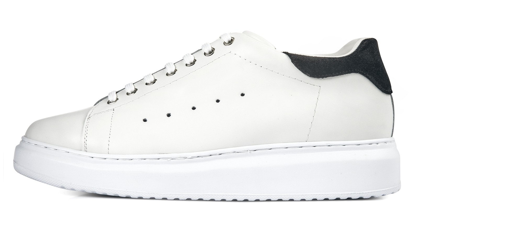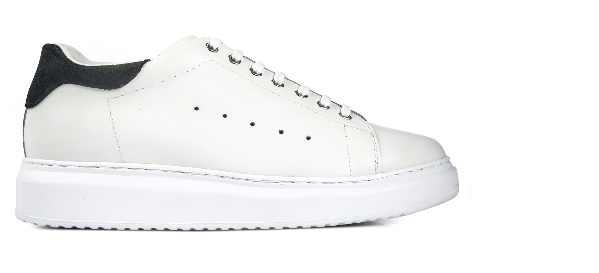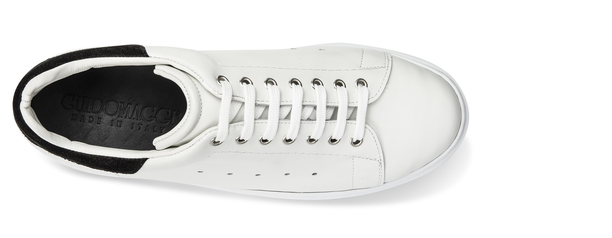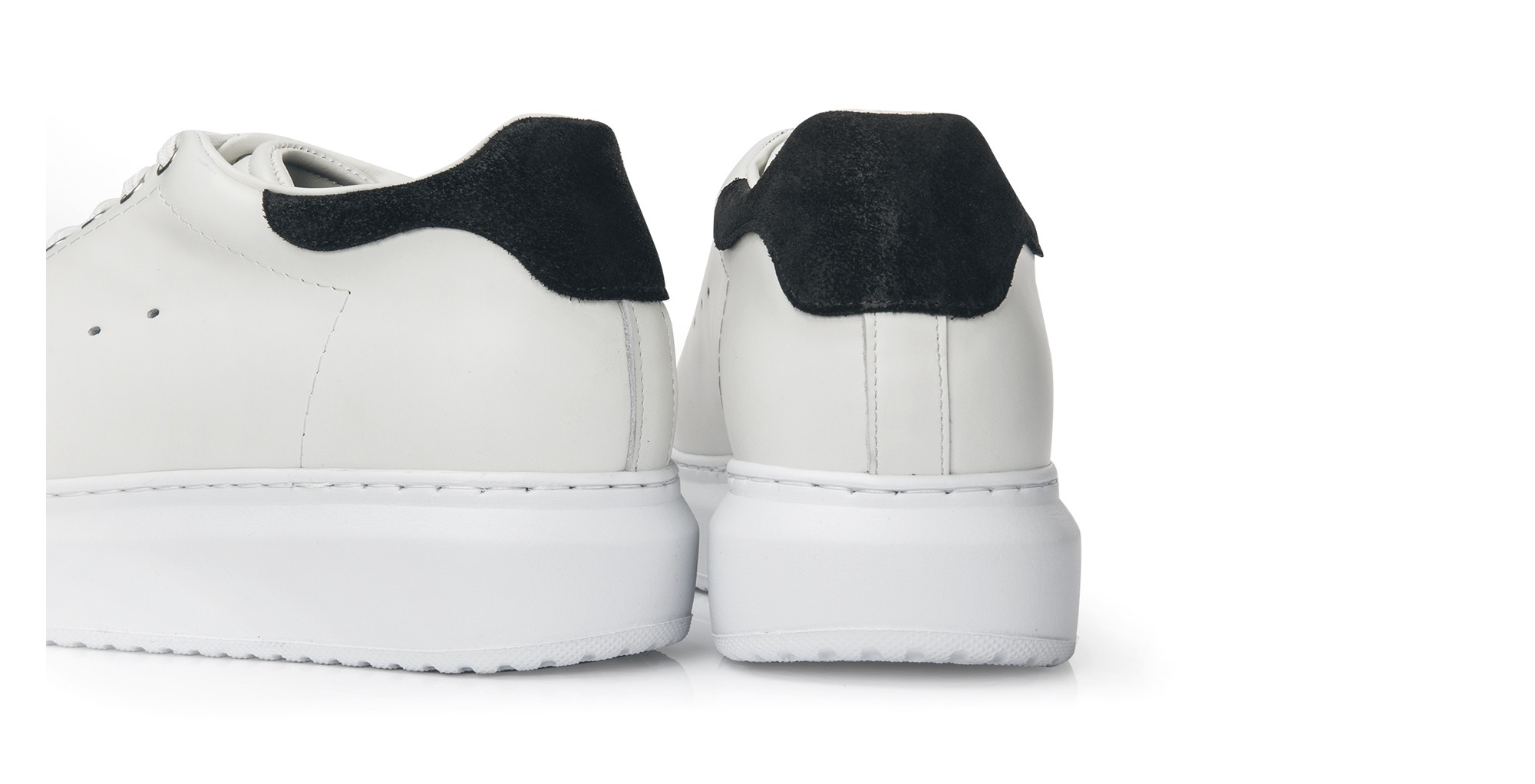 Elevator sneakers with an essential and contemporary design made with upper in white Tuscan full-grain leather and heel tab in black greased calf leather. The white sole is in extralight rubber.