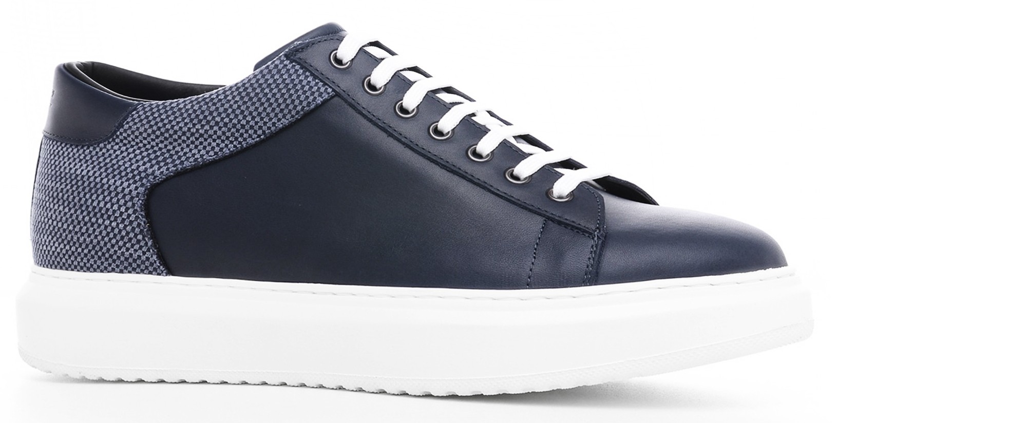 Height increasing sneakers with upper in navy blue full grain leather with denim patterned organic cotton details and comfortable outsole in ultra-light rubber.