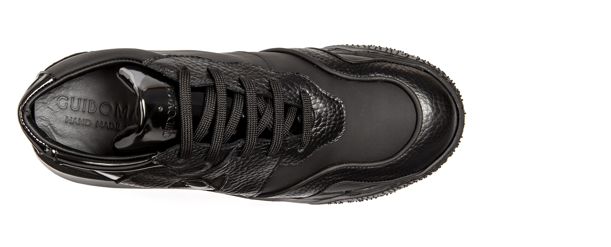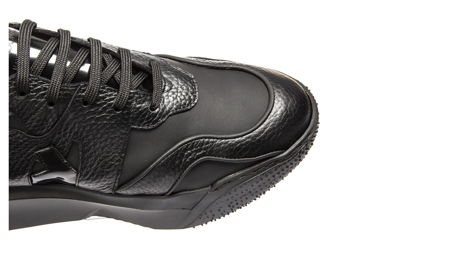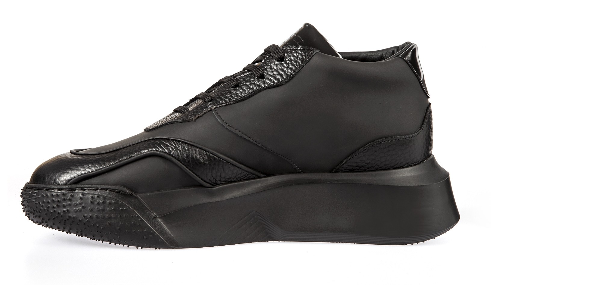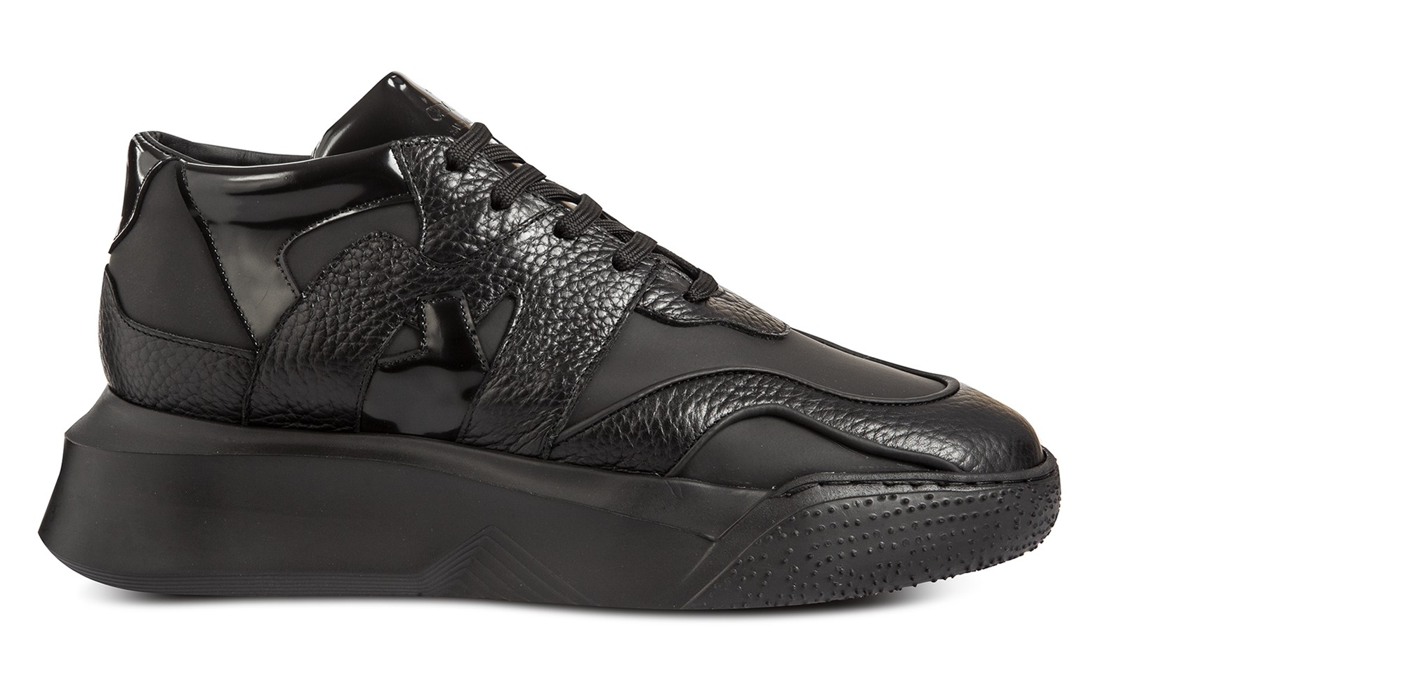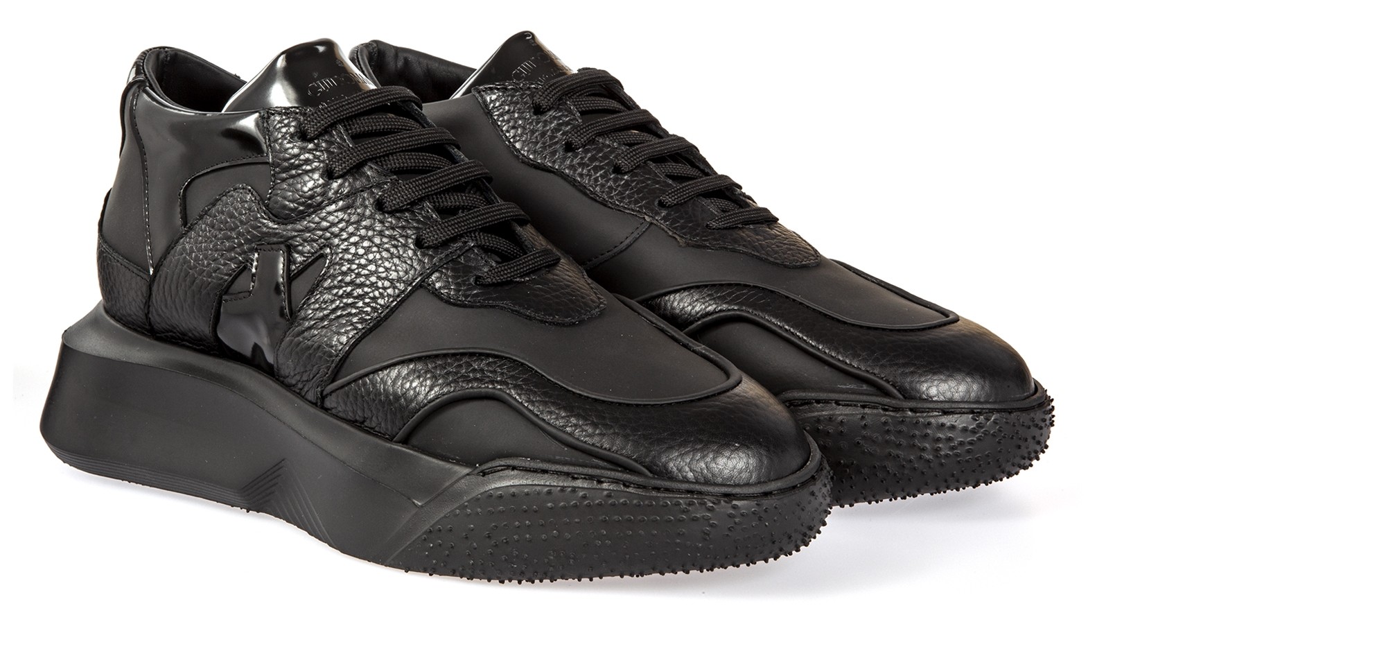 Urban mood: chunky elevator sneakers inspired by the street style with upper made using 3 different black leathers: hammered, brushed and rubberized clafskin. The thick and irregular shaped sole is made of super-light natural rubber.