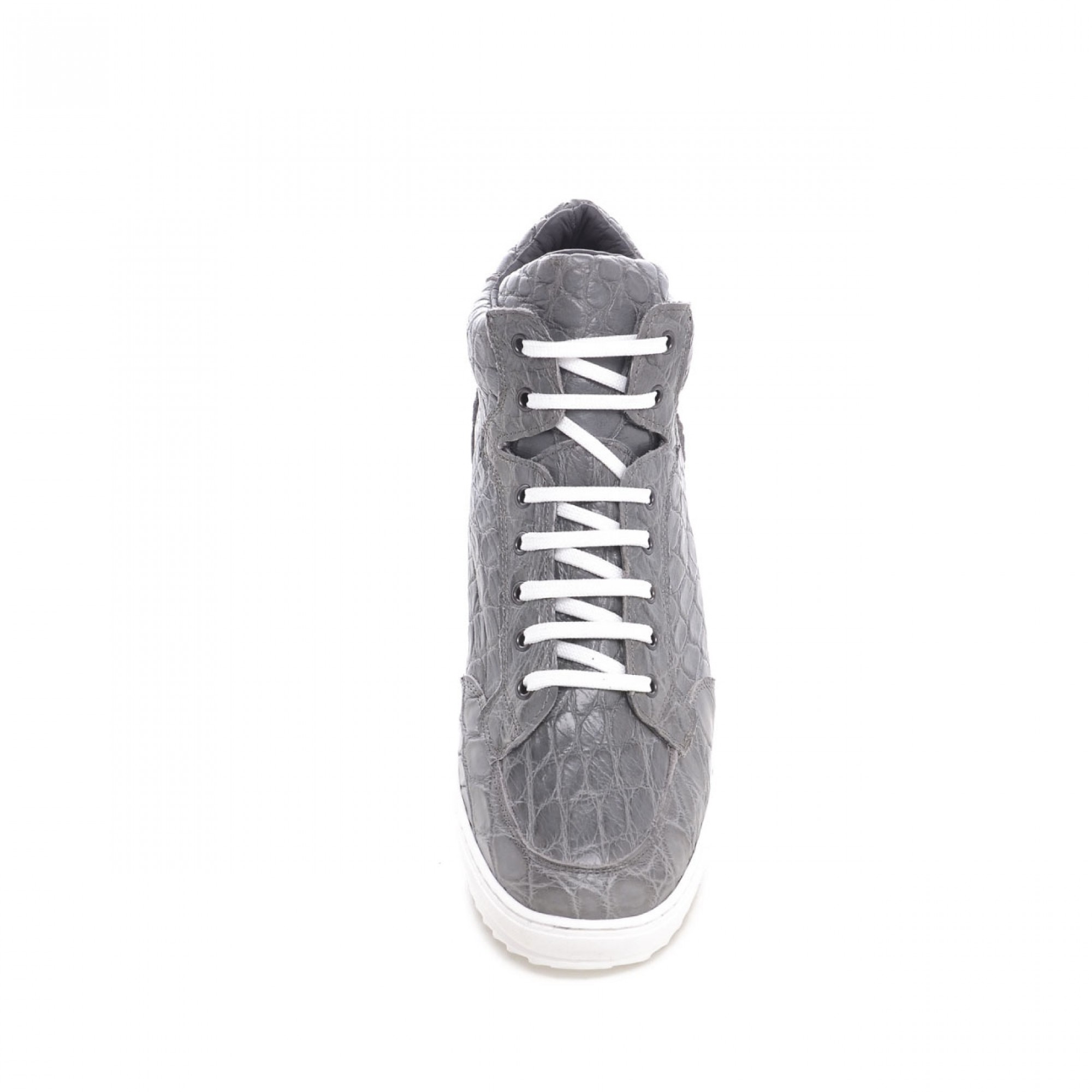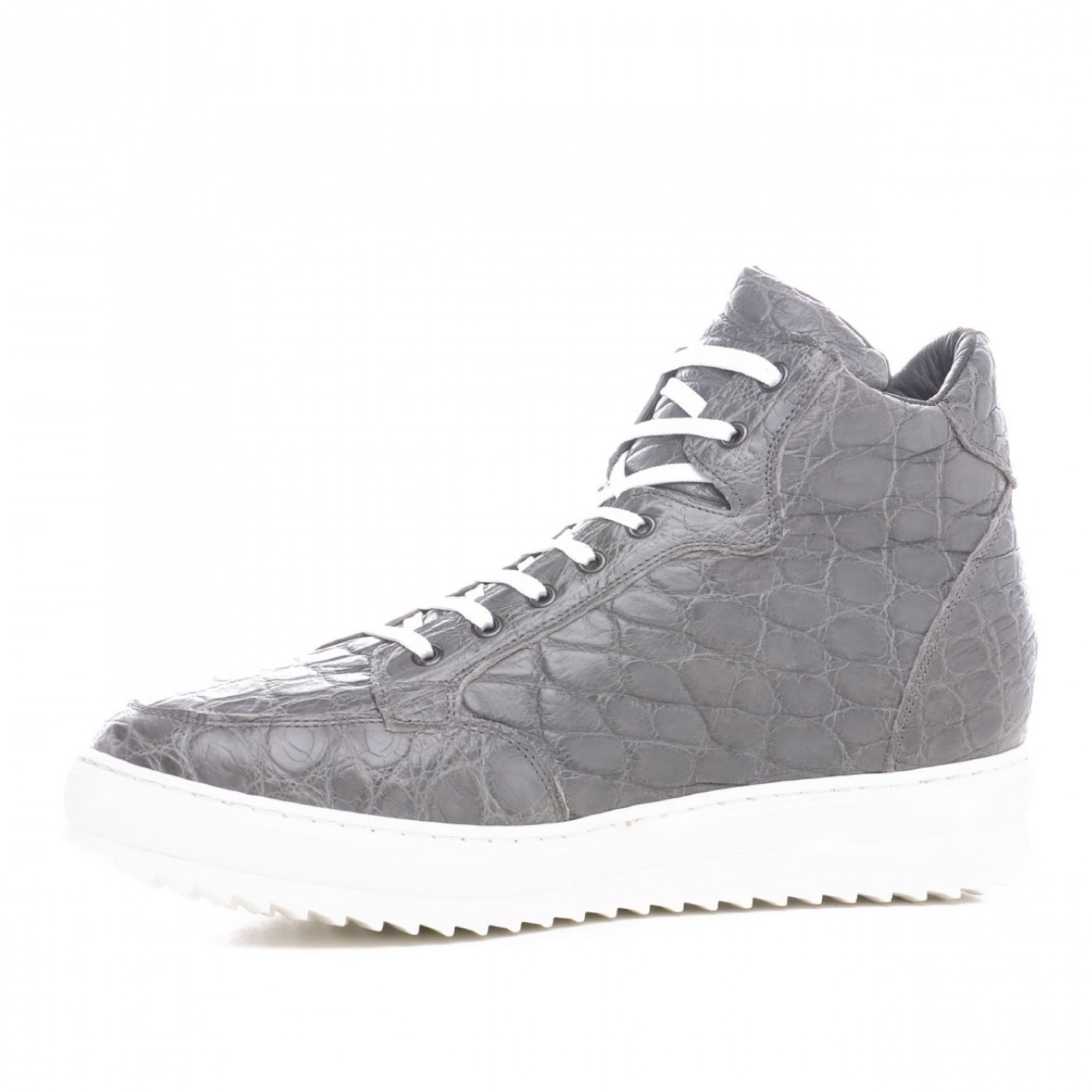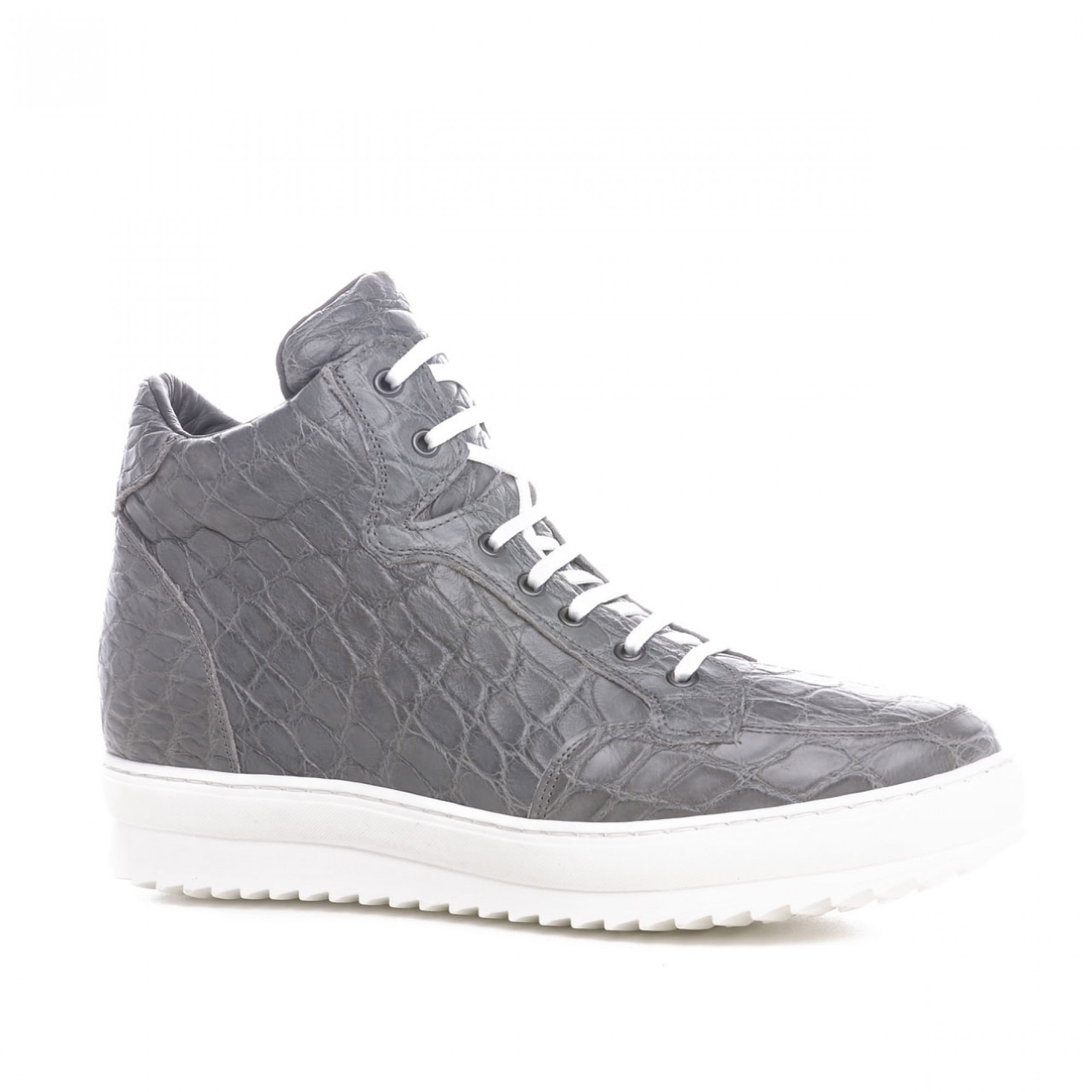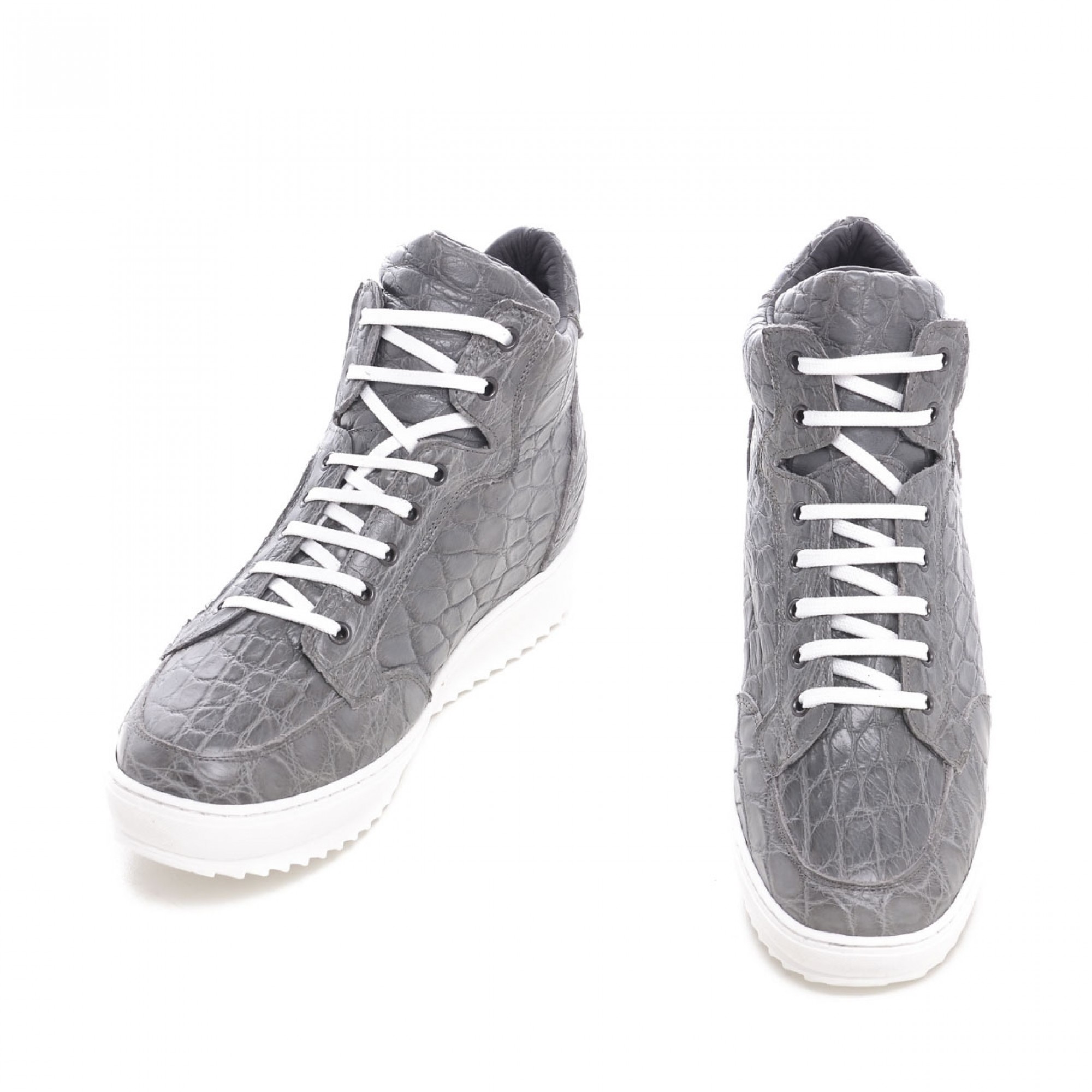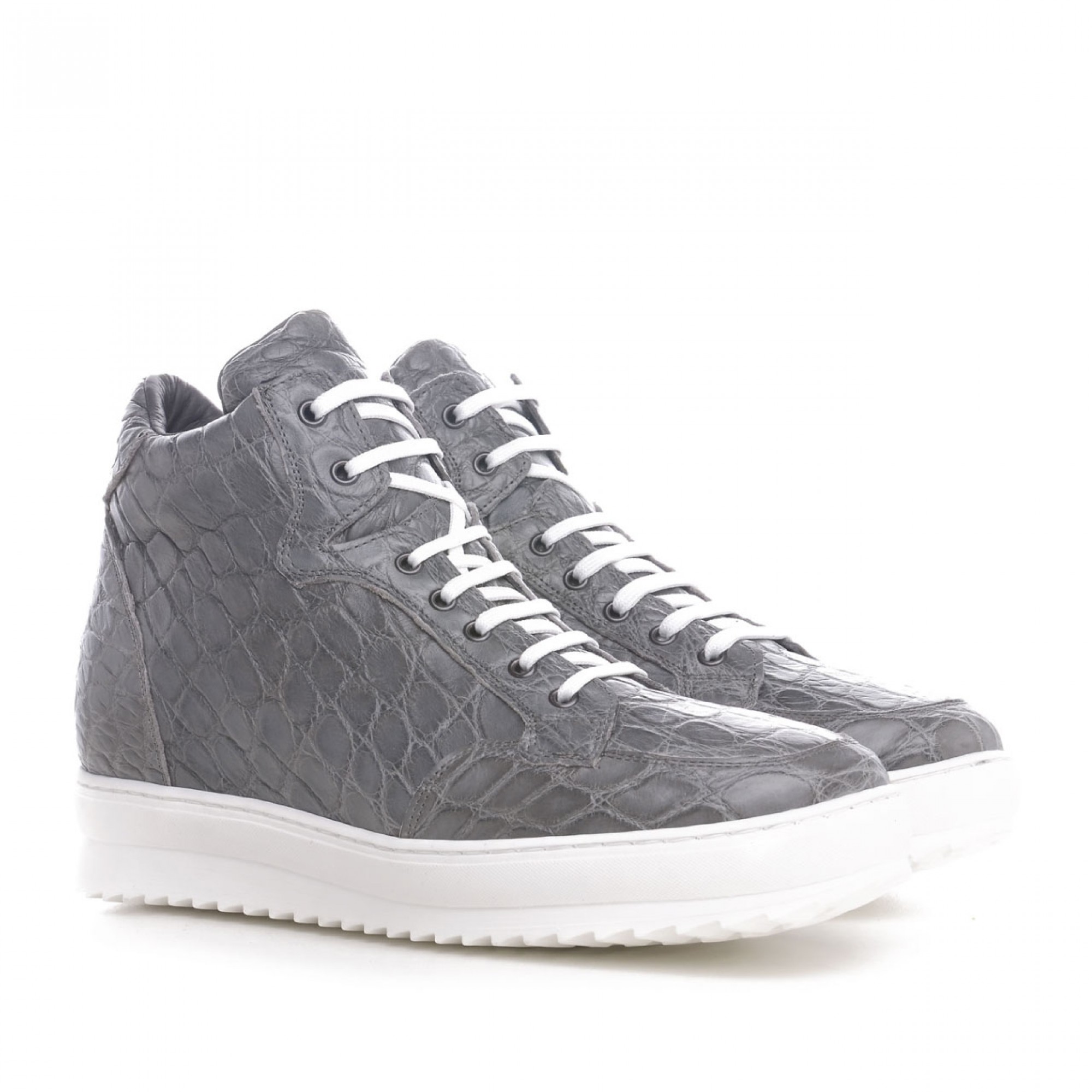 Exclusive and finely crafted high-top elevated sneakers featuring upper in luxurious Hermès gray crocodile leather and white sole in super-light natural rubber.
