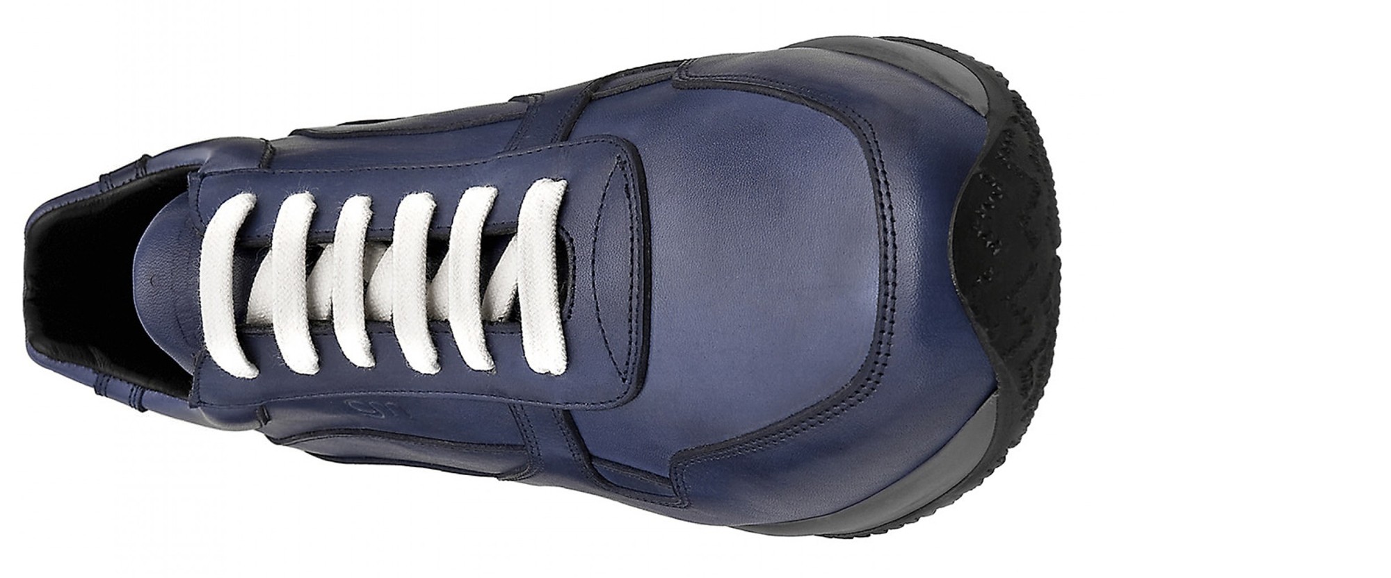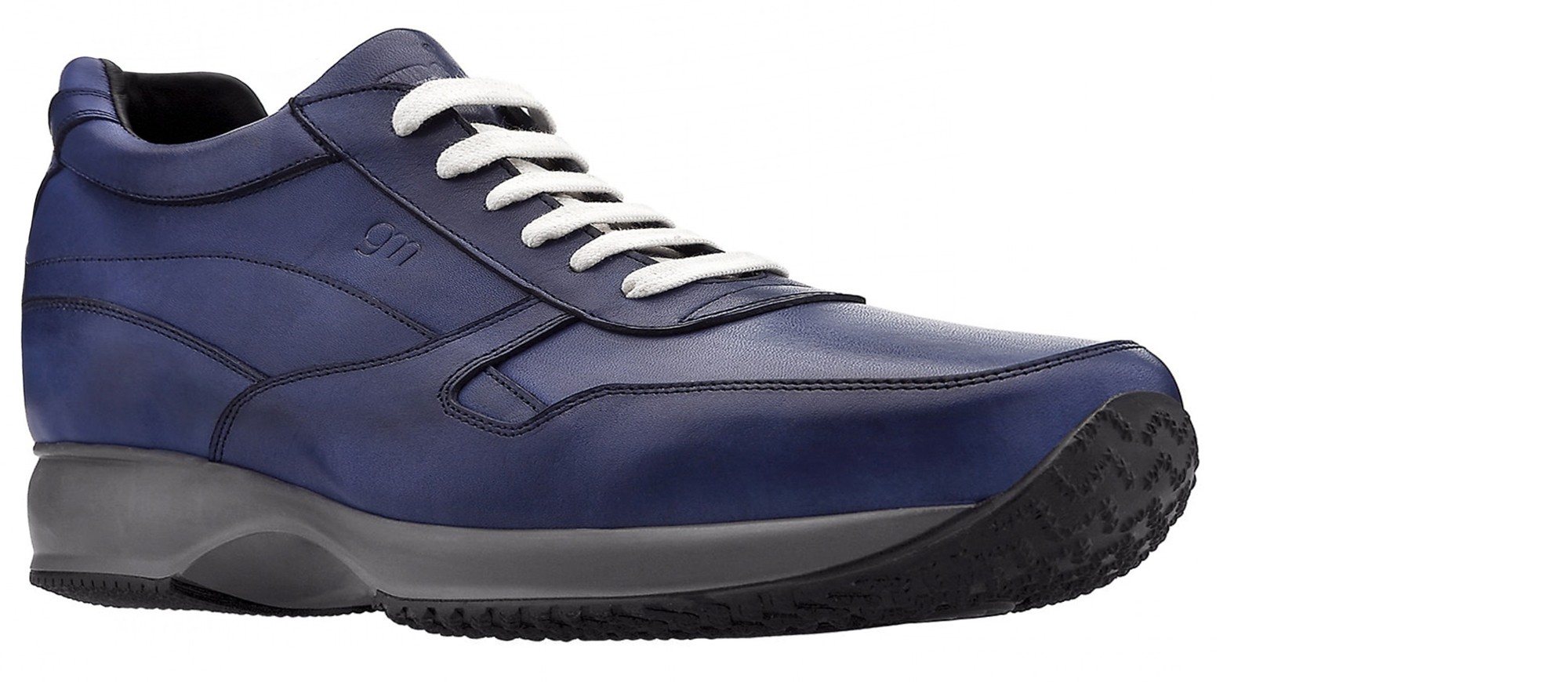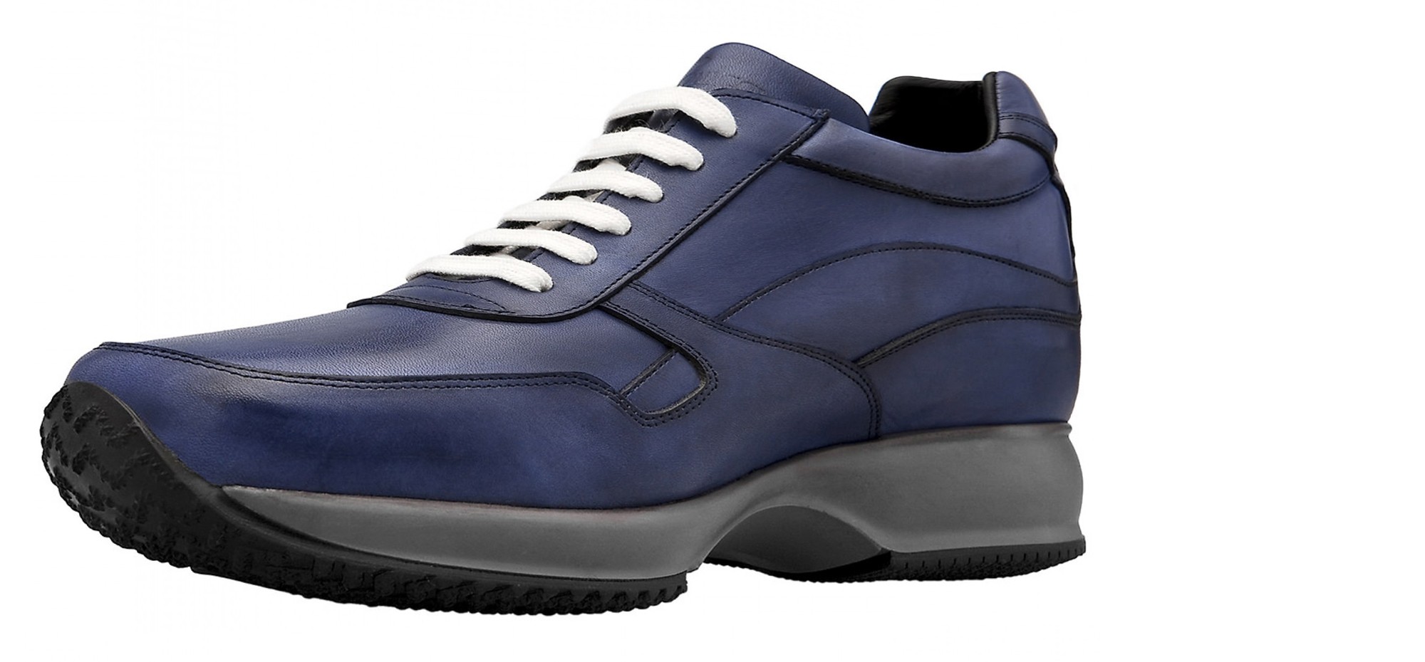 Upper in blue burnished full grain leather. Lining in soft goatskin. Insole in genuine leather. 2 pairs of cotton shoe laces. Lightweight high quality rubber outsole anti-slip. Height increase: 2.4in(6cm), 2.75in(7cm), 3.1in(8cm) or 4 in(10cm). Hand Made in Italy