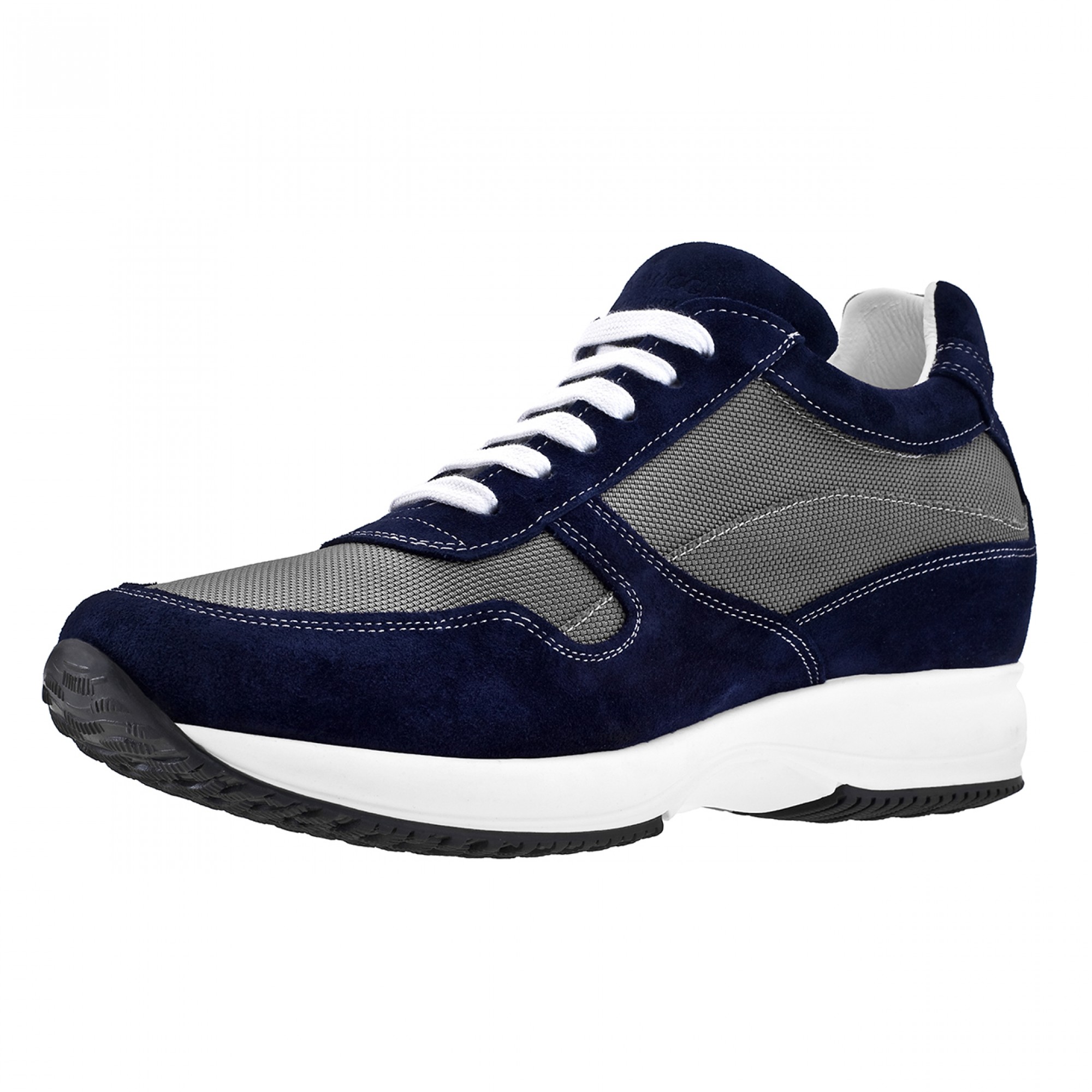 Upper in blue navy suede calf leather and grey technical fabric. Lining in soft goatskin. Insole in genuine leather. Lightweight high quality rubber outsole anti-slip. Height increase: 2.4in(6cm), 2.75in(7cm), 3.1in(8cm) or 4 in(10cm). Hand Made in Italy