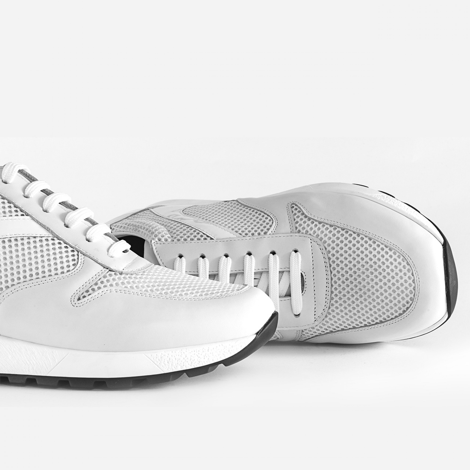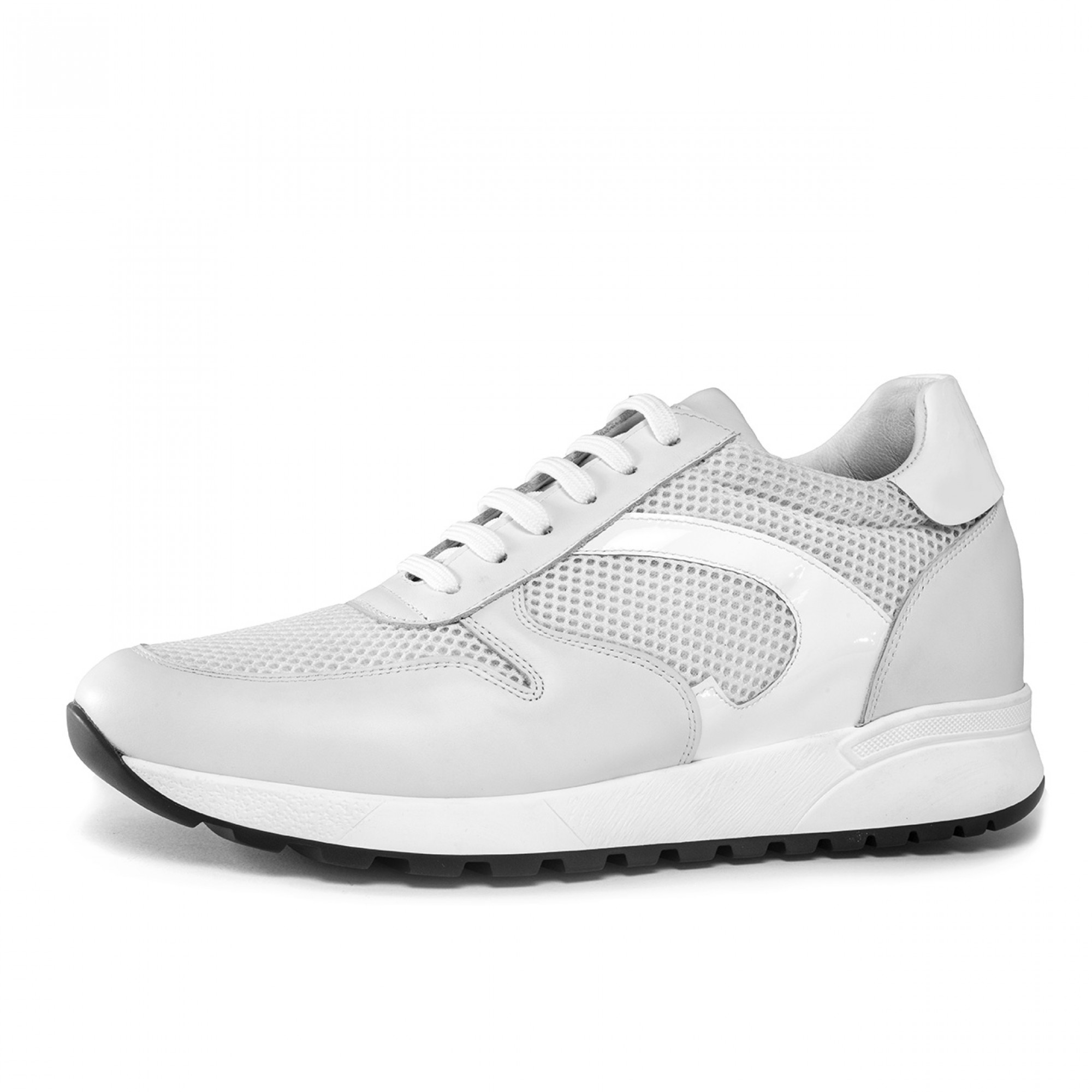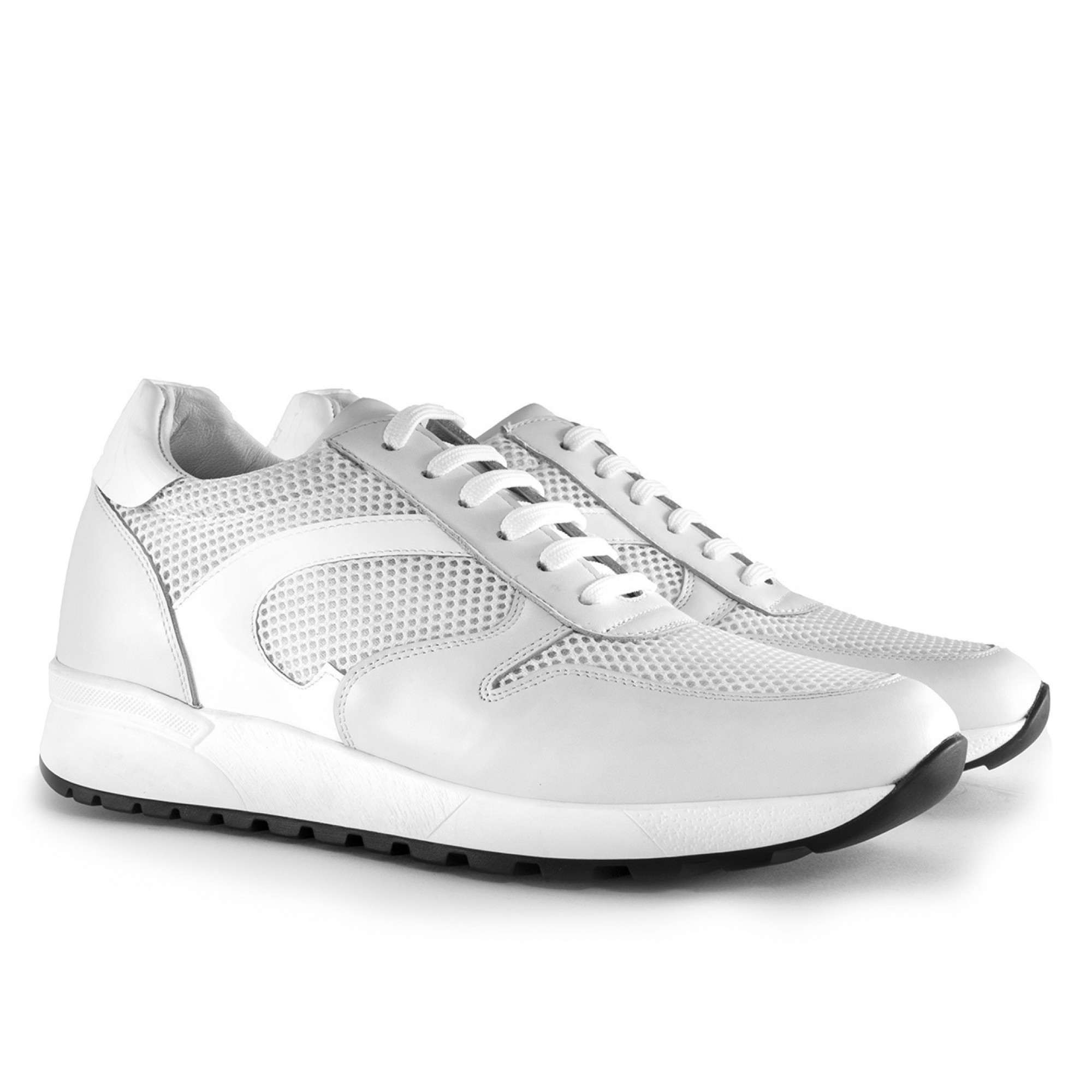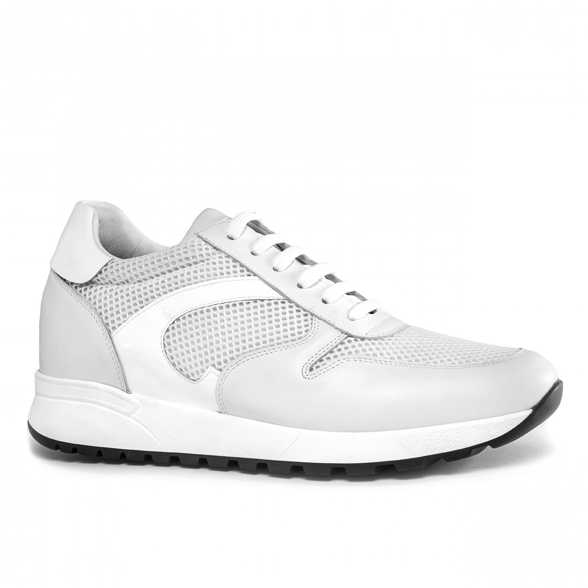 Sneakers with internal elevator system from 2.4 (6 cm) up to 3.1 inches (8 cm) featuring upper in white full-grain leather, patent leather details and fresh tone-on-tone perforated technical fabric. The sole is made of super light natural rubber.