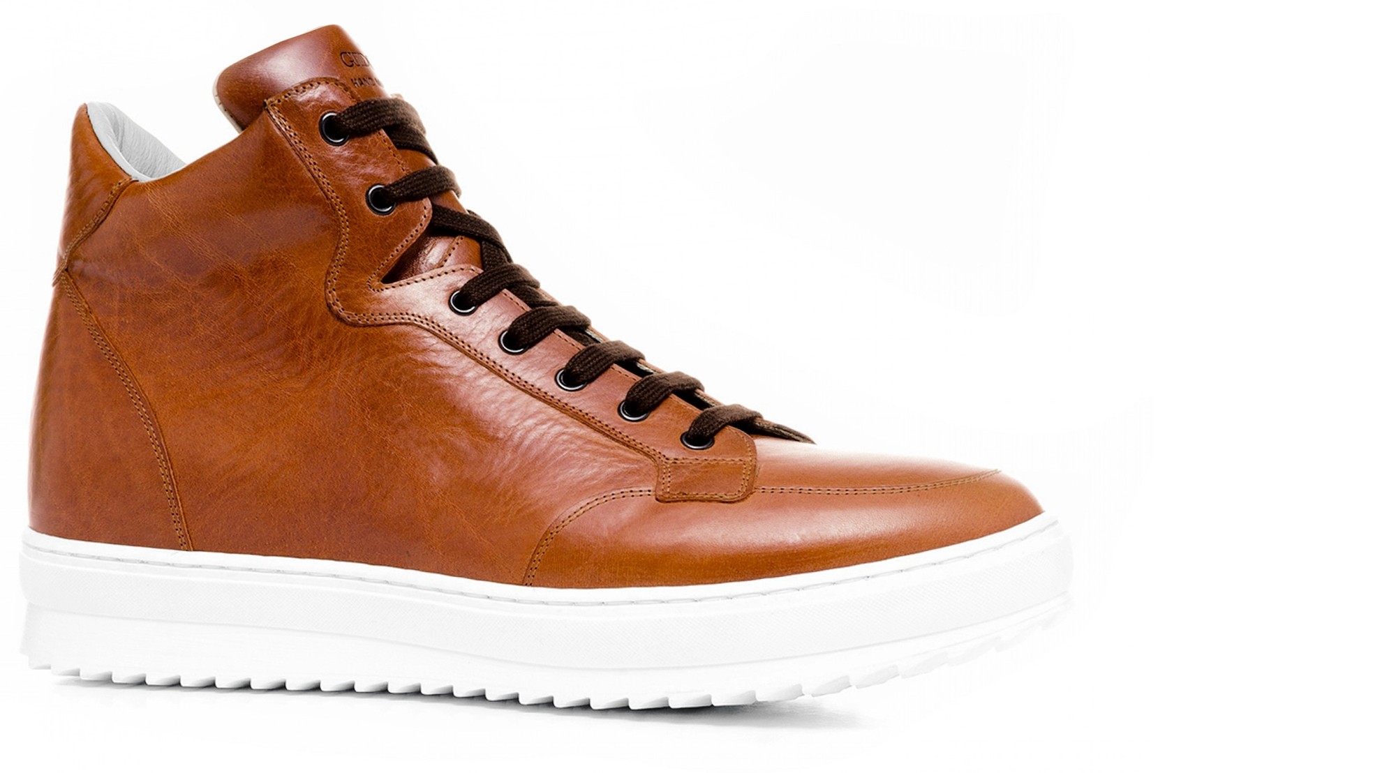 Named " Worth Avenue " The new elevator sneakers in natural tanned cognac full-grain leather by GuidoMaggi. The specific treatment used gives the shoes a vintage effect. The warm inner lining made of soft goatskin, ensures maximum comfort. The insole is made of genuine Italian leather while the white outsole of the latest generation is super light rubber with anti slip. The invisible and anatomic increaser - depending on needs - can be selected from 6 cm, 7 cm, 8 cm, 10 cm. GuidoMaggi's artisans allow a range of possibilities for customization.