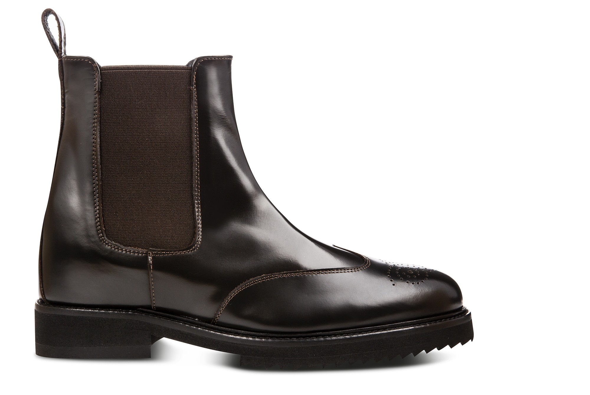 A Chelsea-inspired ankle boot with smooth dovetail and a distinctive flower toe. Light, resistant and comfortable, this ankle boot has a dark brown brushed calfskin upper and a micro sole with toothed tread and elastic silk.