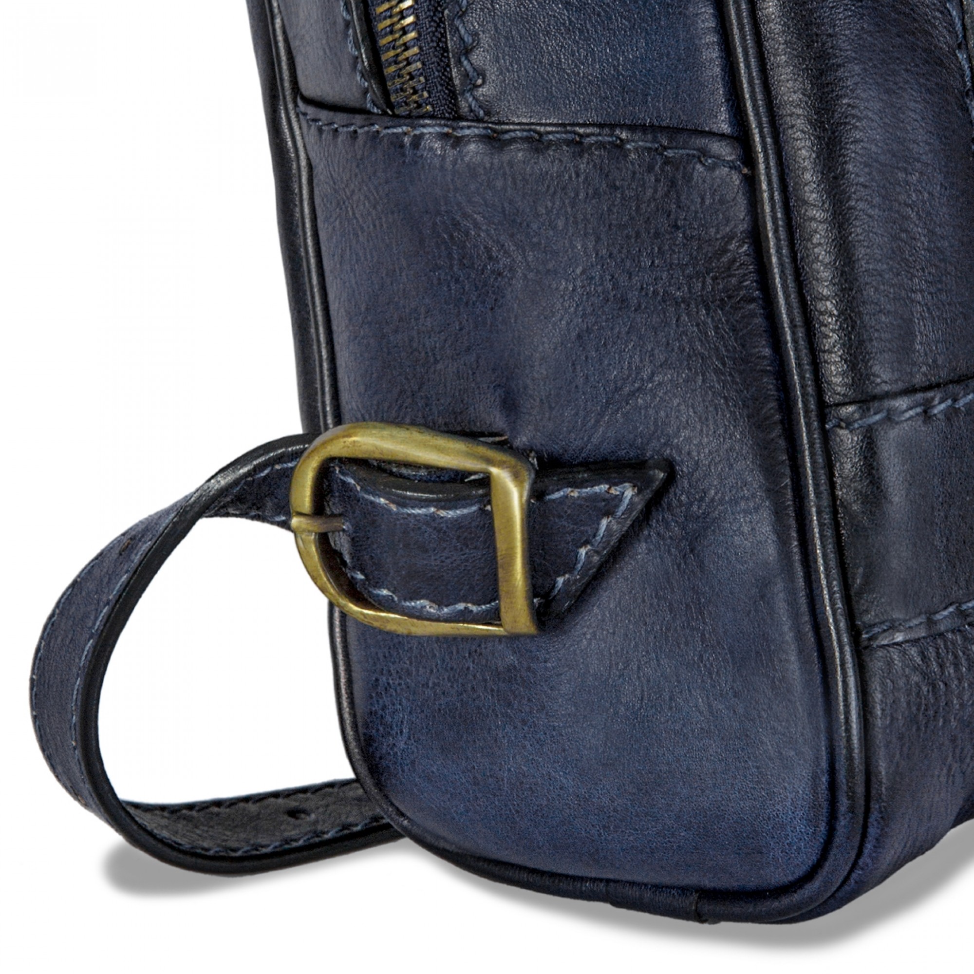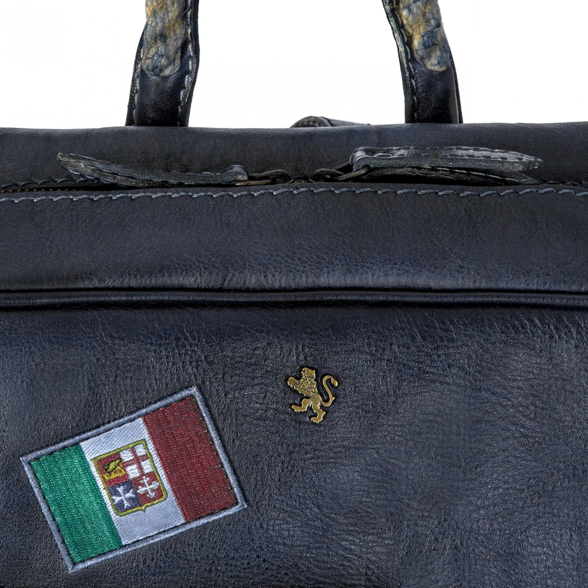 Firenze Blue features a closure secured by a zip and internal LED light. Top handle with two cross over buckle shoulder adjustable straps. Handmade in Italy.