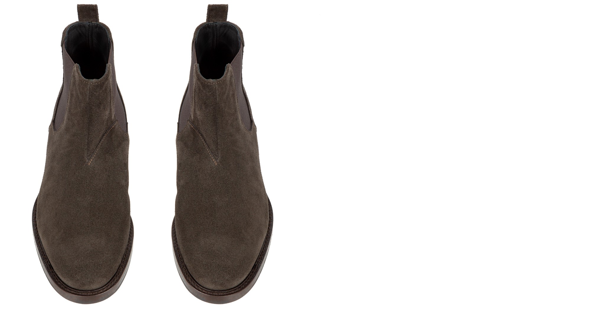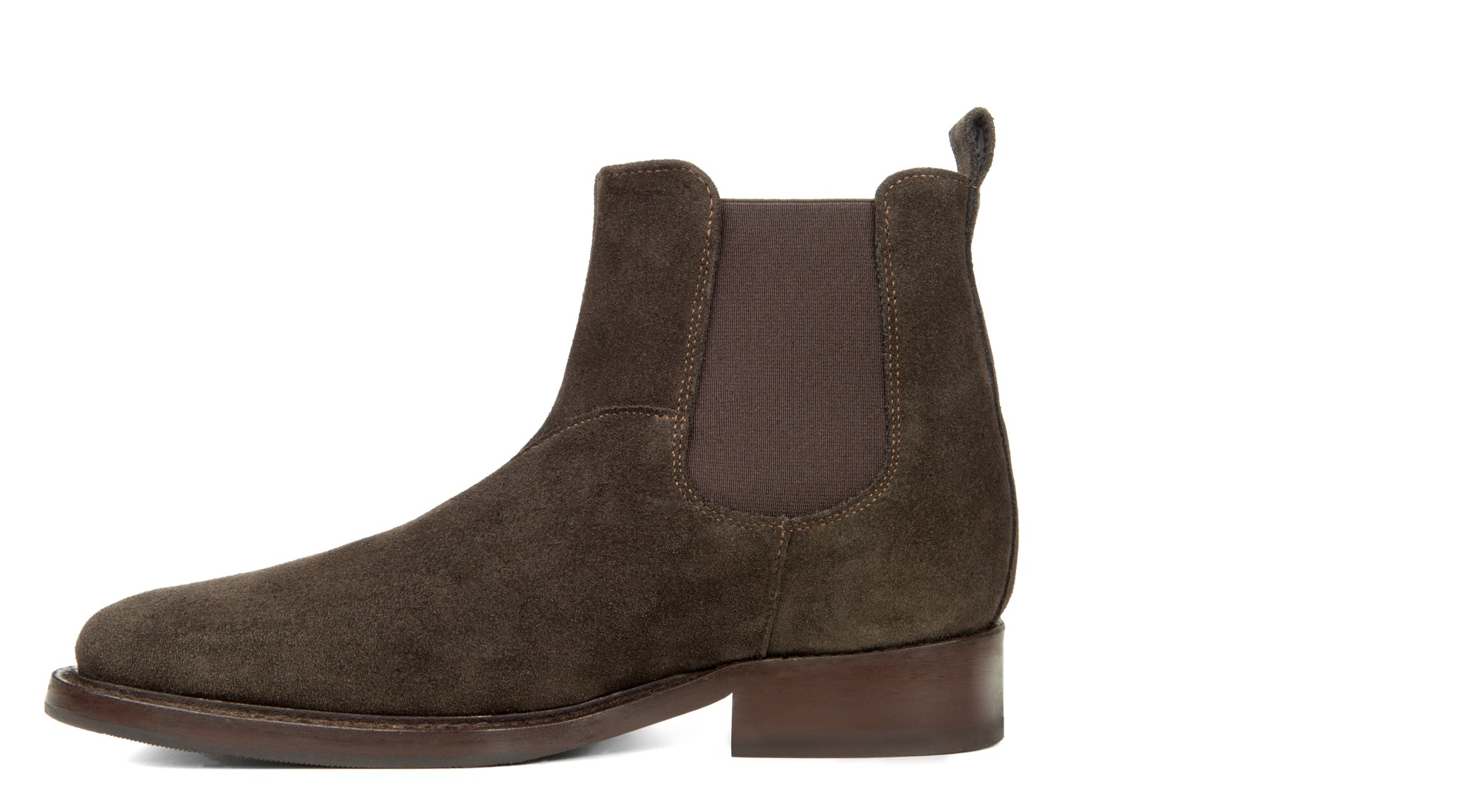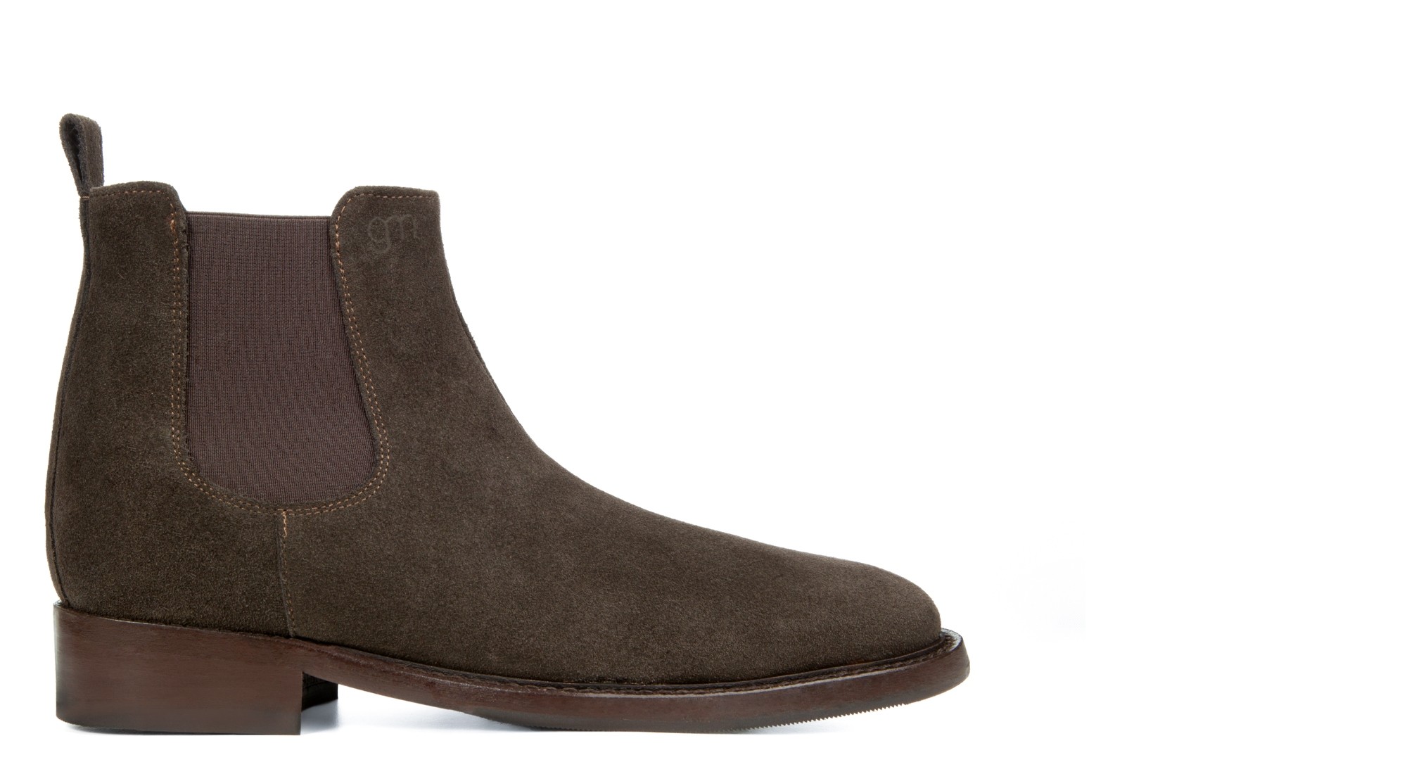 Handcrafted elevator chelsea boot with upper in dark brown suede calfskin, tone-on-tone side elastic panels and real leather sole with anti-slip rubber.
