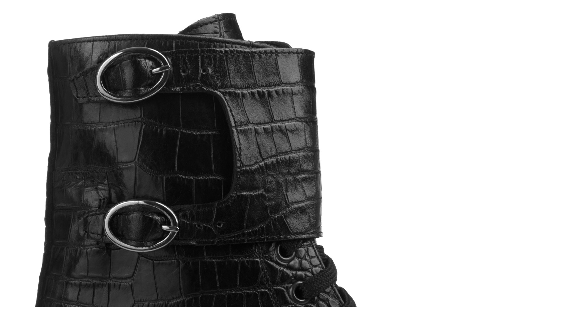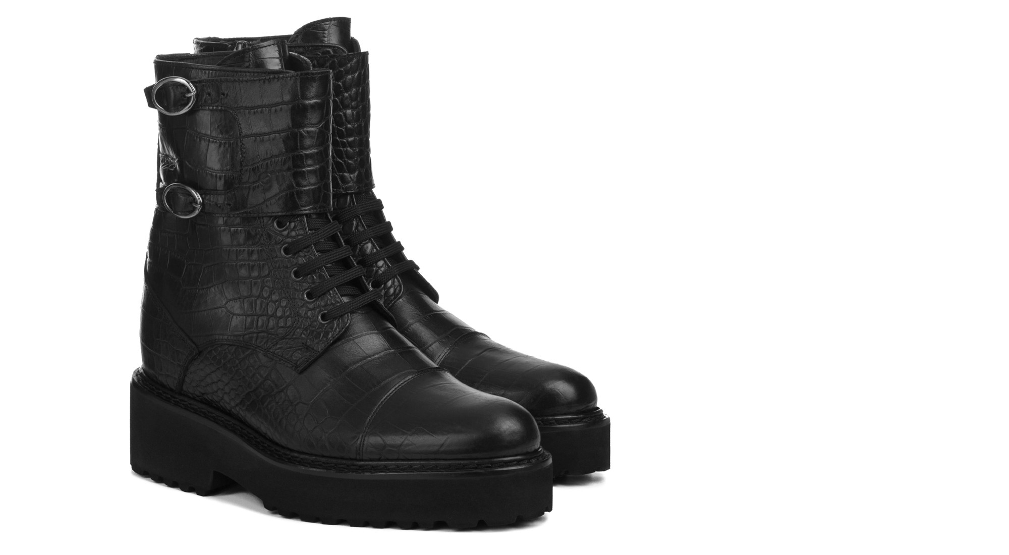 The upper is in calfskin with a refined crocodile print effect. It features both laces and a double buckle closure. Soft, rounded tip. Handmade in Italy.