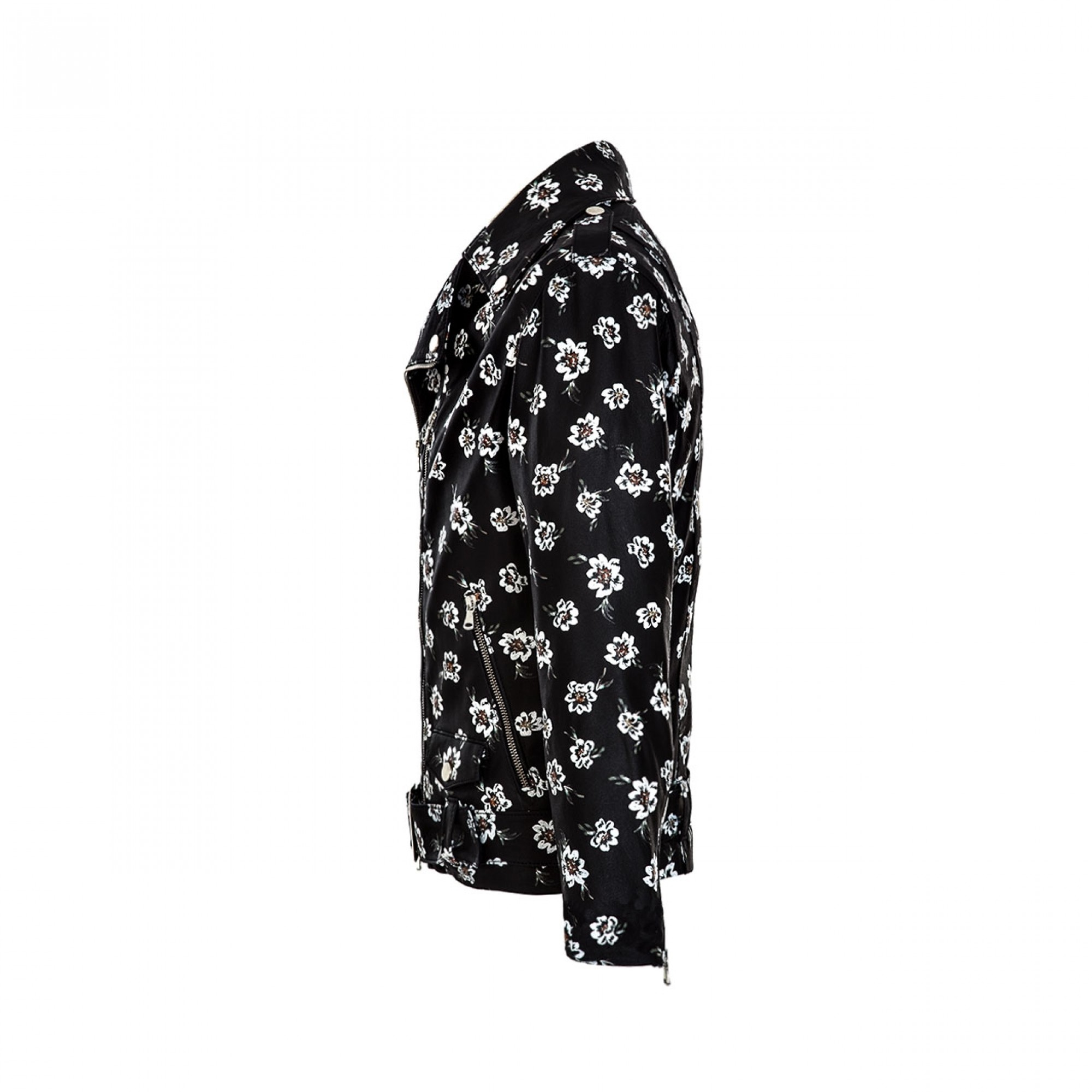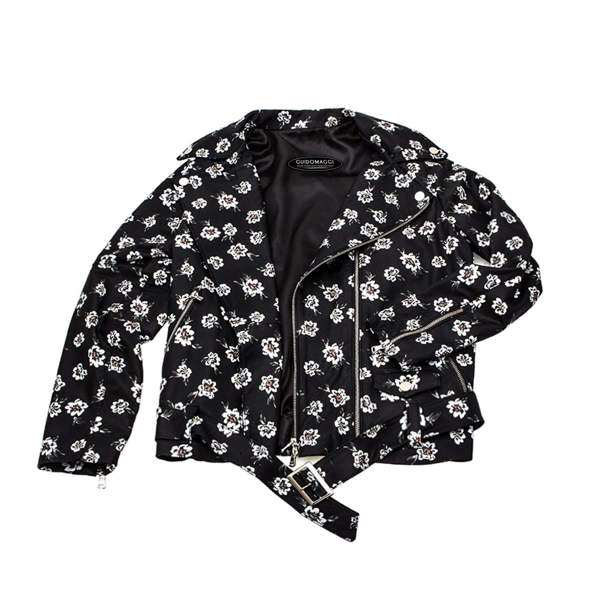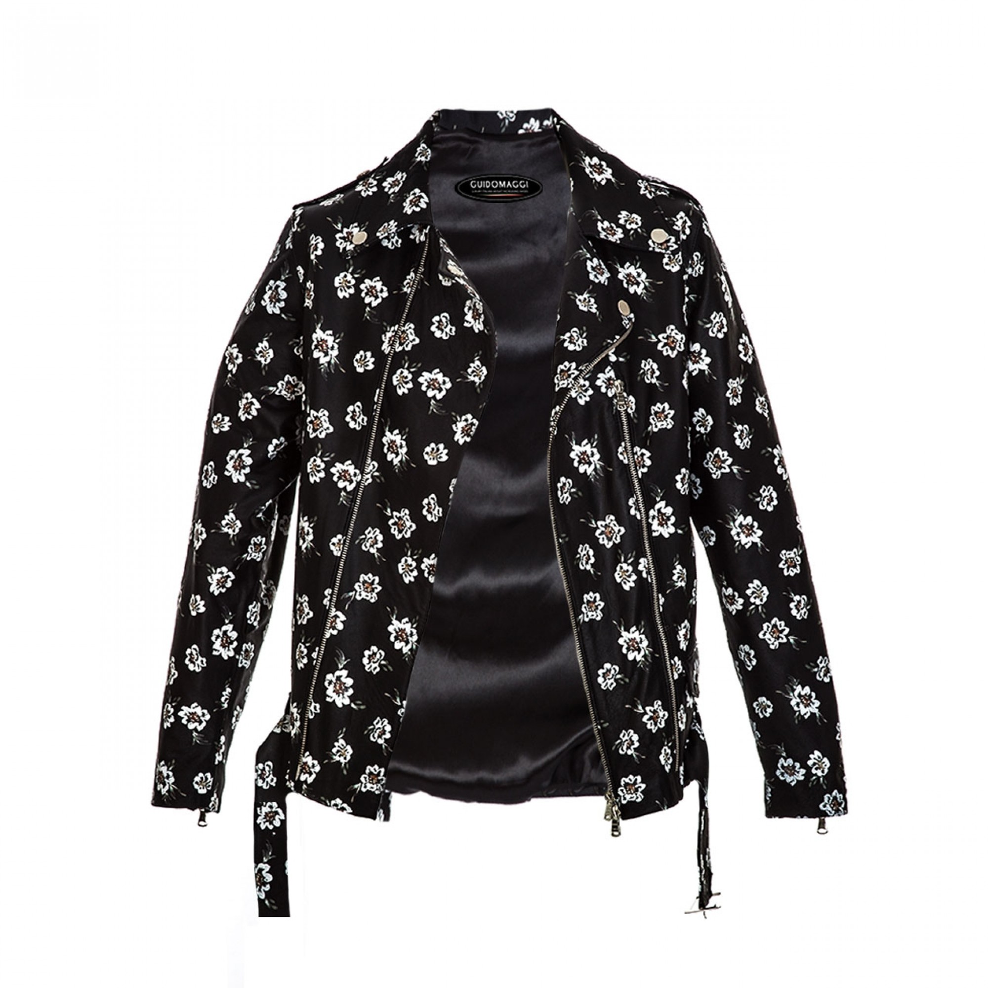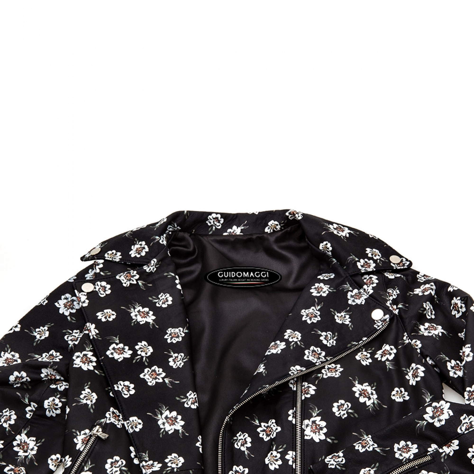 Exclusive biker jacket made of black calfskin featuring super trendy floral print and tone-on-tone customizable silk inner lining. Side zip pockets and silver zip fastening. Waist belt and pocket. Slim-fit. Handcrafted in Italy.