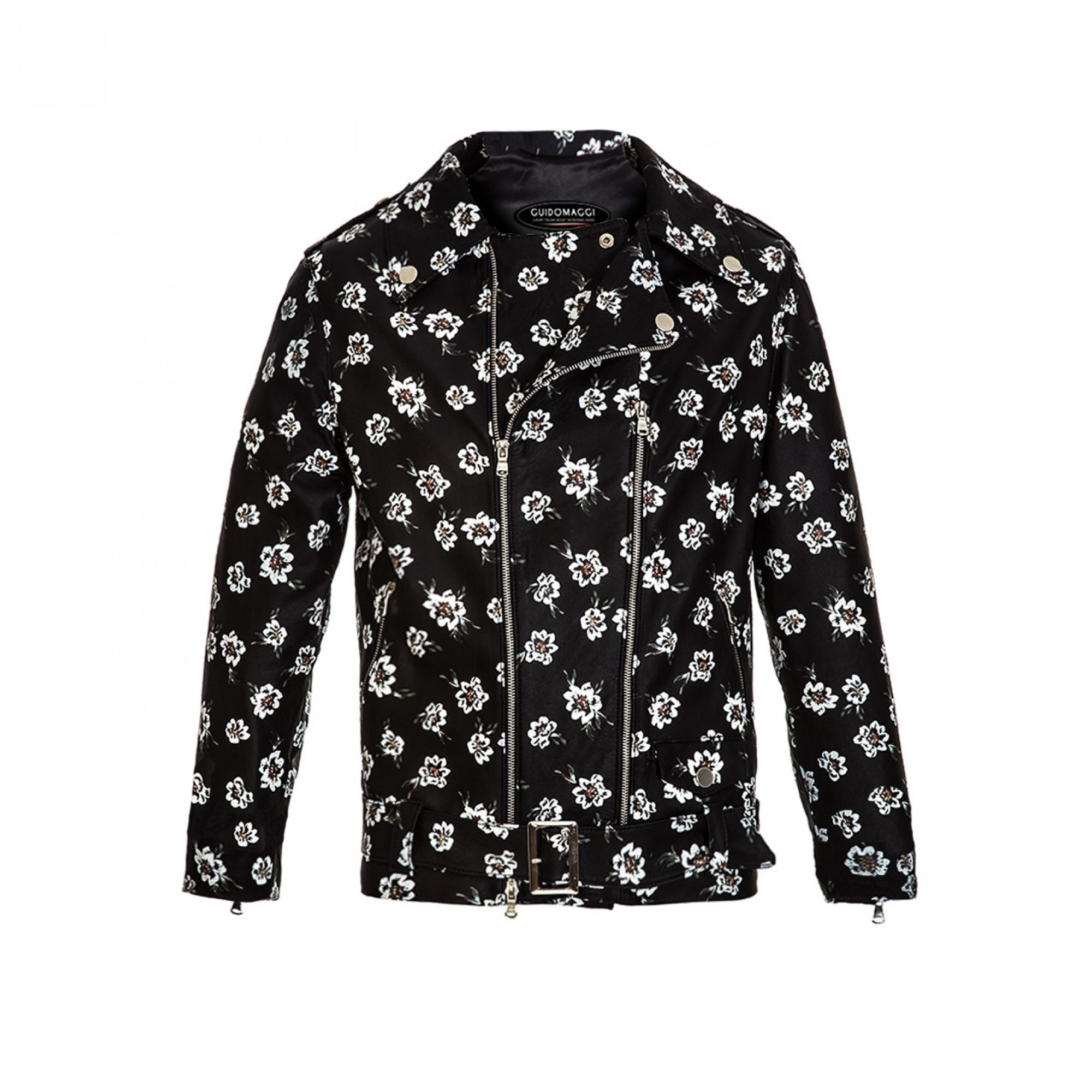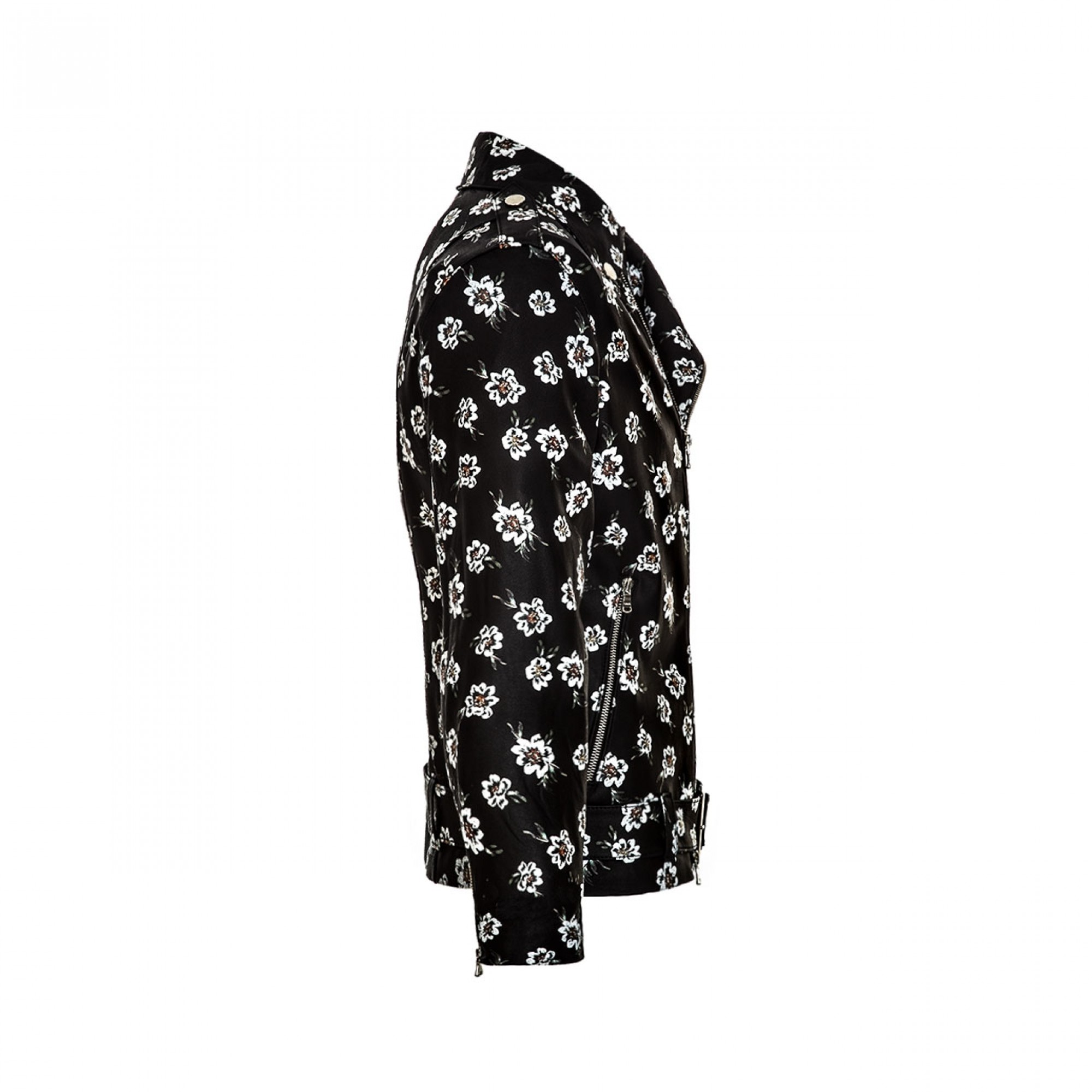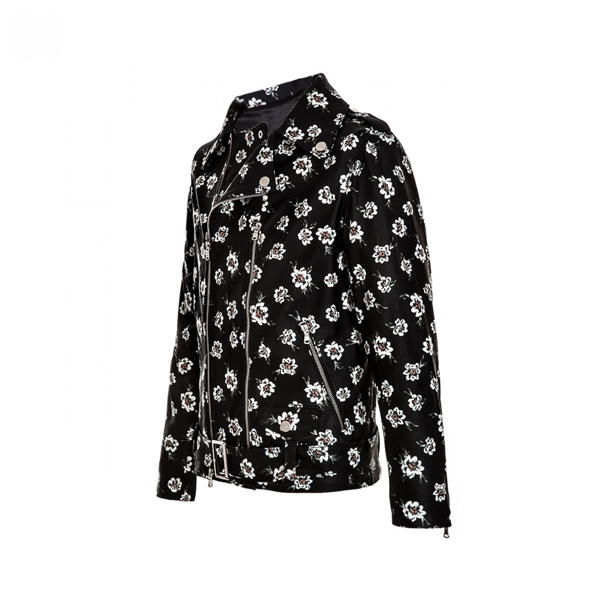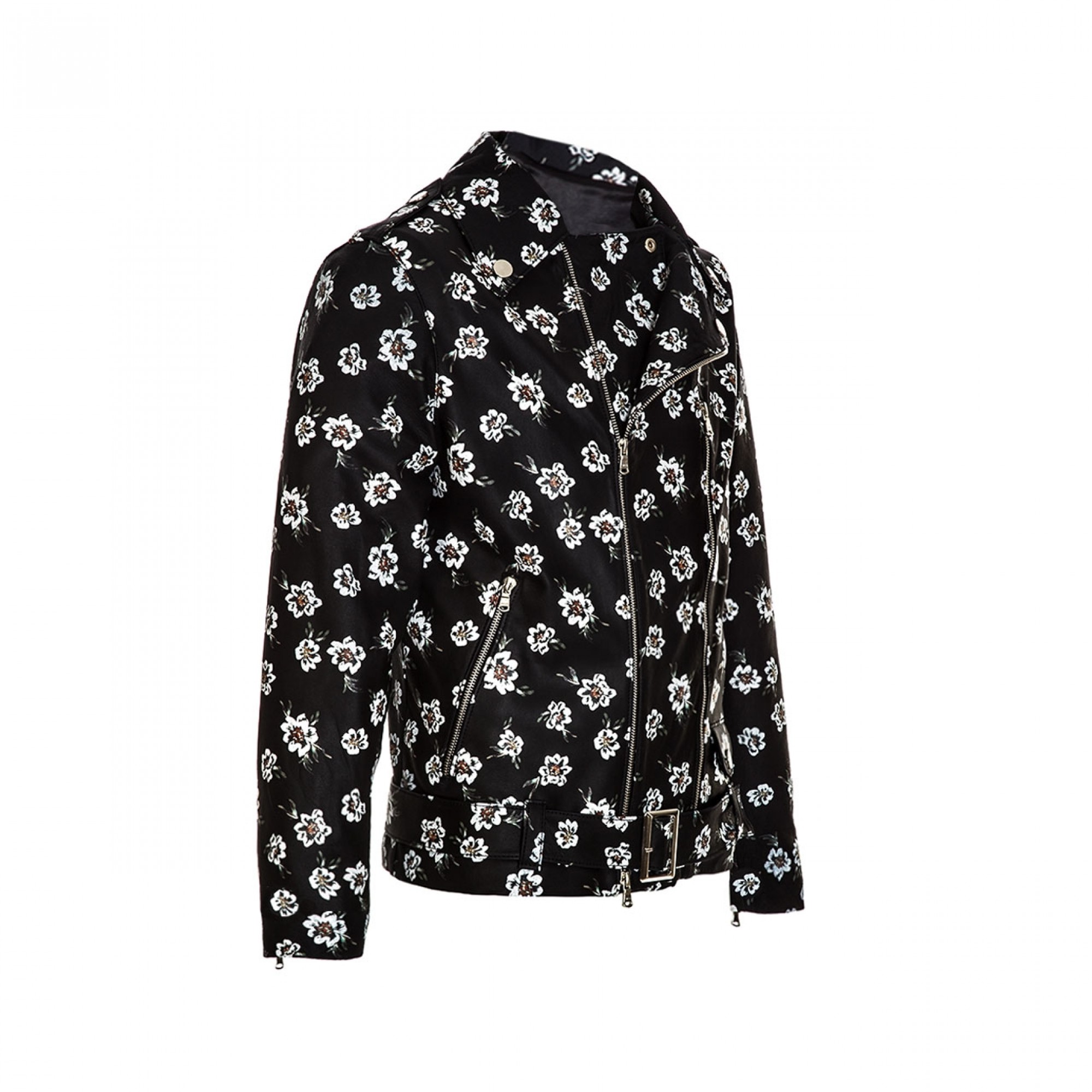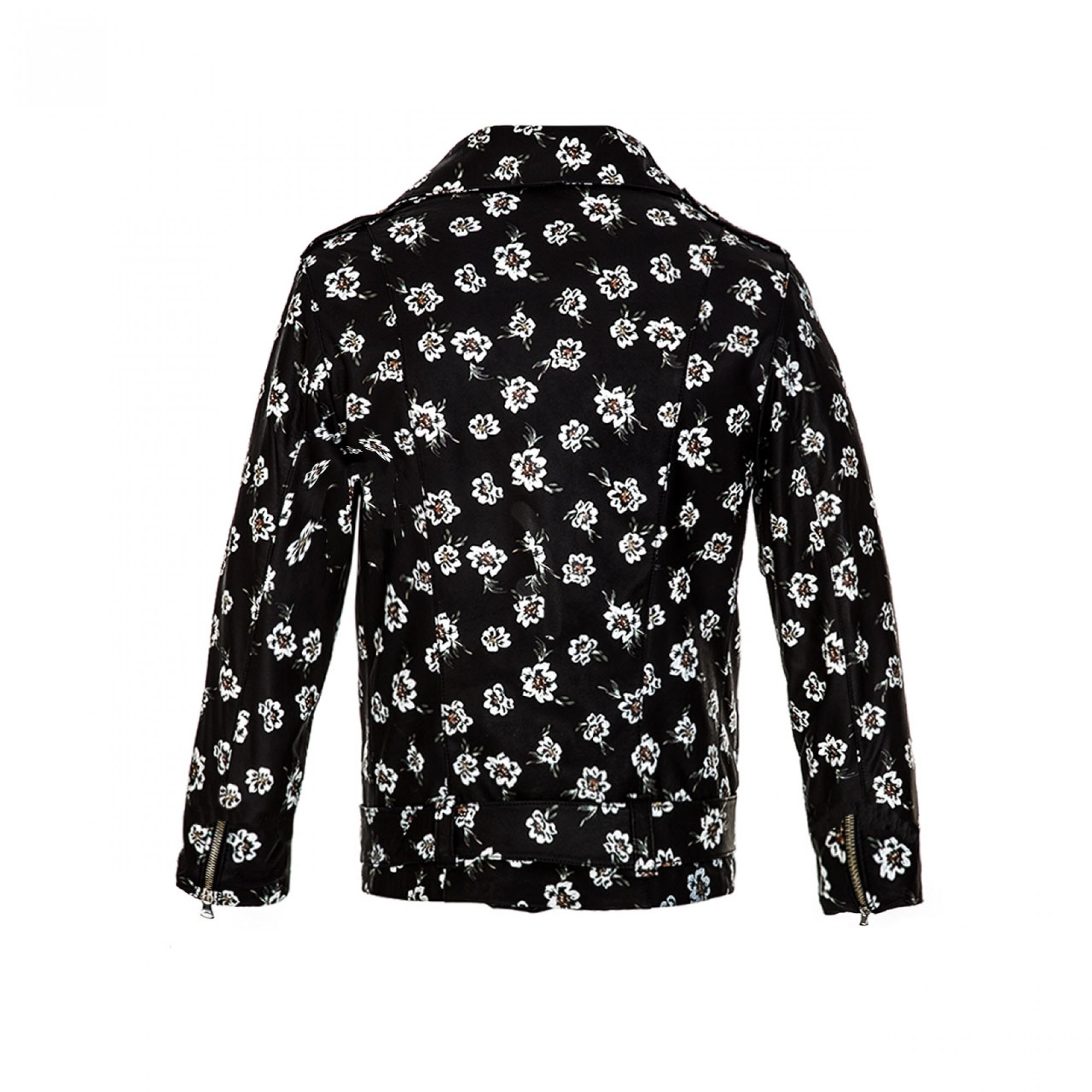 Exclusive biker jacket made of black calfskin featuring super trendy floral print and tone-on-tone customizable silk inner lining. Side zip pockets and silver zip fastening. Waist belt and pocket. Slim-fit. Handcrafted in Italy.