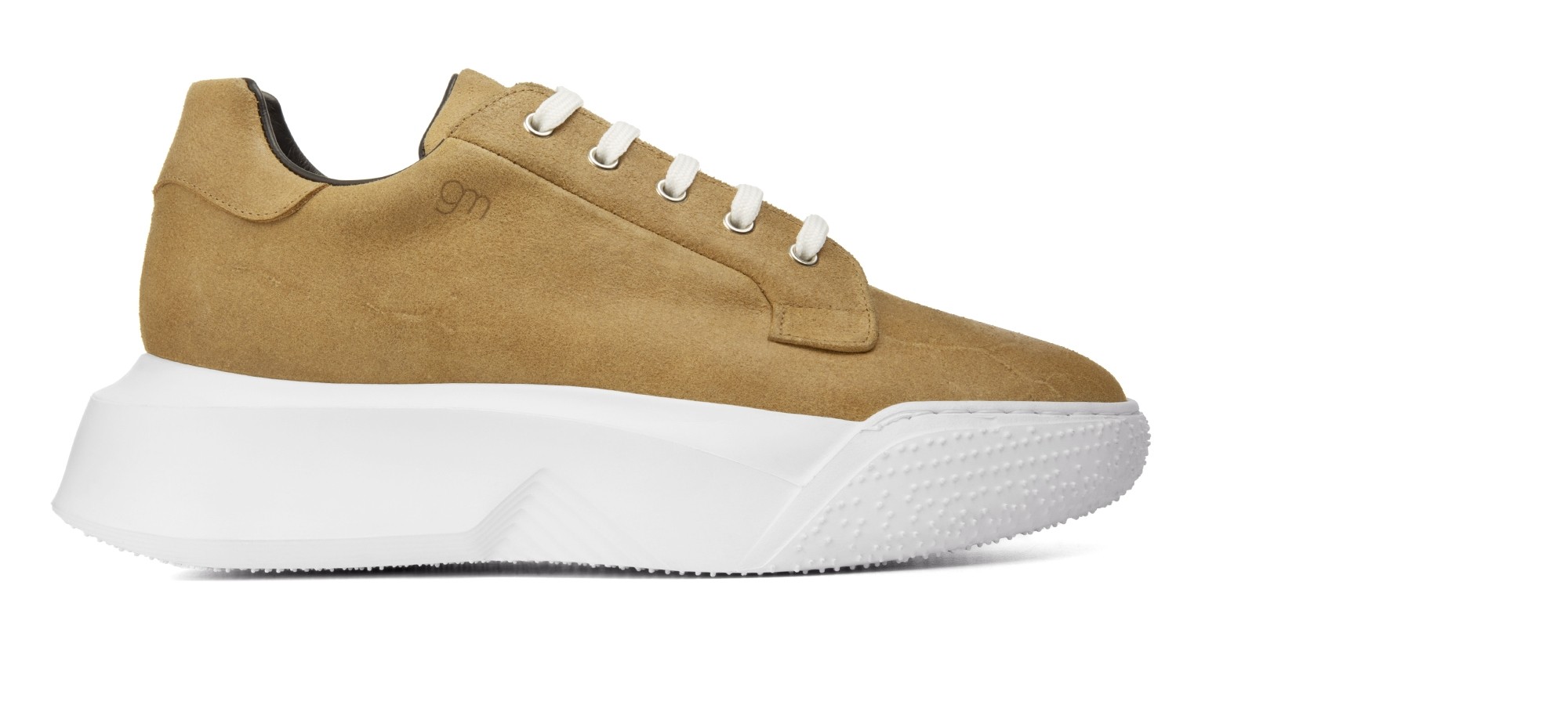 Bold and contemporary, this new GuidoMaggi elevator sneaker has a chunky, comfortable and light anti-slip rubber sole. The exclusive upper in greased waxed cognac calfskin gives it charisma and elegance.
