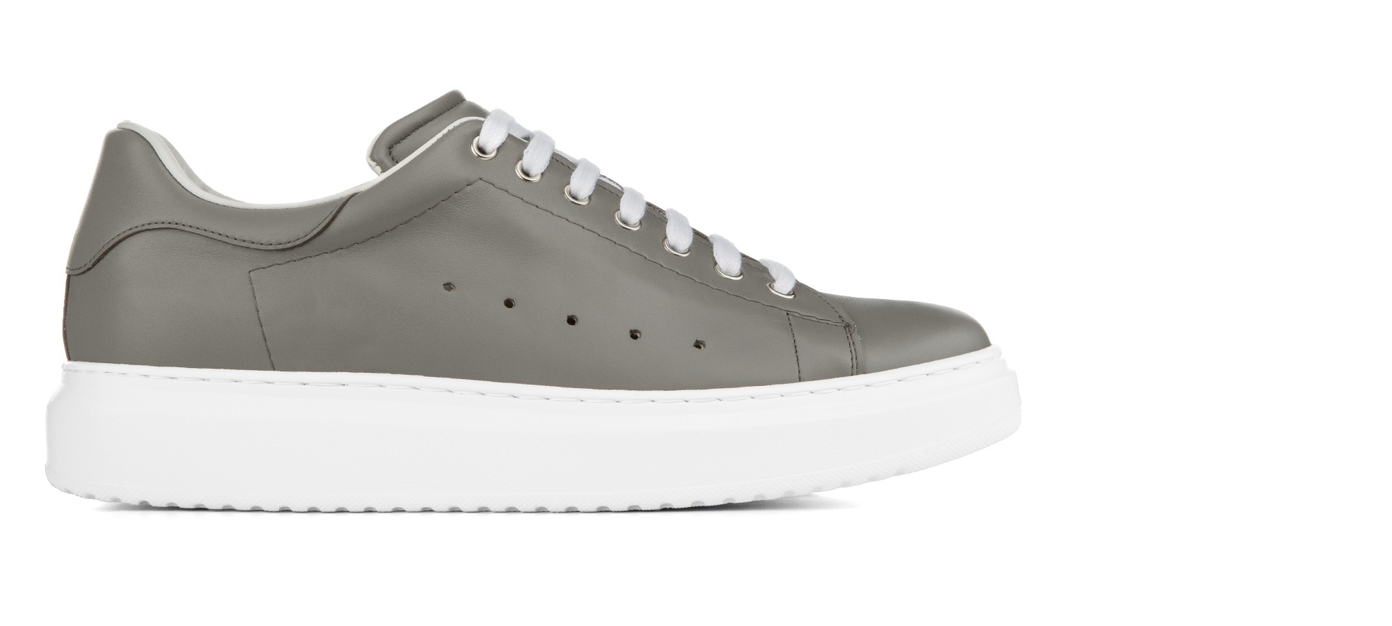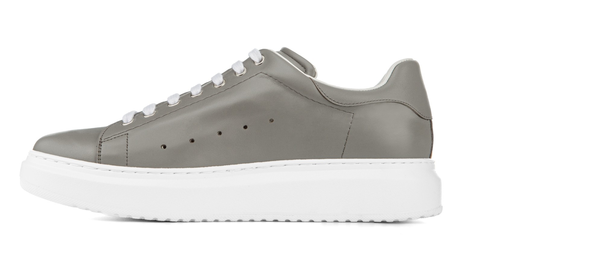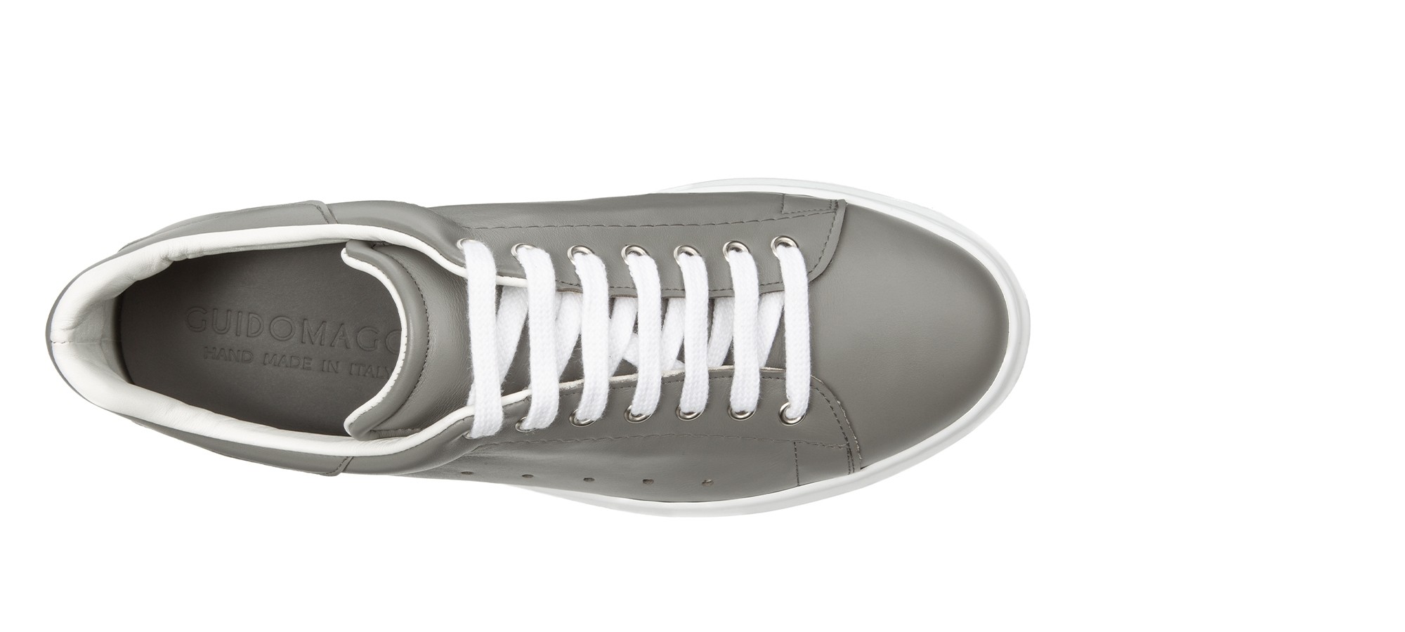 Soft and rounded lines for these elevator sneakers, signed by GuidoMaggi. A model with upper in gray calfskin and sole in white rubber. Ideal for sporty chic souls, it is comfortable, light and extremely versatile.