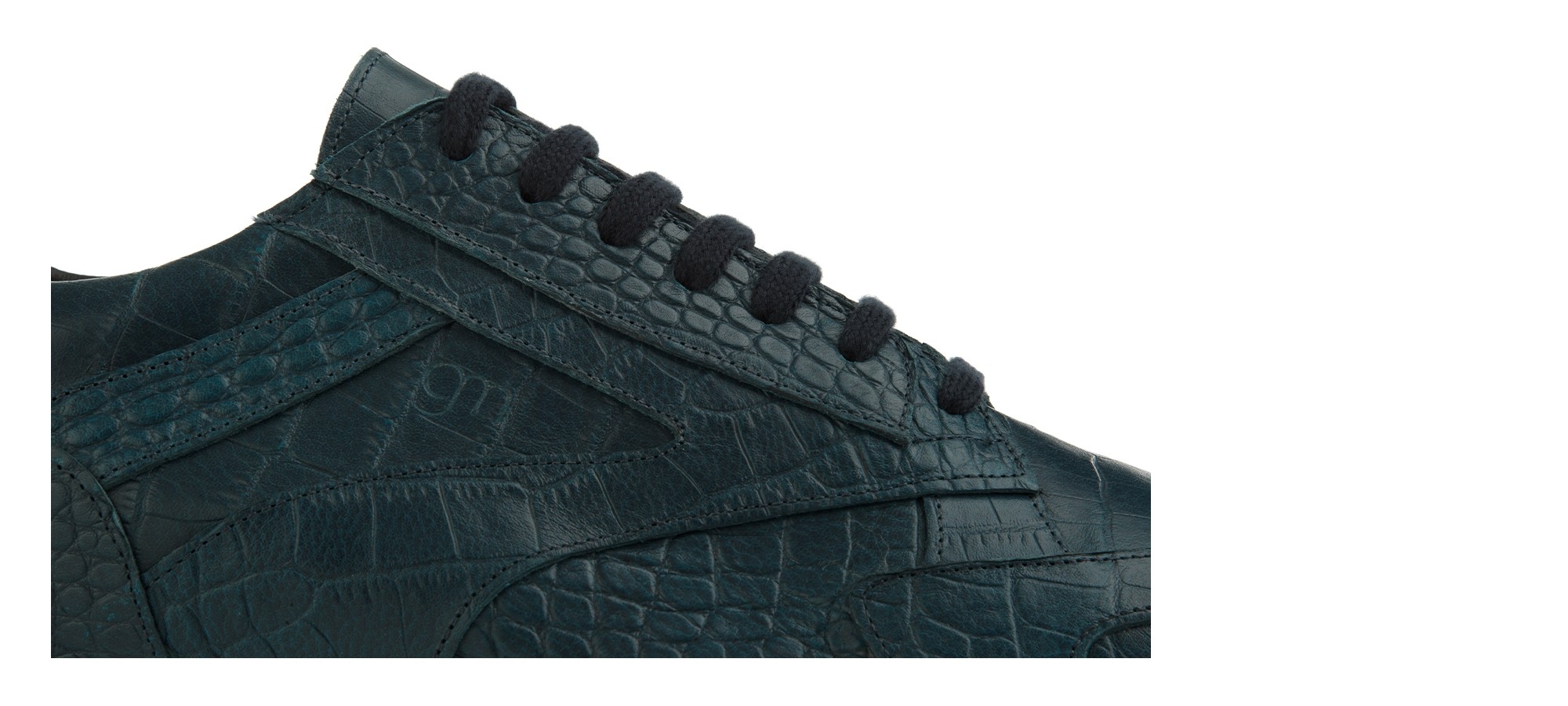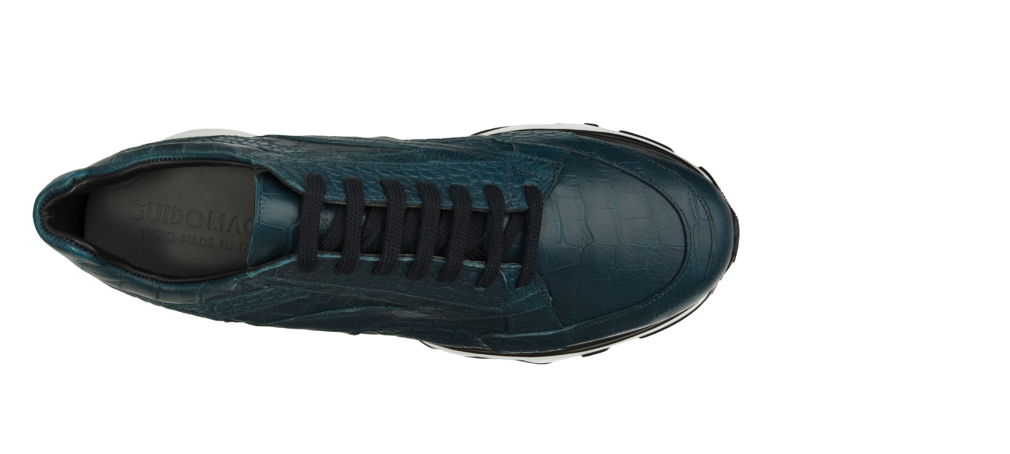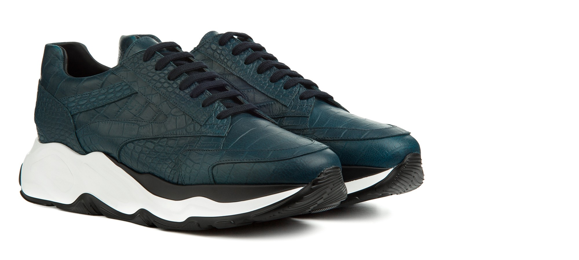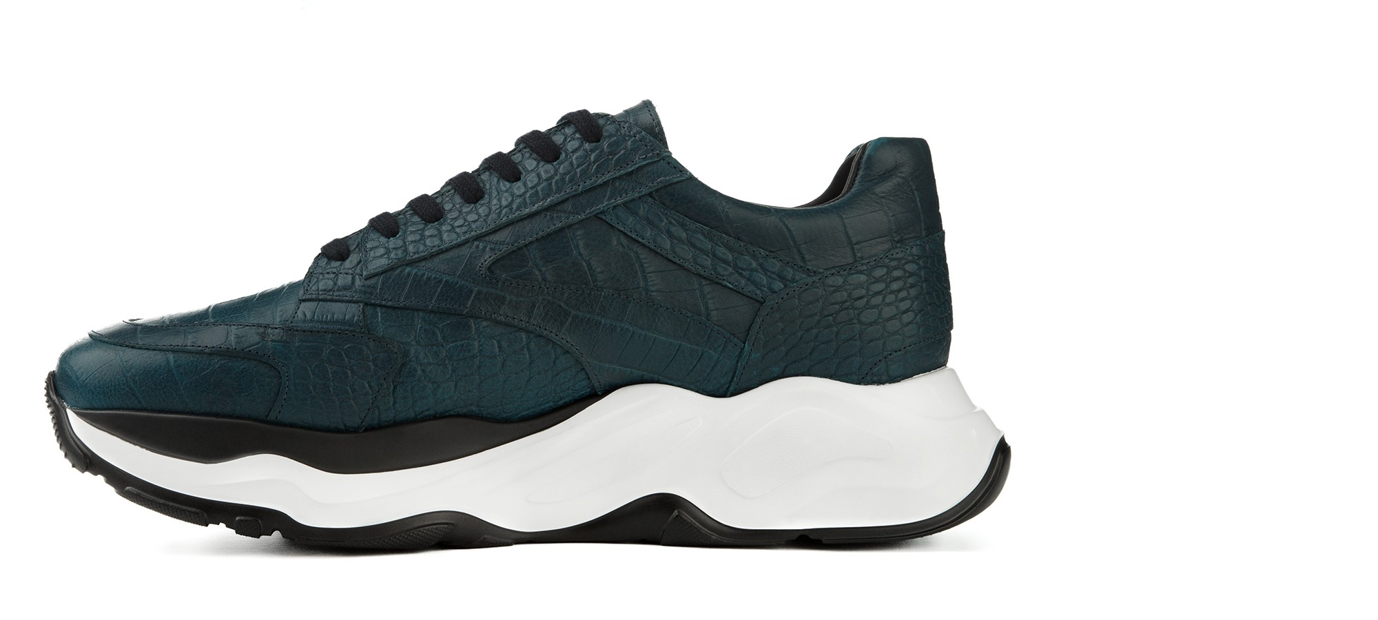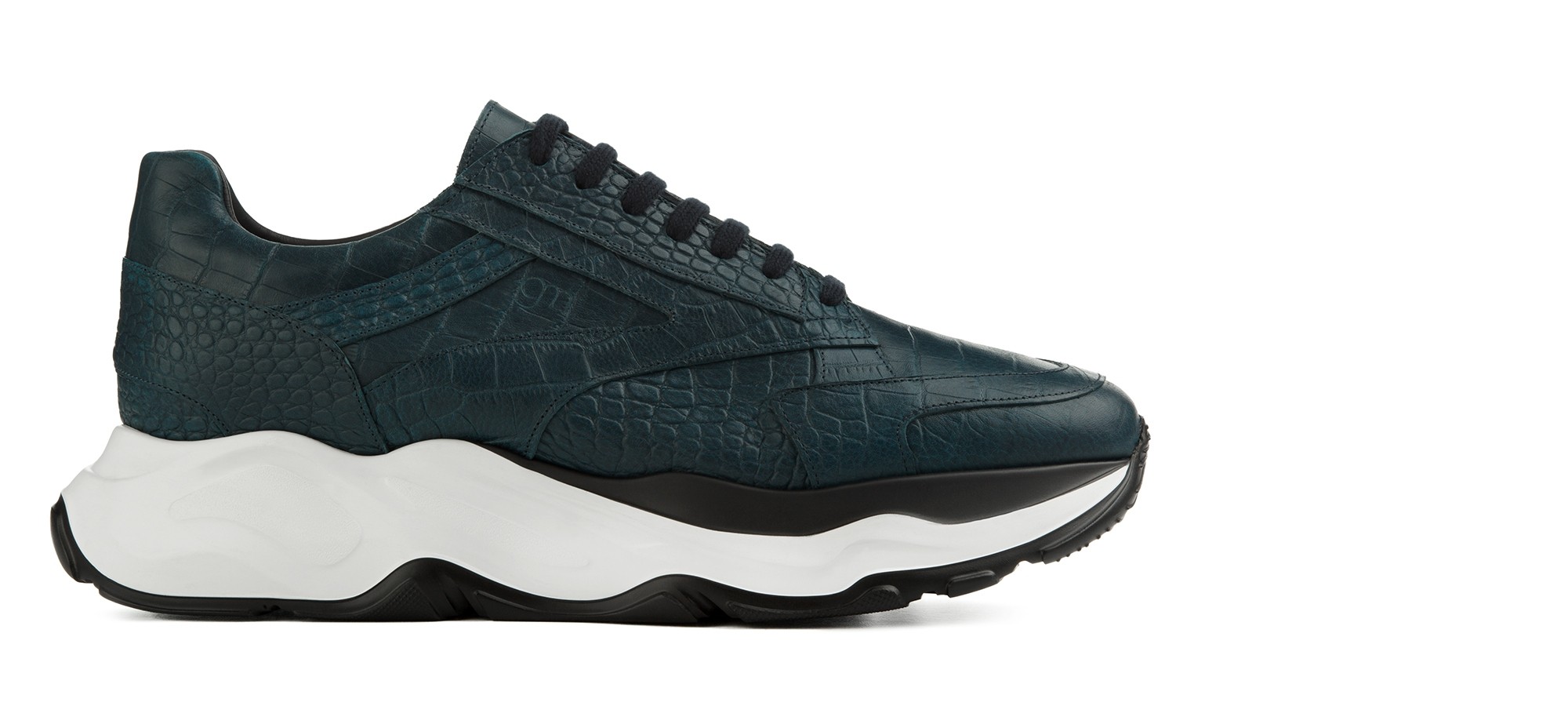 Contemporary-design sneaker with an ultra-light chunky sole, crafted from premium crocodile-effect calf leather in refined shades of blue.