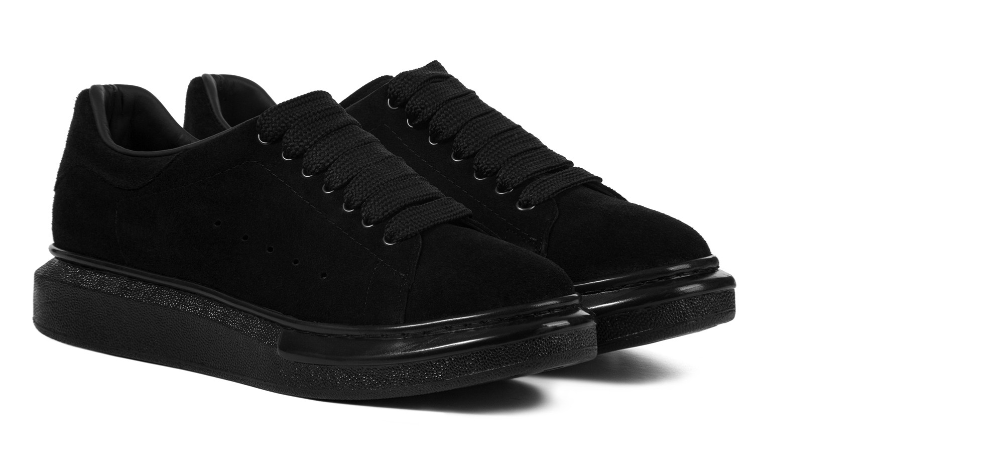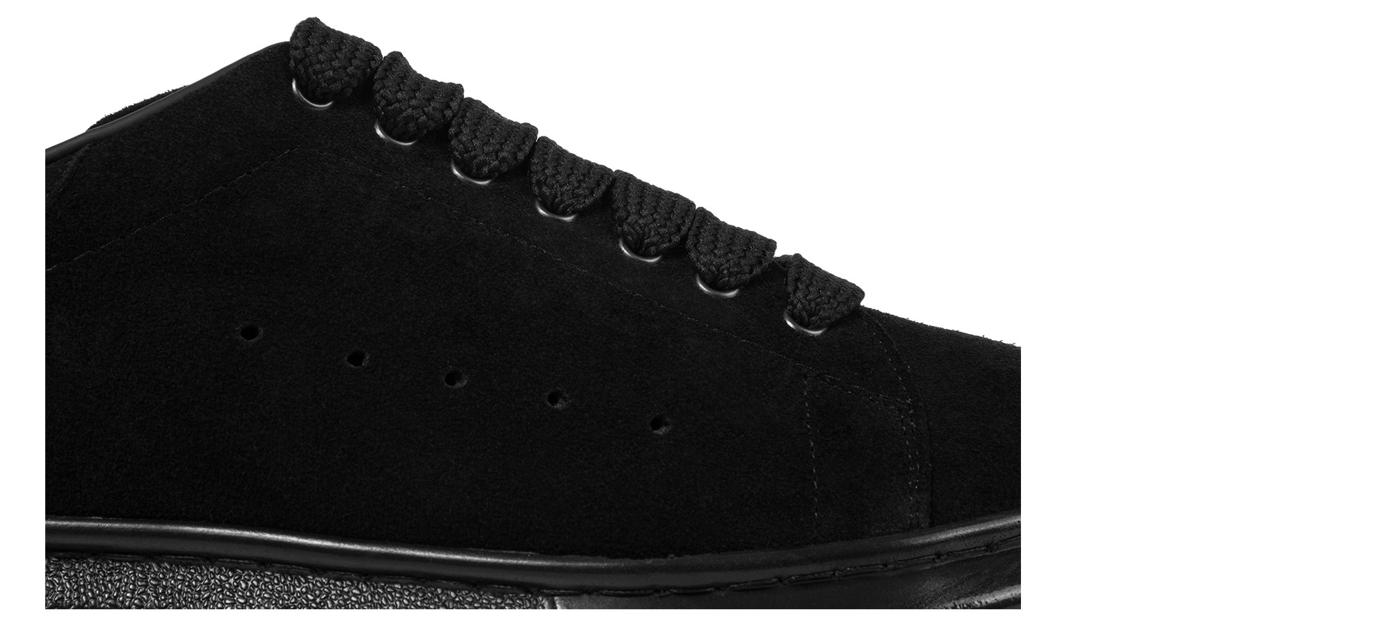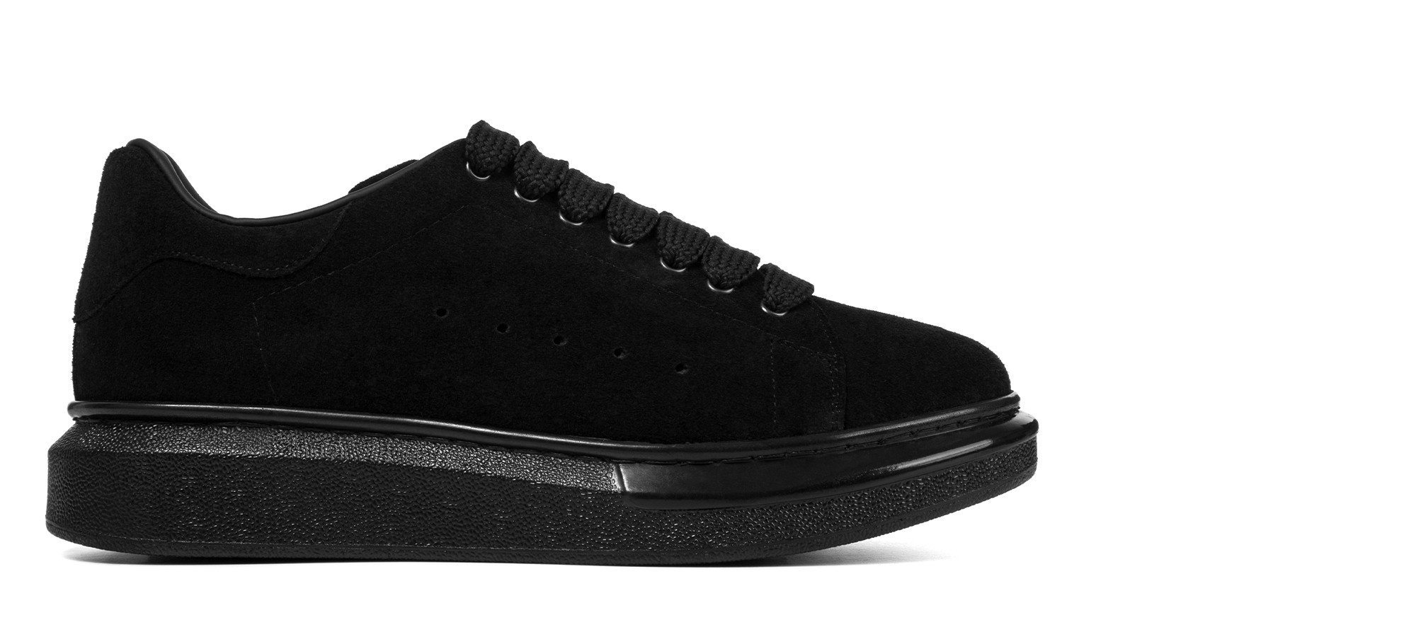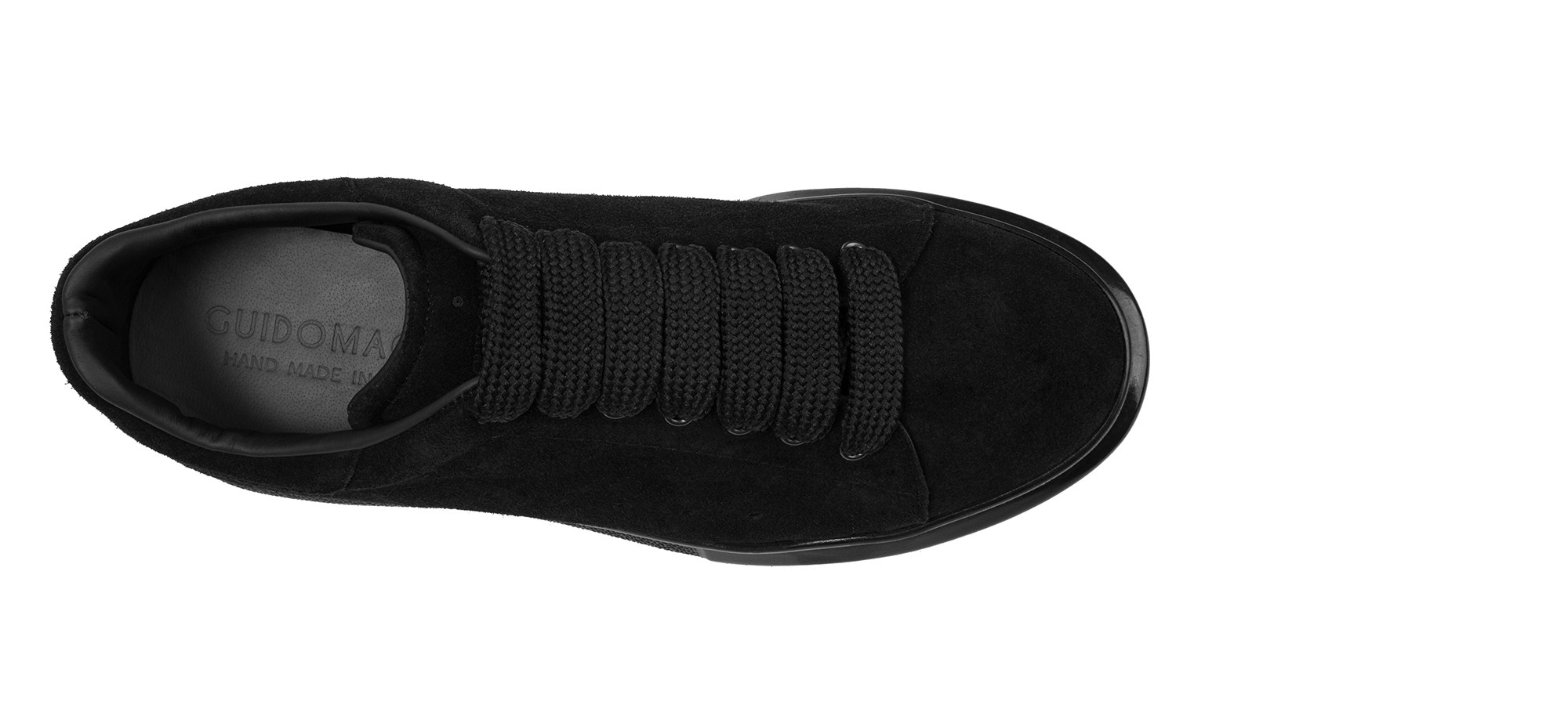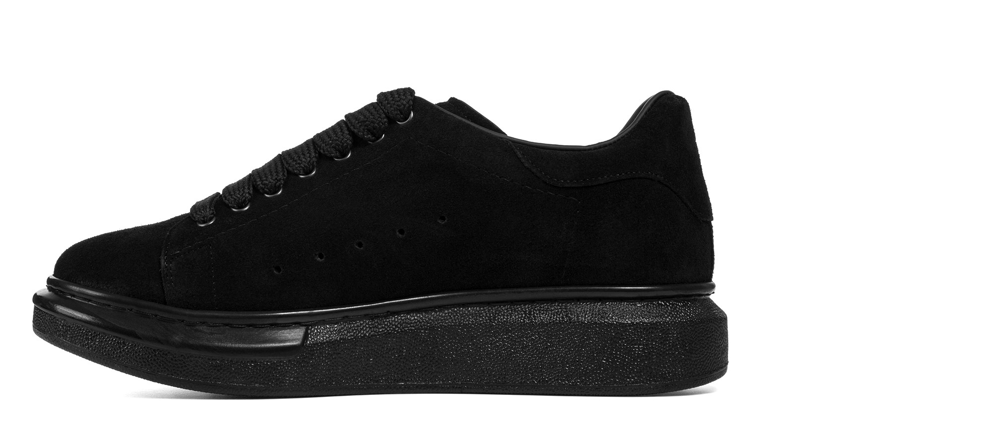 Handcrafted sneaker with a contemporary design featuring a soft black Italian suede upper. This total black model is characterized by a hand-stitched oversize sole that ensures lightweight and exceptional comfort throughout the day. Perfect for any occasion, it combines urban, minimalist style with discreet elegance.