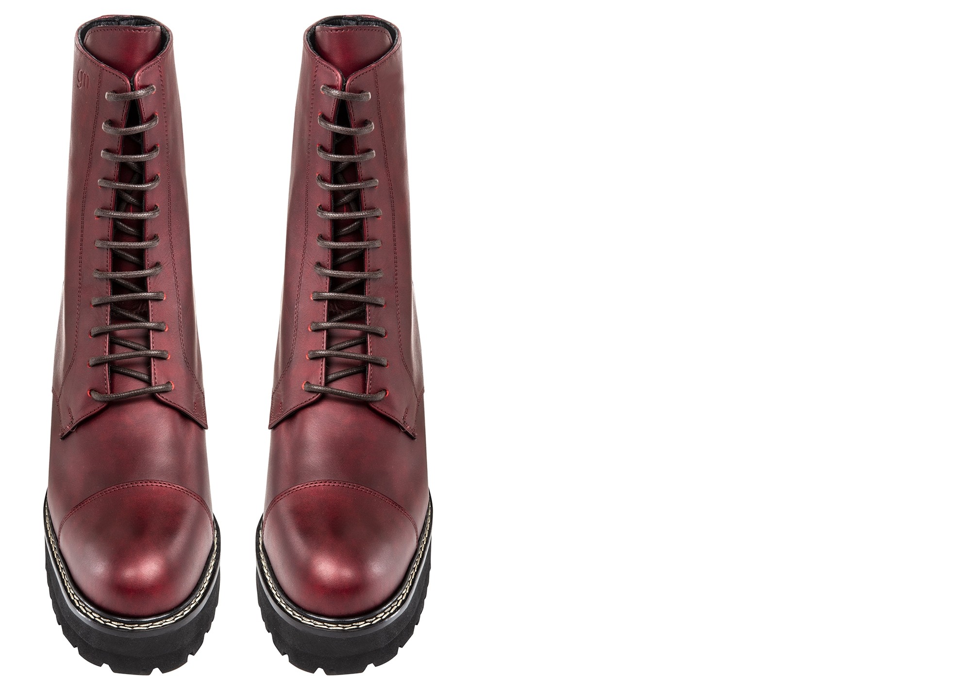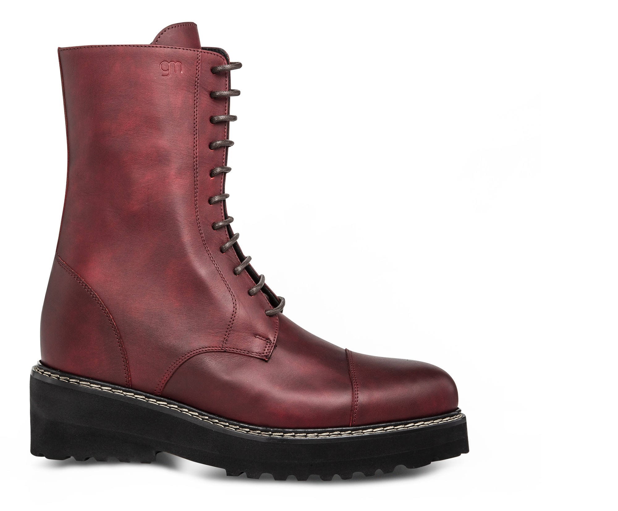Elevator boots with upper in burgundy calf leather and super durable rubber sole with stitching at sight.