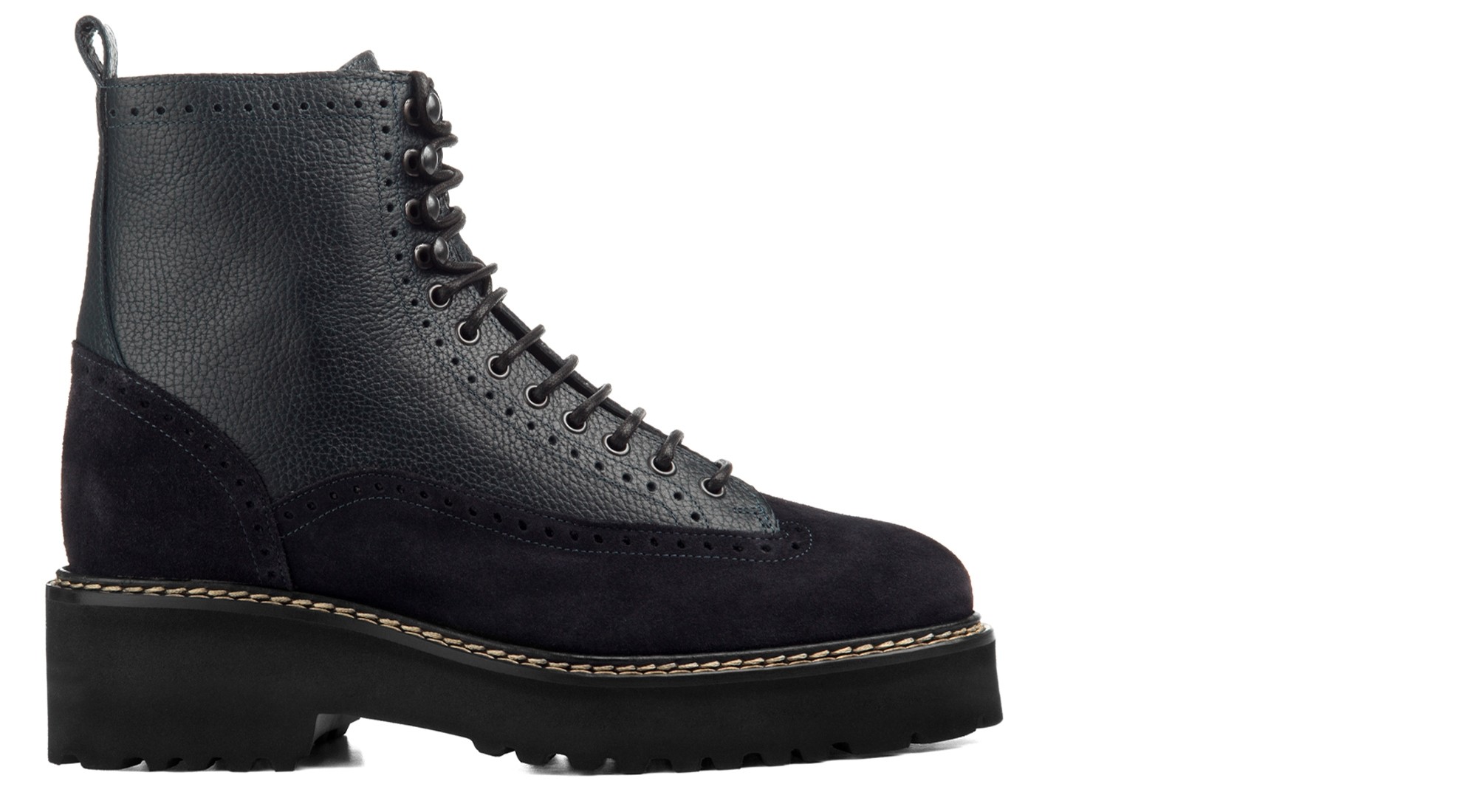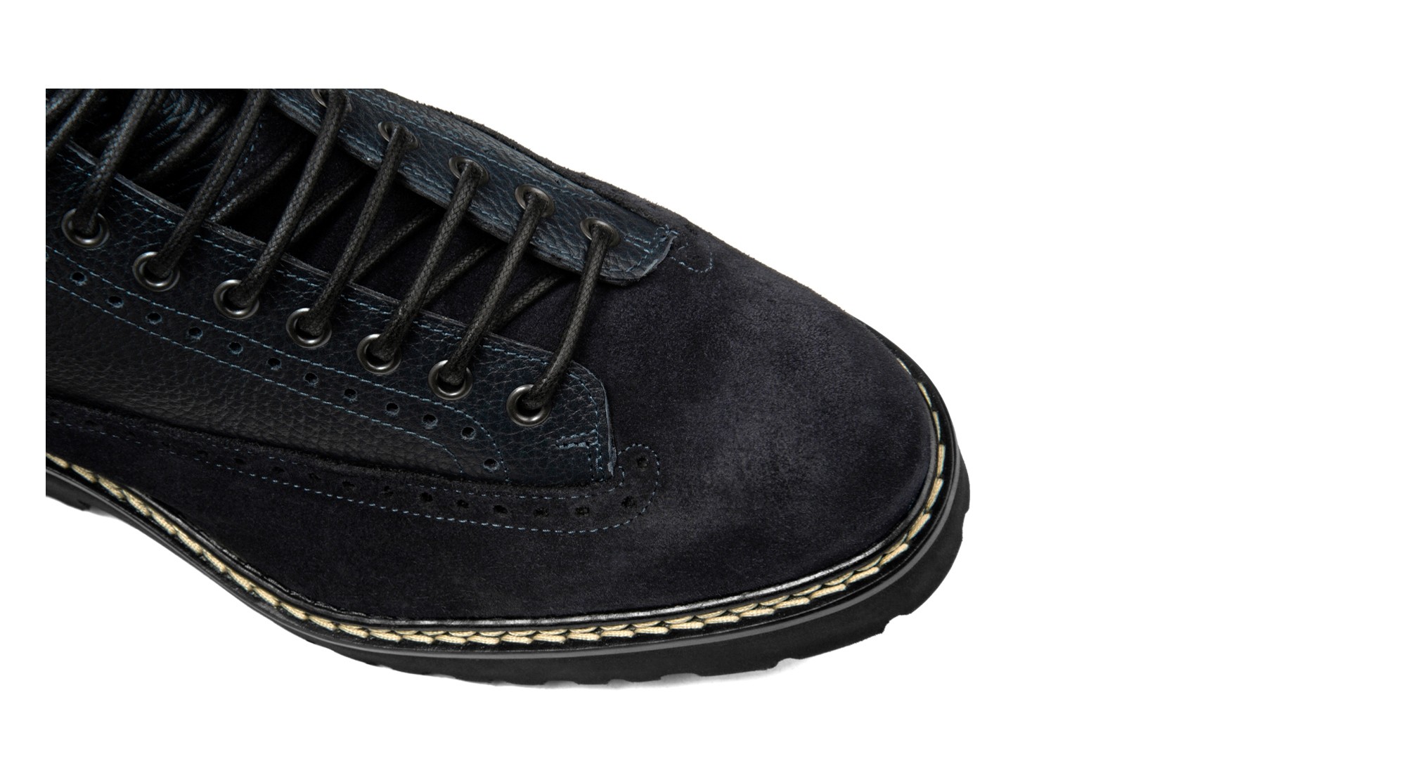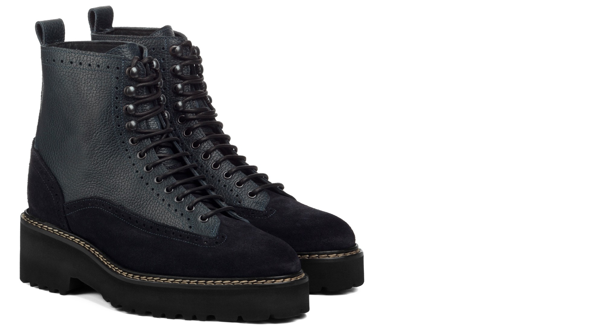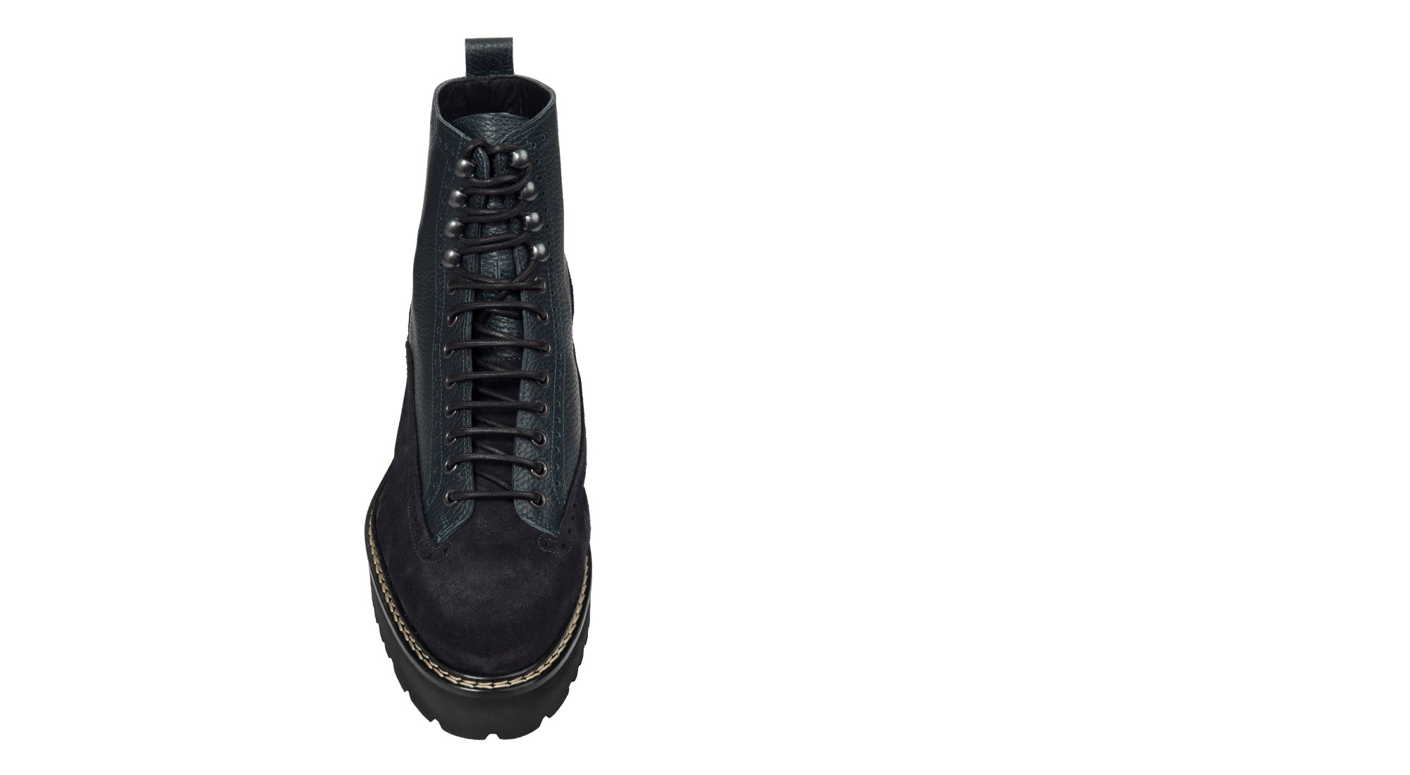 The dark upper made is in blue tumbled calf leather, while the toe cap is in blue suede. The laces end with comfortable hooks that embellish the model. This boot increases height by up to 6 inches (15 centimeters). Handmade in Italy.