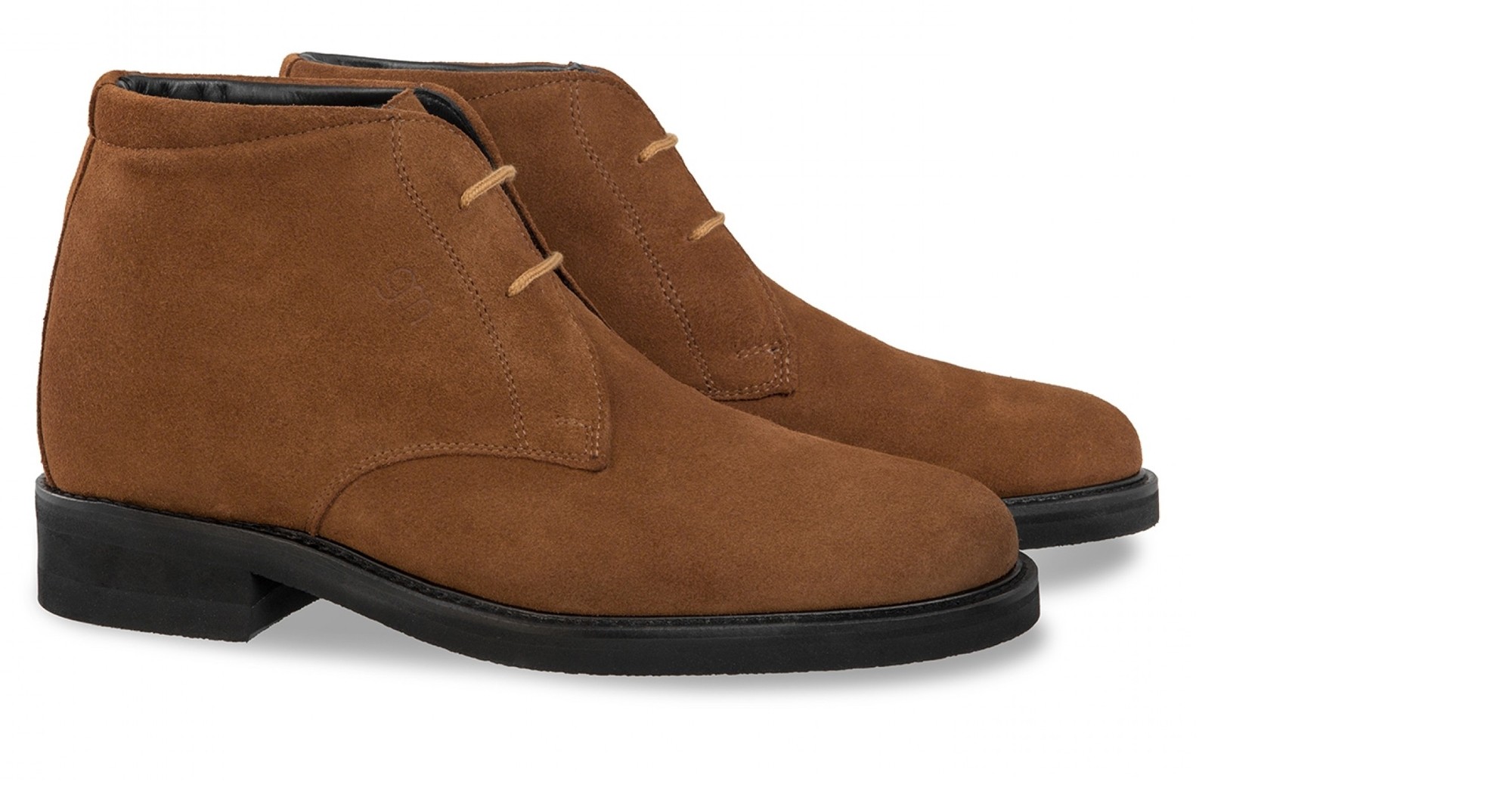 Classic elevator ankle boots handcrafted with upper in soft brown suede calf leather and comfortable Vibram rubber sole.