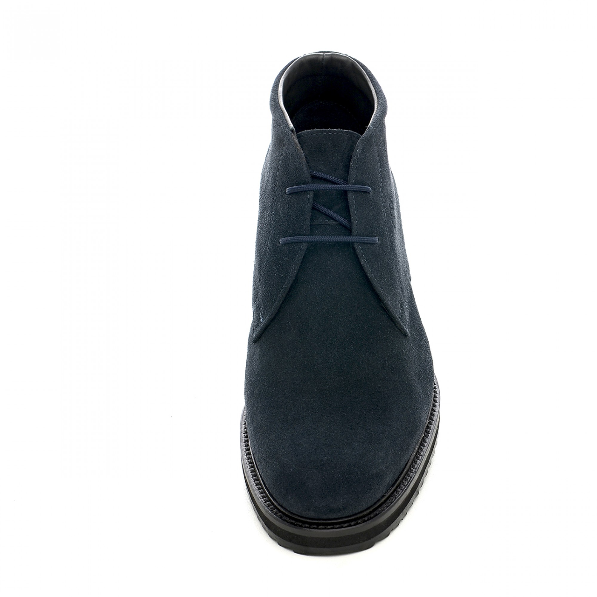 Handmade elevated ankle boots with upper in dark blue suede calf leather and ultra light rubber sole. Featuring a classic design, this shoe is ideal to match with slim-fit trousers, jeans and a blazer. The GM team of artisans and designers allows the possibility to customize the shoe in every detail to make it even more unique.
