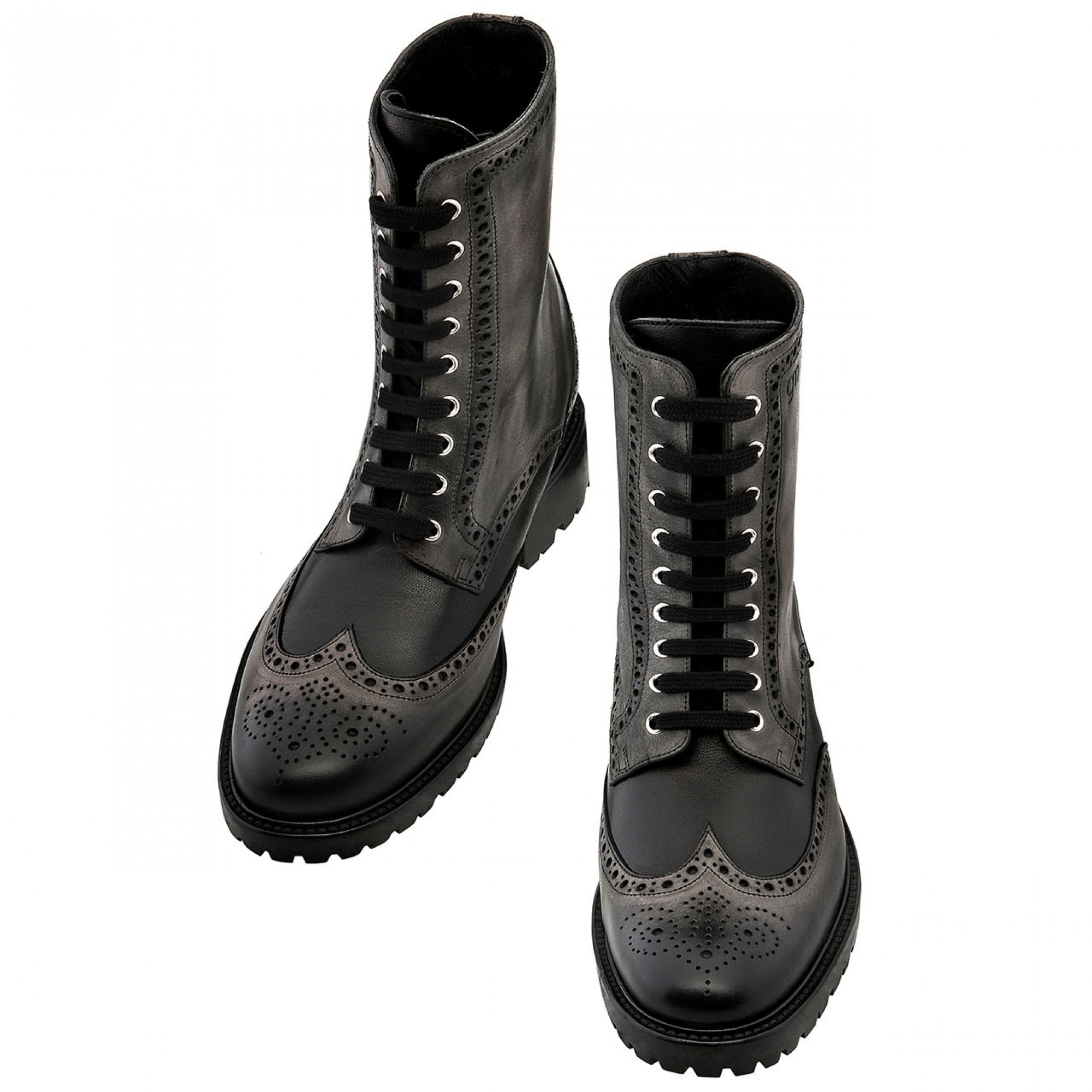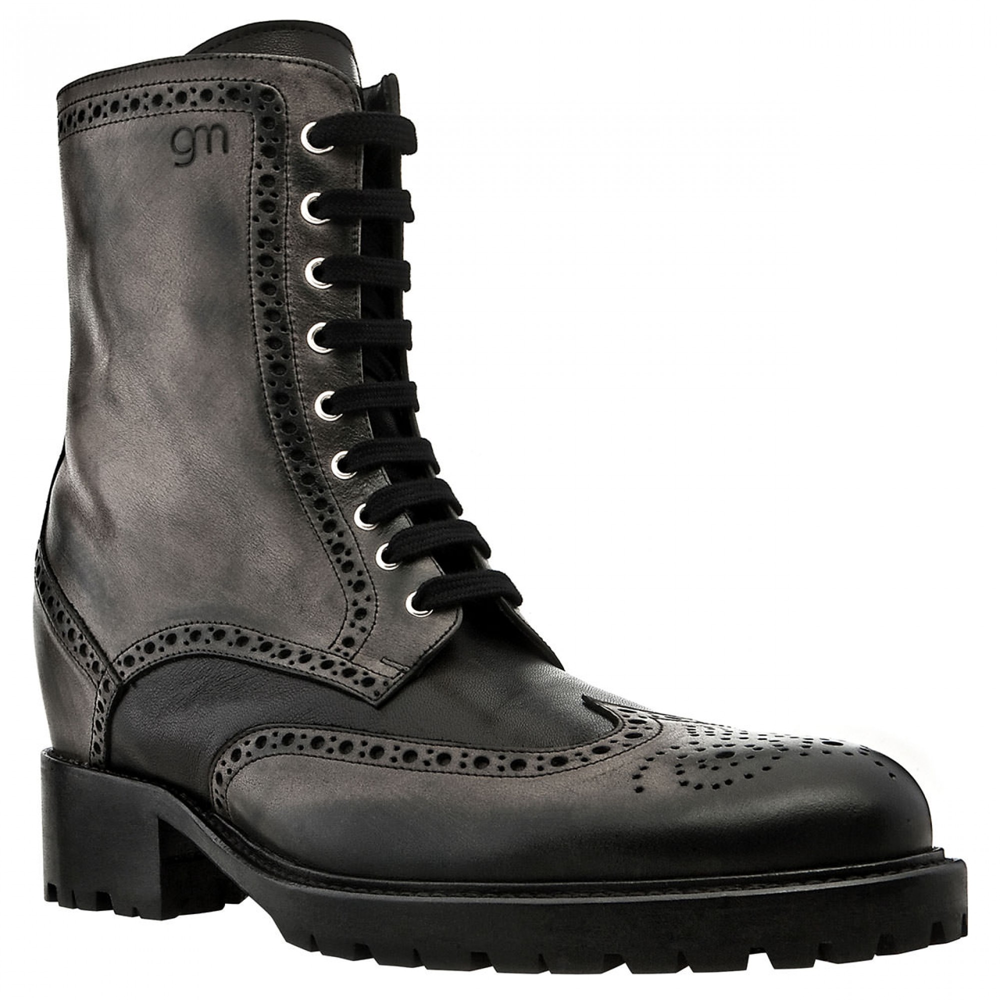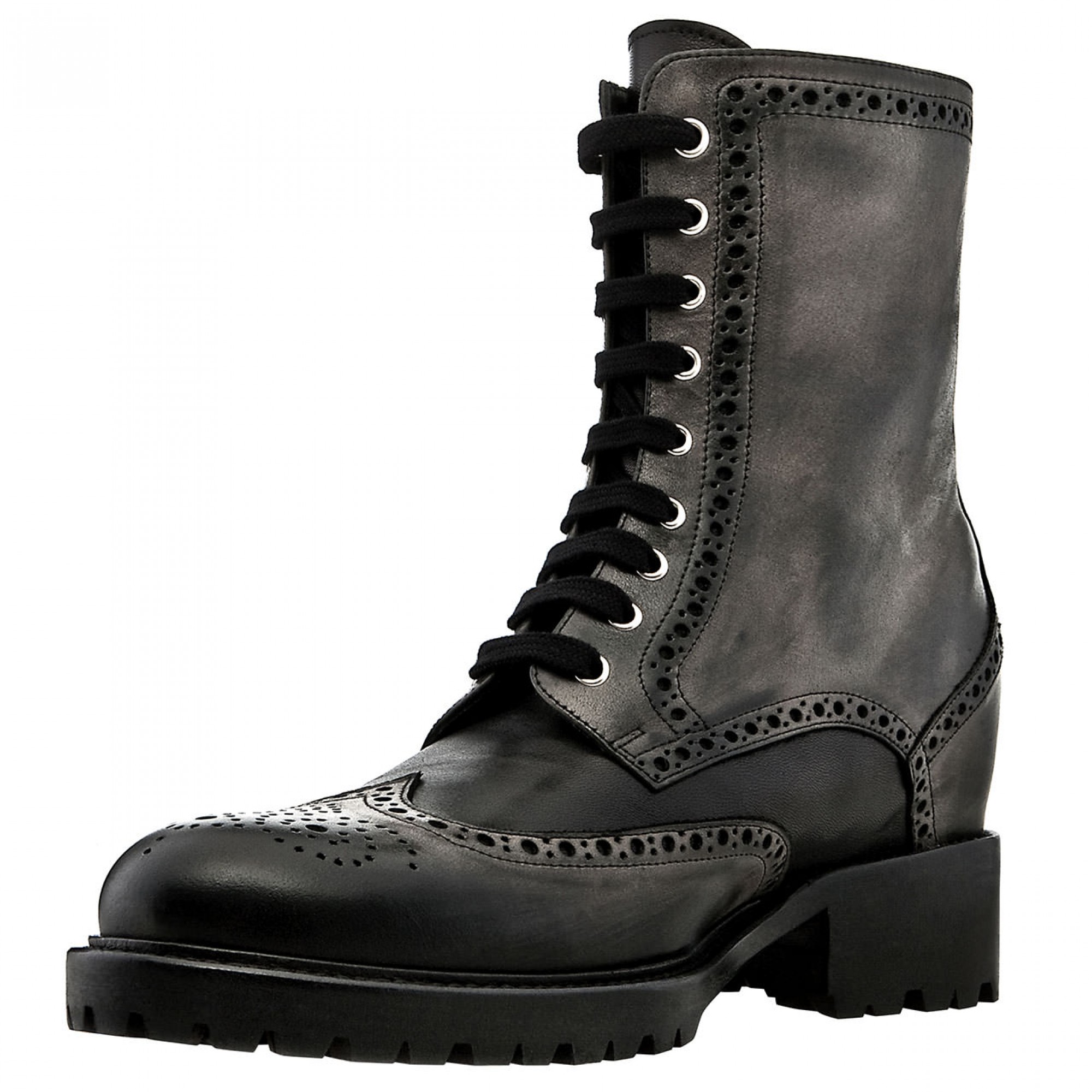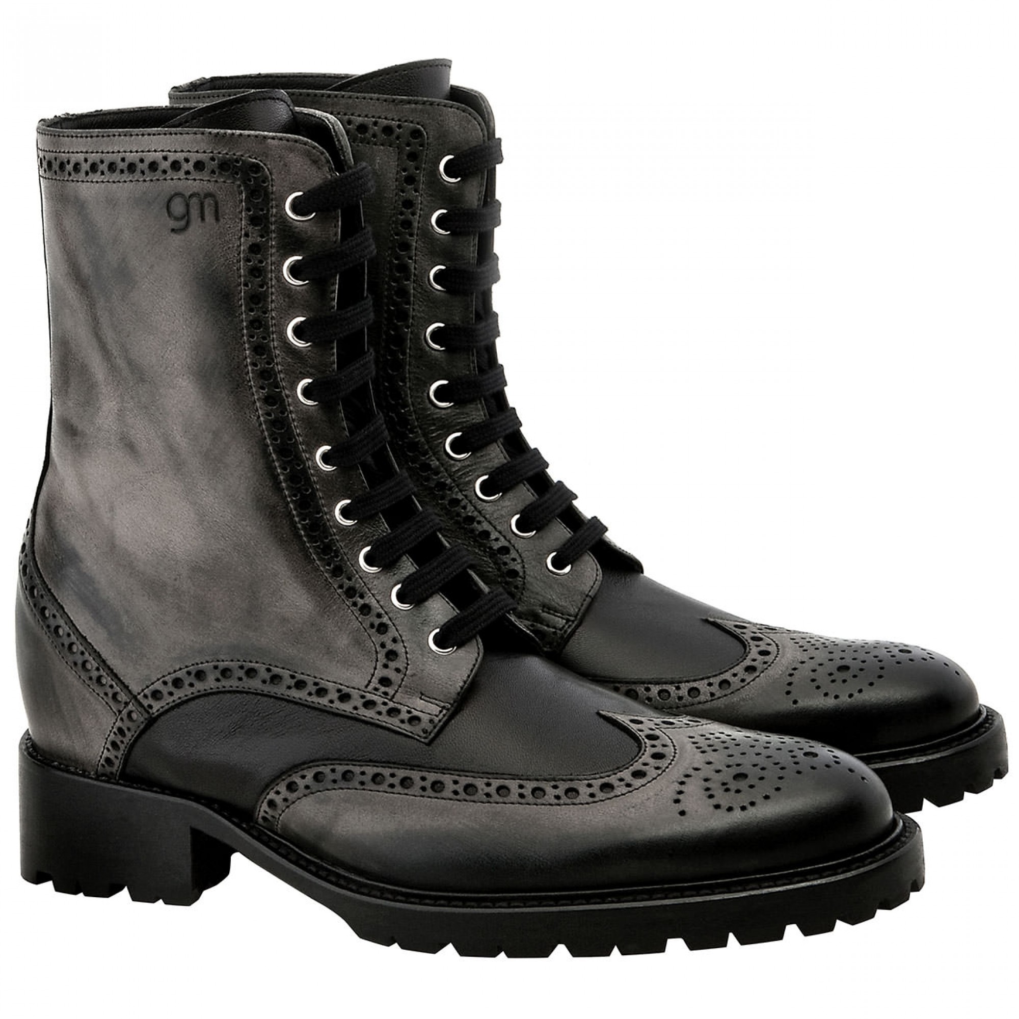 Upper in Black aged look leather with a Nappa leather accent. Full soft leather lining. Upper leather, outsole and midsole are sewn at sight. Insole and midsole in genuine leather. Lightweight lug sole in natural rubber. Cotton waxed shoe laces. Height increase 2.75inches(7cm) or 3.1inches(8cm) or 4 inches(10cm). Hand Made in Italy